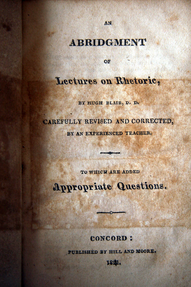 Description An Abridgement of Lectures on Rhetoric by Hugh Blair. Antique leather-bound book published in 1821 by Hill and Moore: Concord. Measures approx. 3 1/2" x 5 3/4". 374 pages. Some cover wear, binding intact, some handwriting inside front cover. Very rare book. Books will be packed securely for safe shipment. Books will ship via USPS Media Mail, unless otherwise requested. If you would like to upgrade to an expedited shipping method, please contact me for a quote. Please view the photos and contact me with any specific questions. A3 **Please contact me with any questions prior to bidding. Check out my other auctions for many more books and other collectibles being offered!** ***Please note: If you are bidding on a used or antique book... We do our best to accurately describe each book and identify any flaws it may have. If you have specific questions regarding its condition, please never hesitate to ask. Unfortunately, we cannot always inspect each page, and therefore grading is from visual inspection and browsing through the book. Unless stated otherwise, our books will contain signs of wear and age which is normal within this category. We offer primarily used, vintage and antique books. Our books are stored in a dry, 100% smoke-free environment . We will always mention if a book has a noticeably unpleasant odor, however if you have a particularly sensitive sense of smell, we cannot recommend that you purchase any antique or vintage books. Payment Paypal Accepted. Shipping FREE anywhere in the U.S. **Sorry, no international shipping for this item.** Return Policy We consider All Sales to be Final. Returns Accepted for Full Refund of Purchase Price only if Item is Significantly Not as Described. Shipping & Handling costs will not be refunded under any circumstances. Please be sure that this is the item you are looking for prior to bidding. If you have any questions about the content of an item, condition of an item or a question about any of our policies please do not hesitate to ask. Feedback Feedback will be posted once feedback has been posted for us. If you were pleased with your purchase and experience with us please leave a comment. We will do likewise right away.