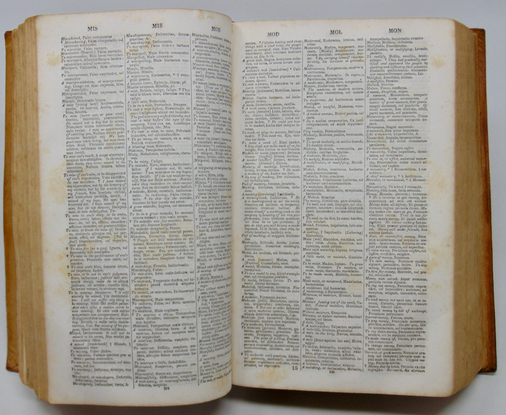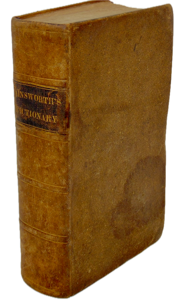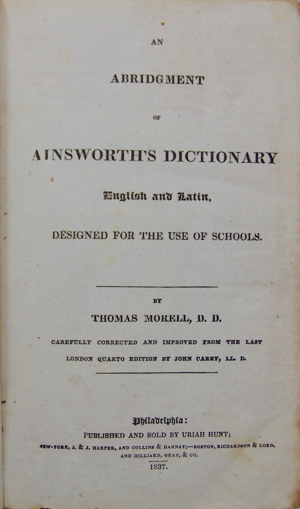 Morell, Thomas. An Abridgment of Ainsworth's Dictionary, English and Latin, designed for the use of Schools . Philadelphia: Uriah Hunt, 1837. [10802] Full brown leather with black leather spine title label, binding with a few stains yet very good with no cracks or damage, 8 3/4 x 5 3/4 inches. Contemporary small peach color paper label inside front cover, "Sold by G. Tracy, Utica." 1028 pages, light foxing, one leaf with horizontal tear; front and back free end papers (blanks) torn with loss. Good. Hardcover. "Carefully corrected and improved from the last London quarto edition by John Carey, LL. D....Stereotyped by B. & J. Collins, N. Y." This corrected edition by John Carey (1756-1826) was first published in 1816. Carey was an Irish classical scholar, the brother of Mathew Carey, the Philadelphia publisher. Thomas Morell, D.D. (1703-1784), English classical scholar, educated at Eton College and King's College, Cambridge. He was an accomplished librettist, collaborating with Handel on at least six of his oratorios, of which collaboration Morell wrote a detailed account. Robert Ainsworth (1660-1743), English Latin lexicographer; he worked for twenty years compiling his Dictionary of the Latin Tongue. Improved editions were made my Samuel Patrick, John Ward, William Young, Isaac Kimber, and Thomas Morell. Additional abridgements or improved versions were published in the late 18th and early 19th centuries.