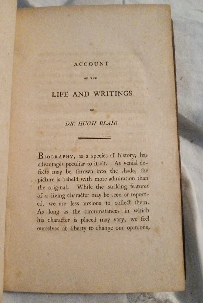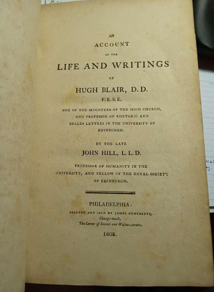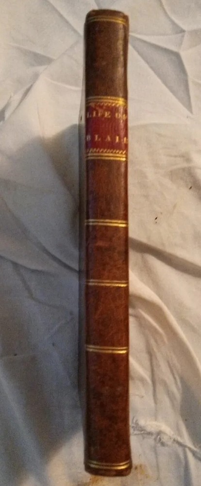 An Account of the Life and Writings of Hugh Blair, D. D., One of the Ministers of the High Church, and Professor of Rhetoric and Belles Letters in the University of Edinburgh. by the late John Hill. Philadelphia: James Humphreys, 1808. [ByFirst American edition]. Full leather, 8&1/2 x 5 inches. 229 pages. Quaint old library label, "Social Library, in Brooklyn" pasted to inside of front cover. No other library markings. Hugh Blair lived from 1718 to 1800. Very good condition: occasional foxing; covers are slightly sprung.