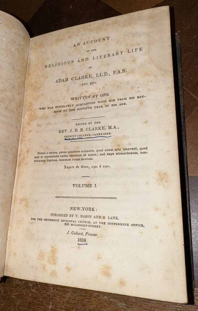 This is a rare and valuable leather book from 1839 titled "An Account of the Religious and Literary Life of Adam Clarke." The book offers a fascinating insight into the life of Clarke, a prominent figure in the fields of religion and literature during his time. With its original facsimile and binding intact, this book is a must-have for collectors of antiquarian and collectible books. Its subject matter is in the field of Biography & Autobiography with a topic of Literary, and it is a great addition to any literary collection.