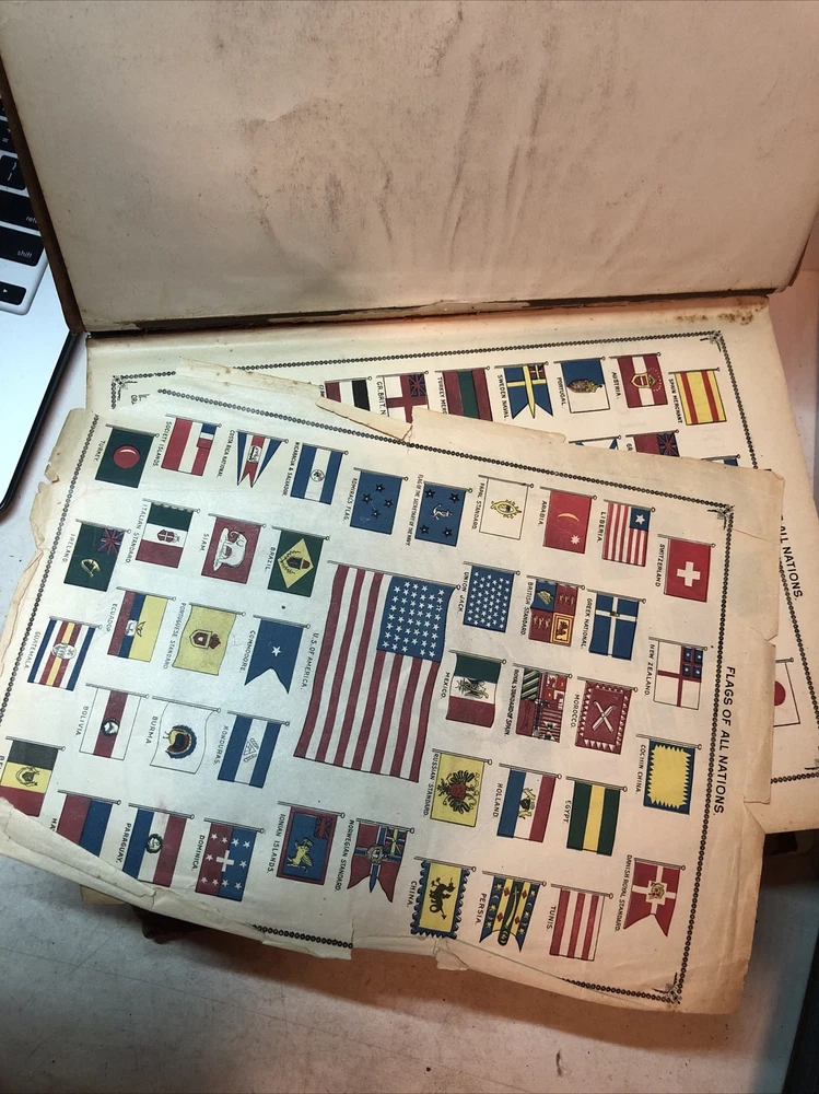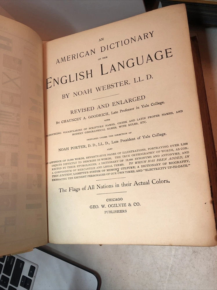 This is a rare edition of Noah Webster's "An American Dictionary of the English Language" from 1900. This dictionary features a leather binding, published by Geo. W. Ogilvie & Co. in Chicago, and includes special attributes such as flags of all nations in color. The dictionary is in its original form and was printed in 1900, making it a valuable addition to any collection. It is a great reference book for anyone interested in the English language and American history. Please see photos for a further description of the condition of this item. Binding is strong minus one page that has become loose as shown in one of my photos (page of flags in color). I have not found any other copy of this particular dictionary online after much effort, so I consider this particular copy to be extremely rare.