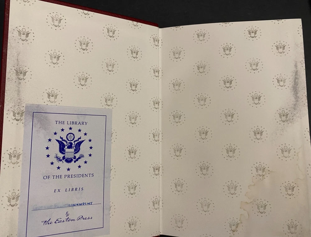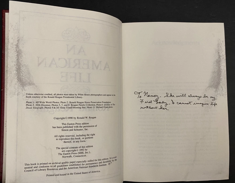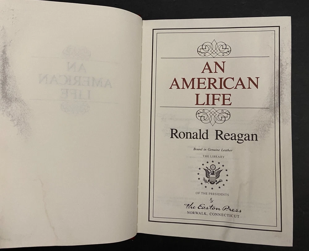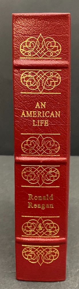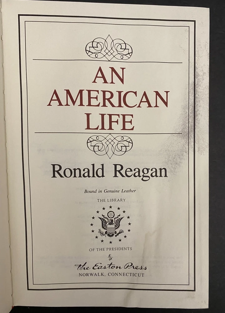 An American Life by Ronald Reagan, Water Damaged Part of the Library of the Presidents collection of The Easton Press, Norwalk, Connecticut, 1992. This book is in fair condition. The book is warped and the gilding on the page ends are damaged. Previous owner's book plate is attached to the front free end paper. The pages throughout the book are damp stained. Includes Collector's Notes. The Easton Press books are bound in genuine leather binding, with 22kt gold accents and hubbed spines, gilded page ends, acid-neutral paper, and evocative illustrations and decorations. We will be happy to combine shipping, wherever possible. Some items cannot be combined because of their size, weight or because they are fragile. Please ask if you have any questions. Your order will ship by the next business day after receiving payment. All items are from a smoke-free environment. Thank you, and Happy Reading!