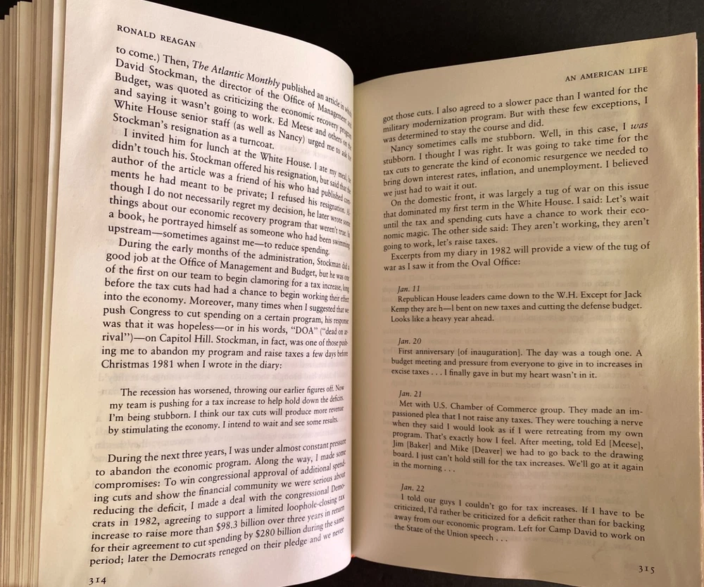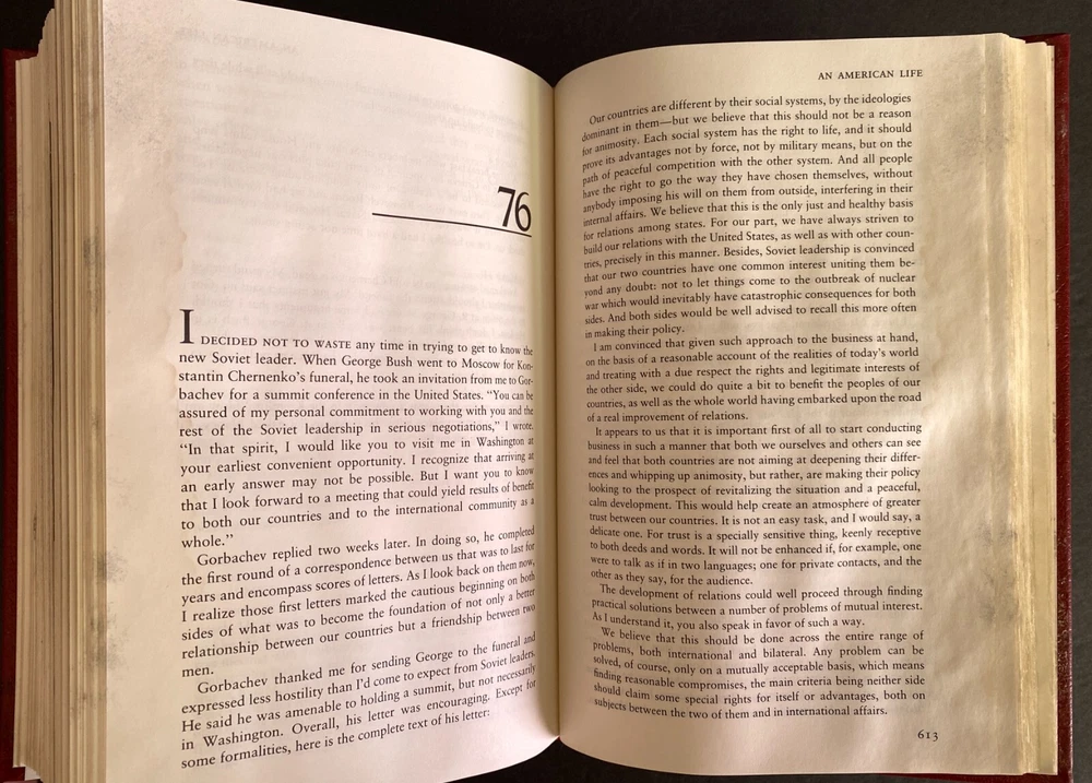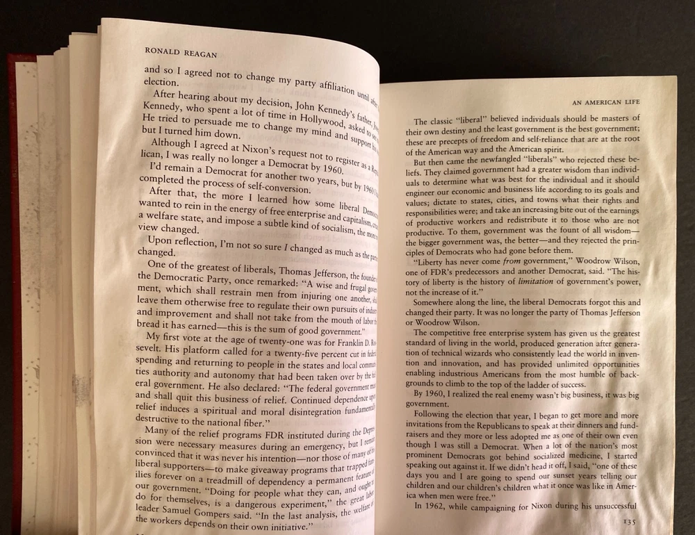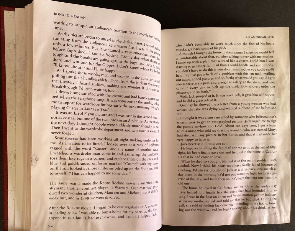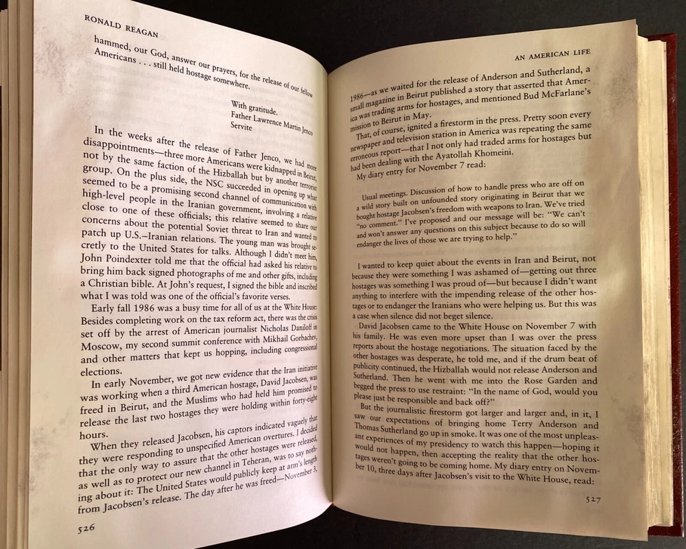 An American Life by Ronald Reagan, Water Damaged Part of the Library of the Presidents collection of The Easton Press, Norwalk, Connecticut, 1992. This book is in fair condition. The book is warped and the gilding on the page ends are damaged. Previous owner's book plate is attached to the front free end paper. The pages throughout the book are damp stained. Includes Collector's Notes. The Easton Press books are bound in genuine leather binding, with 22kt gold accents and hubbed spines, gilded page ends, acid-neutral paper, and evocative illustrations and decorations. We will be happy to combine shipping, wherever possible. Some items cannot be combined because of their size, weight or because they are fragile. Please ask if you have any questions. Your order will ship by the next business day after receiving payment. All items are from a smoke-free environment. Thank you, and Happy Reading!