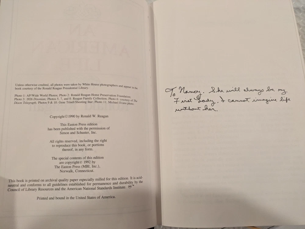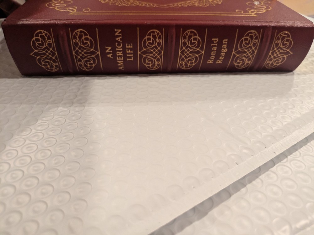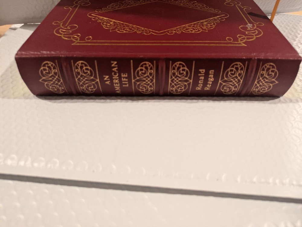 "An American Life" by Ronald Reagan, published by Easton Press in 1992, is a special edition leather book from the Library of Presidents series. This biography and autobiography of the 40th President of the United States is a valuable addition to any historical collection. The genuine leather binding, ribbon bookmark, and unique special attributes make this a coveted item for collectors and history enthusiasts alike. This edition, printed in English in Connecticut, is a timeless piece that showcases the life and legacy of Ronald Reagan in English in a luxurious and sophisticated format.