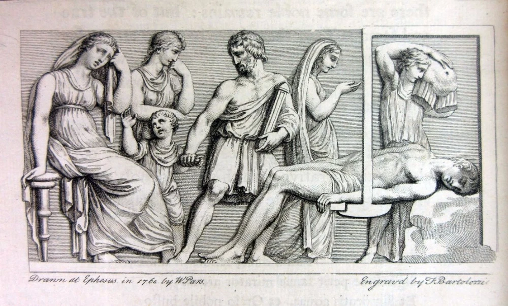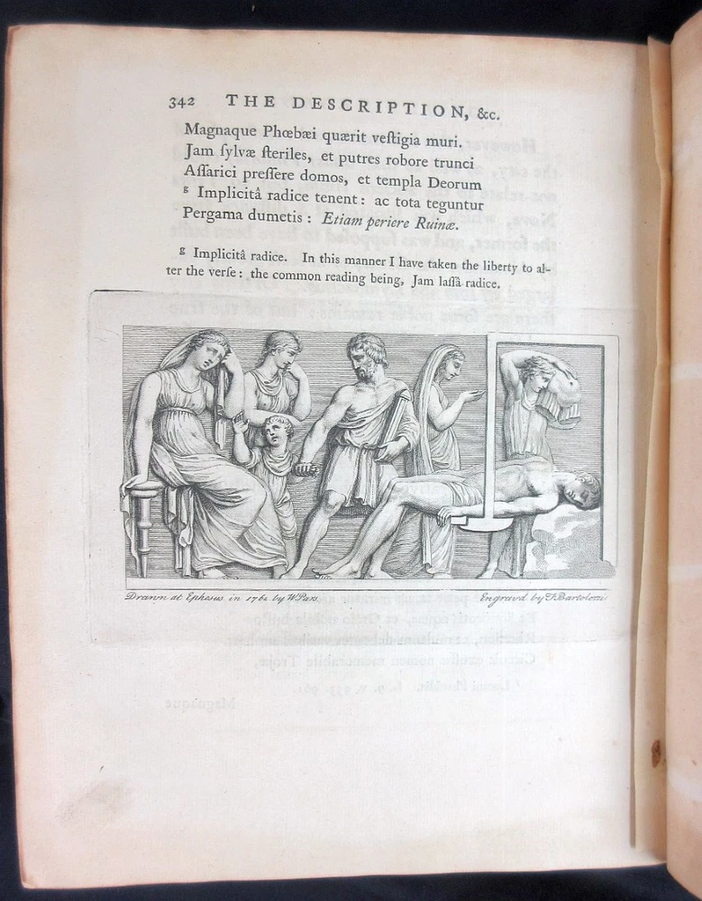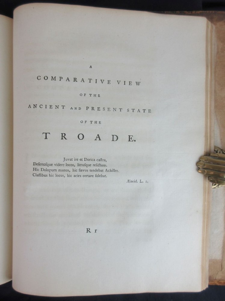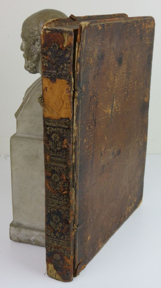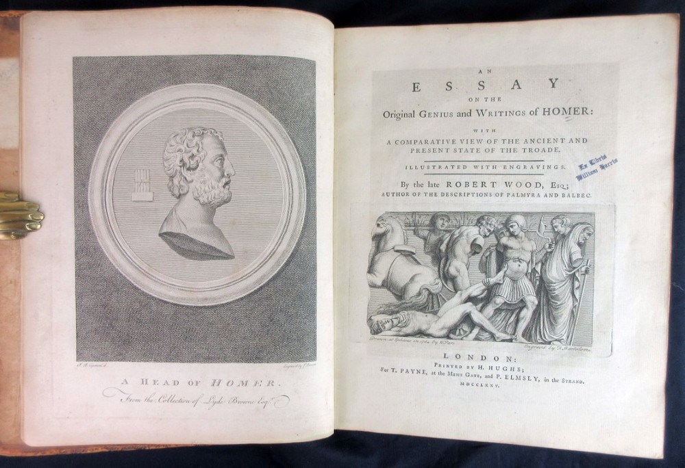 An Essay on the Original Genius and Writings of Homer, with a Comparative View of the Ancient and Present State of the Troade Wood, Robert (1717-1771) London Printed By H. Hughs for T. Payne and P. Elmsly 1775 Leather 4to 11" - 13" tall Xv, 342 pp. Engraved portrait frontis, folding map, 3 plates (1 folding) (possibly after G. B. Borra) , title vignette and tail piece engraved by Bartolozzi. Lacking the half title. The section on the Troade has a half title page but pagination is continuous. Large quarto in contemporary calf with gilt rulling. Both boards detached, corners rubbed and worn, floriated gilt spine is chipped top and bottom and spine label is gone. Interior end papers are aged darkened, owner name on inside front board, and a different owner name stamped on title page. Some offsetting to plates and vignettes, occasional foxing and a few very minor stains, otherwise clean and unmarked. A faint mellow smell of old pipe. The first edition containing the Comparative View of the Troade. ESTCT137529 We have been selling books for over 30 years and pack and ship with care. For our non-US international customers: Import duties, taxes and charges are not included in the item price or shipping charges. These charges are the buyer's responsibility. Please check with your country's customs office to determine what these additional costs will be prior to bidding/buying. These charges are normally collected by the delivering freight (shipping) company or when you pick the item up -- do not confuse them with additional shipping charges. We really cannot show merchandise below value or mark items as "gifts" - it can get us into all kinds of trouble with customs. For US customers: So far, the new US tariffs have not affected books or antiquarian books. We do have to provide additional paperwork to ship into the US, but there should be no additional charges for you as a result of the current tariffs. Thanks for bidding and thanks for being a fellow book lover. See our other listings for more unusual and rare books.
