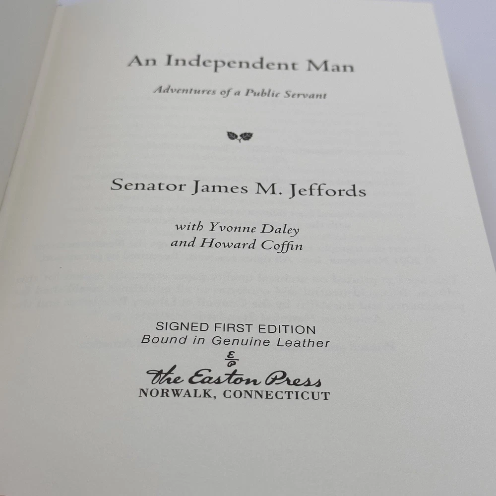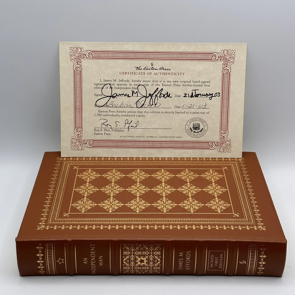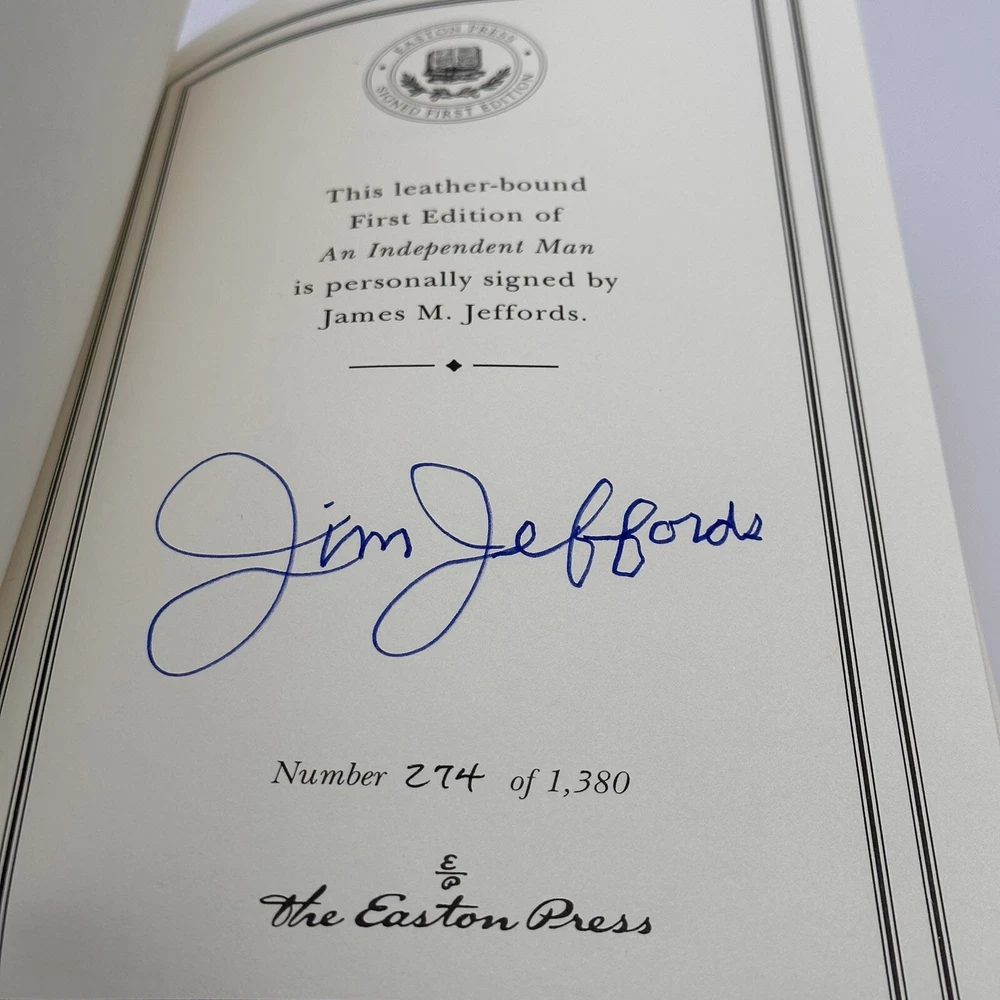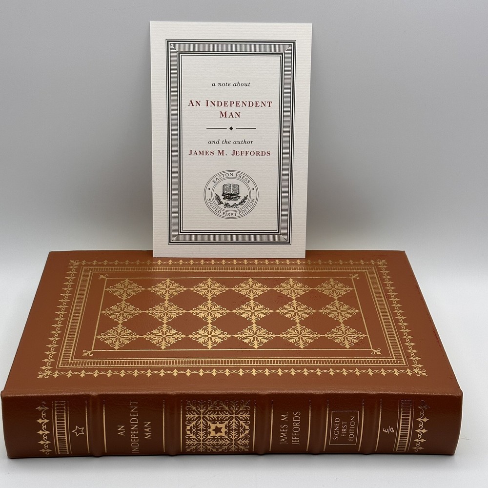 An Independent Man / Easton Press / James M. Jeffords / Signed / 1st Ed. / #274. FREE SHIPPING. Shipped via USPS Media Mail. Good condition. The front cover has scattered patches of red leather color transfer from another book it was touching. Also present is a discoloration and dent on the front cover edge (See Photos).
