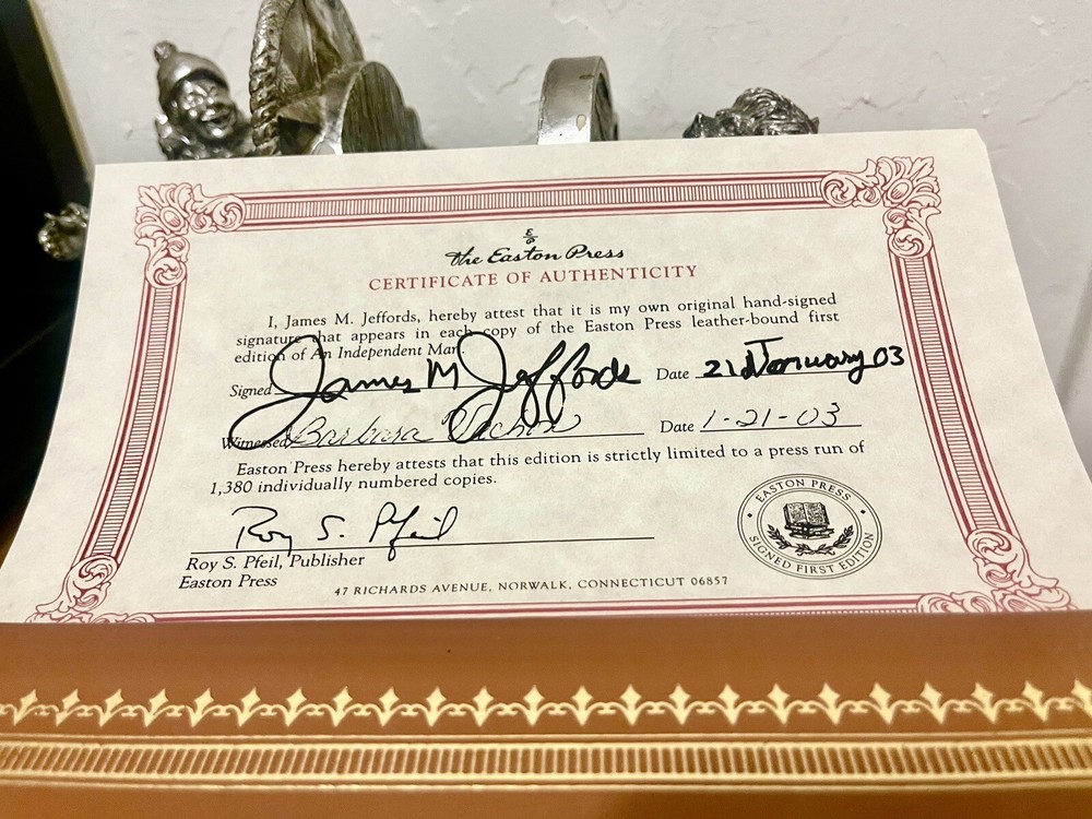This collector's edition of "An Independent Man" by James M. Jeffords, published by Easton Press in 2003, is a true gem for any avid book collector. With its beautiful leather binding and numbered edition of #274, it's a rare and valuable addition to any library. The book is a compelling memoir on the life of James M. Jeffords, an American politician and senator. It's written in English and comes with special attributes such as it being a limited edition, signed by the author himself, and a first edition. This unit is in excellent shape and has been well-maintained.