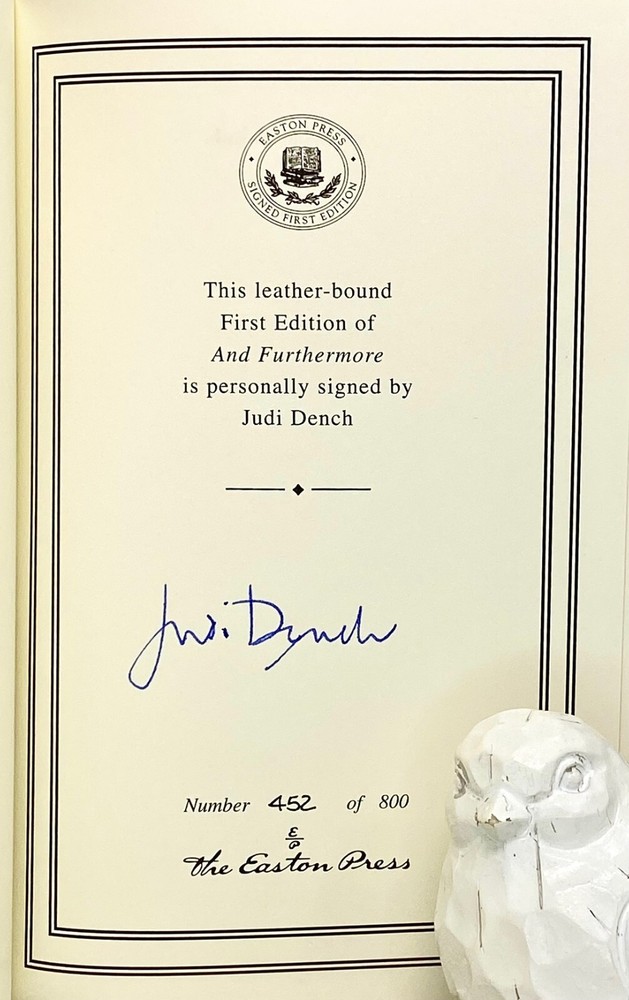 And Furthermore Signed by Judi Dench Easton Press First Edition Condition and Terms This book is in excellent never read, preowned condition. There are no attached bookplates, embossed seals, or other owner-marks to the interior. Sharp corners, no conspicuous scuffs or rubs. There are little to no scratches/marks to the gilded page-edging (see photos). Please see the photographs for best description. Please review all photos carefully before purchasing, and feel free to ask questions if the photos do not suffice. Additional photos can be provided upon request. Returns are only allowed due to shipping damage or item not being as described. Due to USPS insurance claims procedures, partial refunds are not allowed due to shipping damage. Items damaged in shipping must be returned in the original packaging as received. The USPS requires inspection of the packaging and item damaged. Synopsis From the moment Judi Dench appeared as a teenager in the York Mystery Plays it was clear that acting would be her career. Here she tells her story.