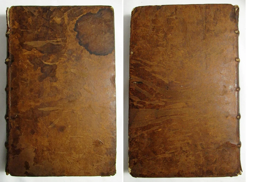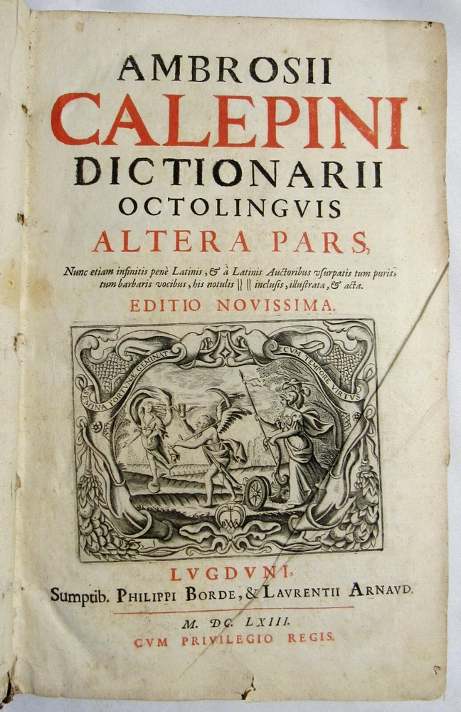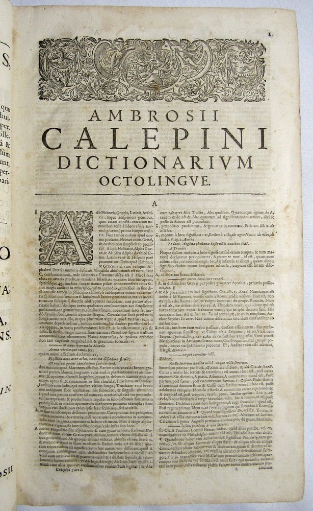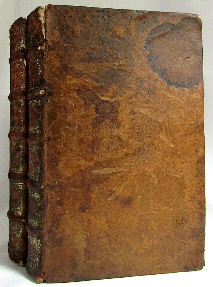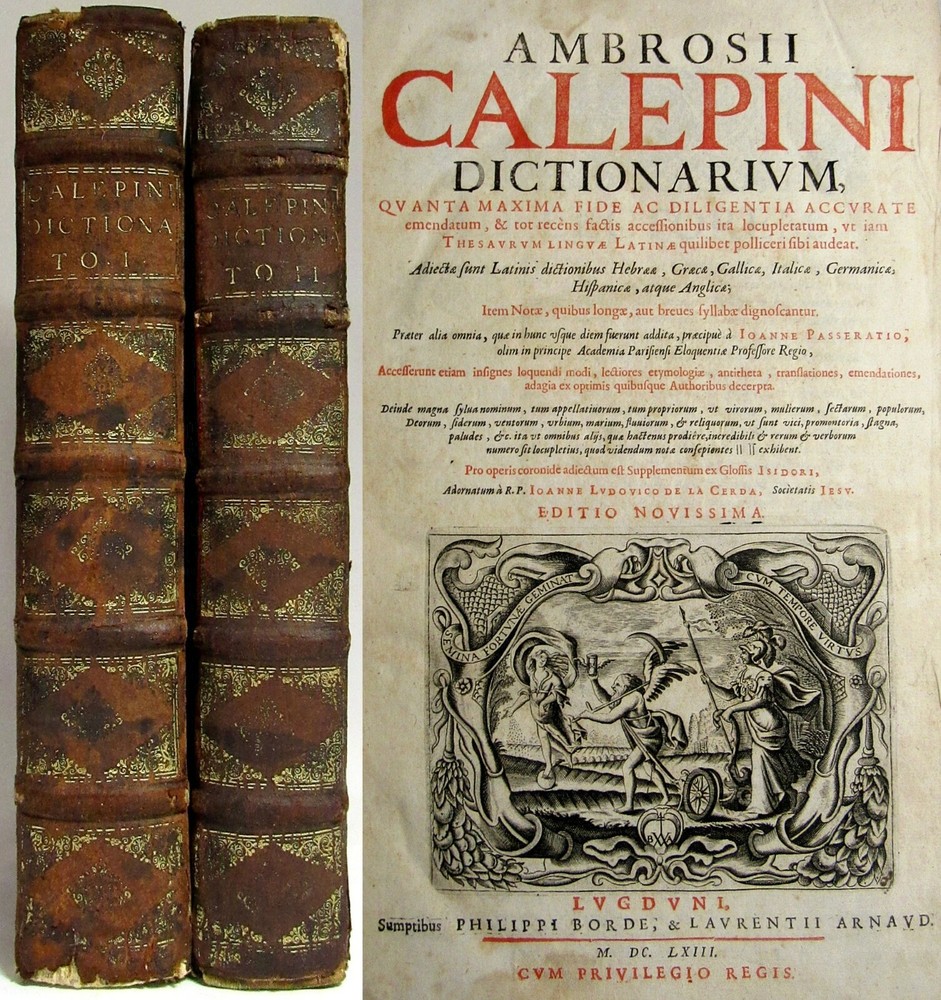 Up for sale is this rare antique 1663 complete 2 volume folio dictionary set, "Ambrosii Calepini Dictionarium, quanta maxima fide ac diligentia accurate emendatum, & tot recens factis accessionibus ita locupletatum, ut iam Thesaurum Linguae Latinae, adjectae sunt Latinis dictionibus hebraeae, graecae, gallicae, italicae, germanicae, hispanicae, atque anglicae." The books are overall in good condition with some signs of wear and age. The leather covers have some scuffing and wear with some corner wear and edge wear. There are small sections of cracking towards the top of the 2nd volume's outer leather joints and some cracking to the interior hinges of both volumes; however, the bindings of the books are still good and sound. Both volumes have a nice engraved title page and the first volume also has an additional half title. There are some crease lines/ wrinkles to the 2nd volume's title page. A couple of the pastedowns have some small handwritten numbers to the top margin in fountain pen. The interiors are toned from age but are fairly clean with some scattered light foxing, soiling, and grubbiness. A few pages have some worming. Most of the worming is pretty minor; there are just about 10 leaves or so in the "S" section where it is a bit heavier. Page 545/546 in the 1st volume has a fair amount of chipping to the bottom margin, however no text is affected. Along with that there is likely the very occasional page with some kind of other minor imperfection such as a small tear or chip, mild stain, minor marking, creased page corner, etc. The books are large volumes which measure approximately 15 3/8 inches by 9 1/2 inches. The text is collated and complete. There are some printing errors in a few of the page numbers; however, the content is correct. Volume 1 is 959 pages and volume 2 is 855. Please look at all of the photos to further note the condition. The cost of shipping includes insurance to the U.S.