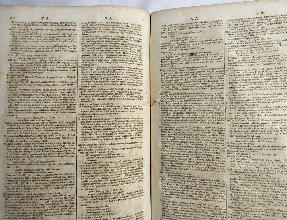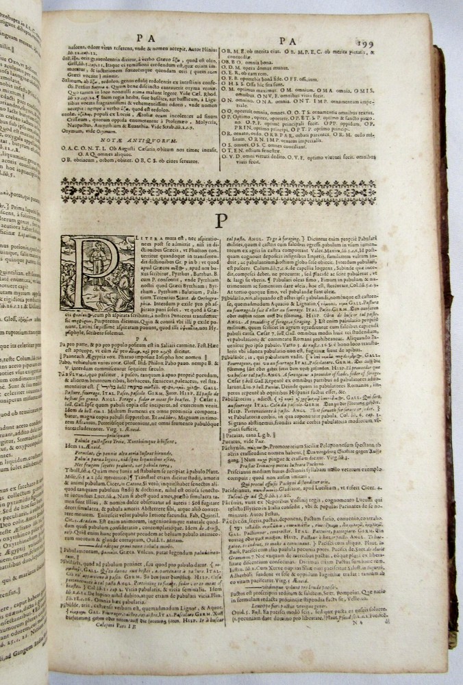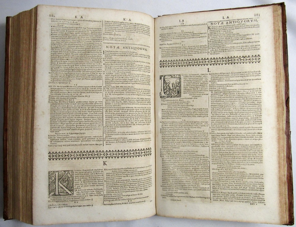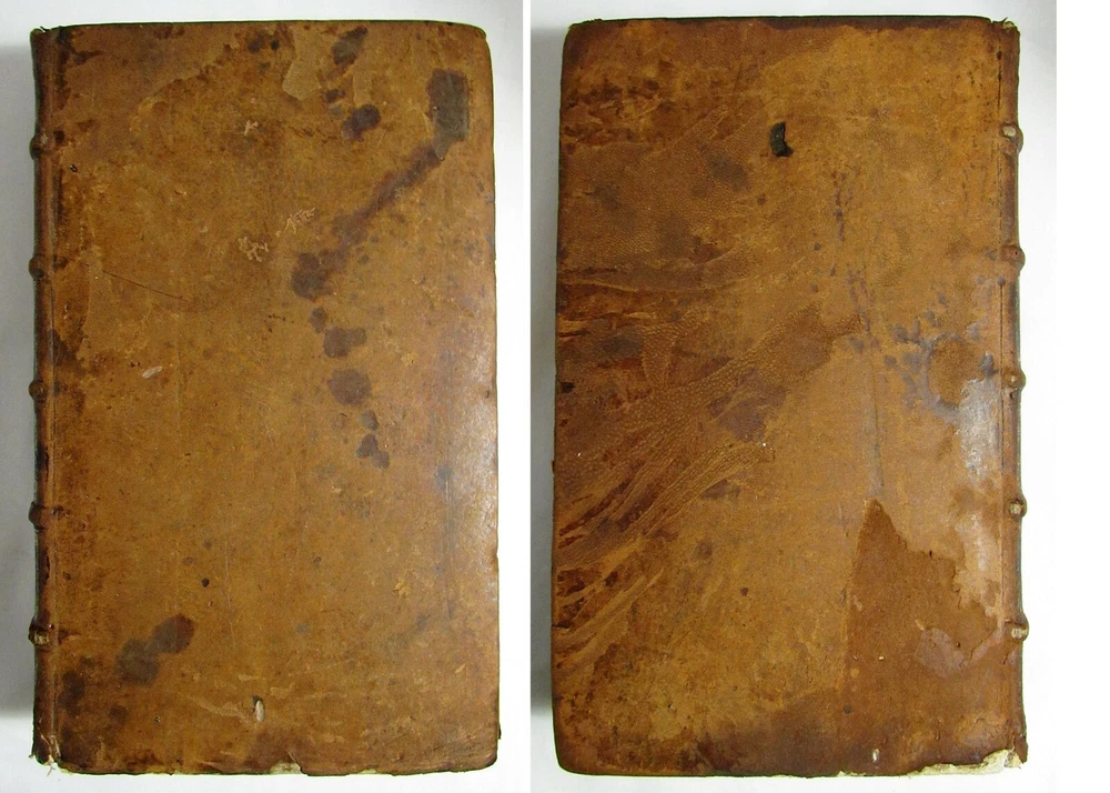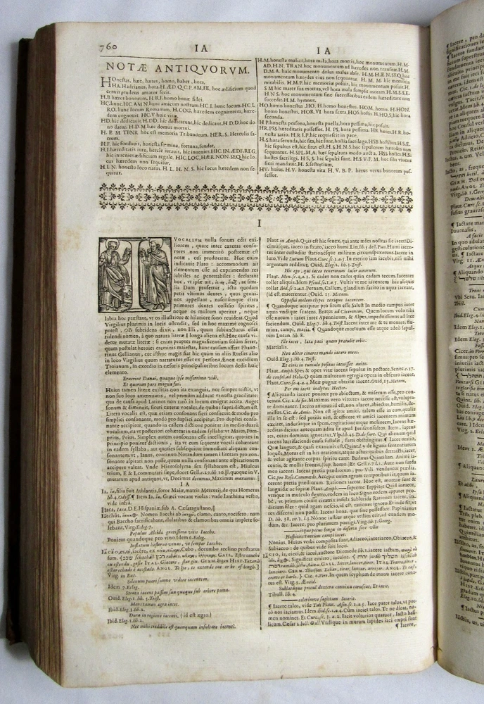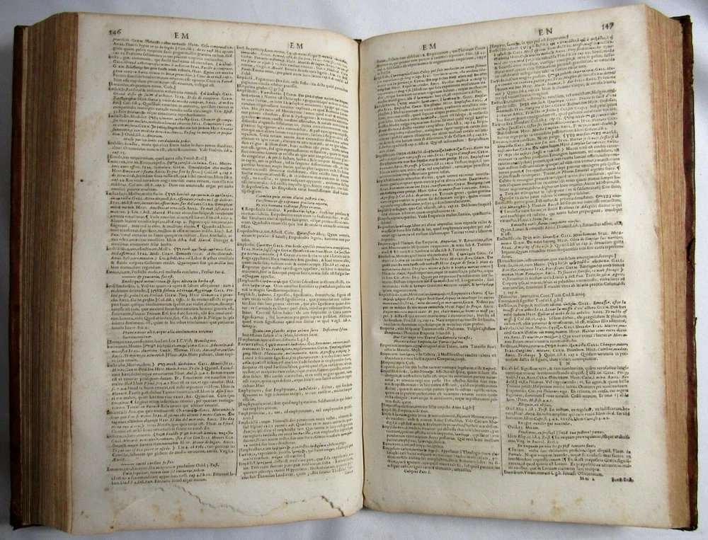 Up for sale is this rare antique 1663 complete 2 volume folio dictionary set, "Ambrosii Calepini Dictionarium, quanta maxima fide ac diligentia accurate emendatum, & tot recens factis accessionibus ita locupletatum, ut iam Thesaurum Linguae Latinae, adjectae sunt Latinis dictionibus hebraeae, graecae, gallicae, italicae, germanicae, hispanicae, atque anglicae." The books are overall in good condition with some signs of wear and age. The leather covers have some scuffing and wear with some corner wear and edge wear. There are small sections of cracking towards the top of the 2nd volume's outer leather joints and some cracking to the interior hinges of both volumes; however, the bindings of the books are still good and sound. Both volumes have a nice engraved title page and the first volume also has an additional half title. There are some crease lines/ wrinkles to the 2nd volume's title page. A couple of the pastedowns have some small handwritten numbers to the top margin in fountain pen. The interiors are toned from age but are fairly clean with some scattered light foxing, soiling, and grubbiness. A few pages have some worming. Most of the worming is pretty minor; there are just about 10 leaves or so in the "S" section where it is a bit heavier. Page 545/546 in the 1st volume has a fair amount of chipping to the bottom margin, however no text is affected. Along with that there is likely the very occasional page with some kind of other minor imperfection such as a small tear or chip, mild stain, minor marking, creased page corner, etc. The books are large volumes which measure approximately 15 3/8 inches by 9 1/2 inches. The text is collated and complete. There are some printing errors in a few of the page numbers; however, the content is correct. Volume 1 is 959 pages and volume 2 is 855. Please look at all of the photos to further note the condition. The cost of shipping includes insurance to the U.S.
