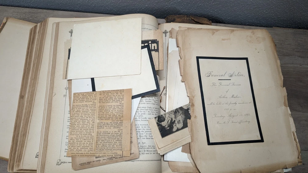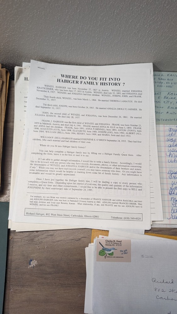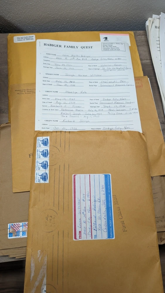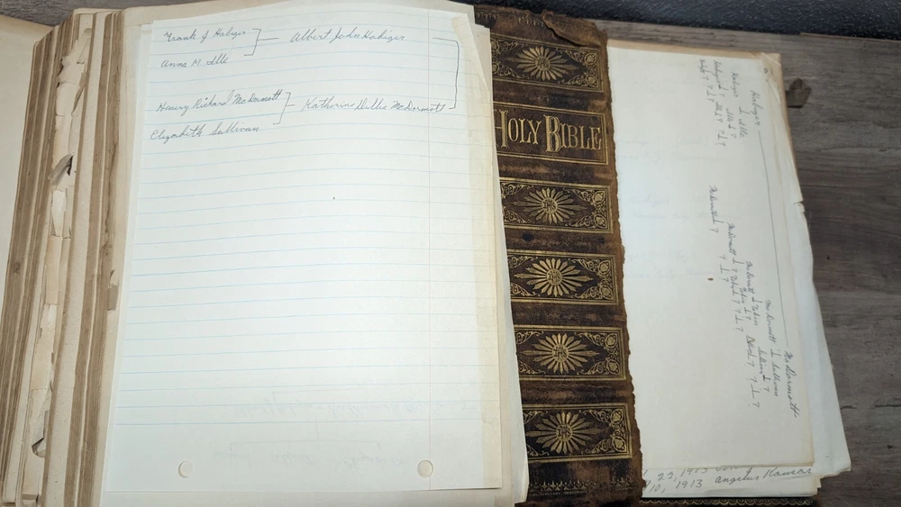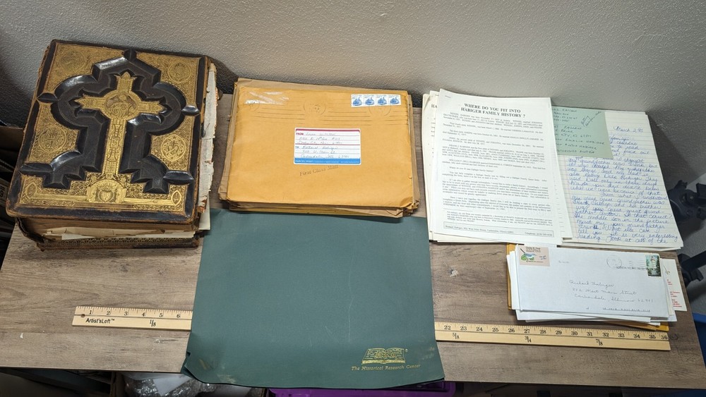 1800s bible with family photos, family crest, vast amount of genealogy with hand written letters and more. approximately 40 family quest documents from various family members and other letters Thanks for looking at our item, all items are sold as is and returns are not accepted. Please ask any questions before purchasing. Please look at all photos for item condition. Please view all photos before purchasing to determine whether or not the condition will suit you. If there are any major flaws, they will be pointed out in the photos. Please note that true colors may vary slightly from photos due to the digital photography used. Measurements in pictures. Item Shown is Exact Item you will Receive. Items may be Cross Posted on EBay, Mercari, Poshmark, Facebook Marketplace so don’t hesitate to throw an offer my way.