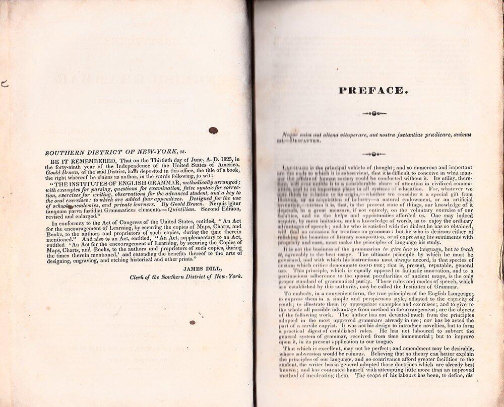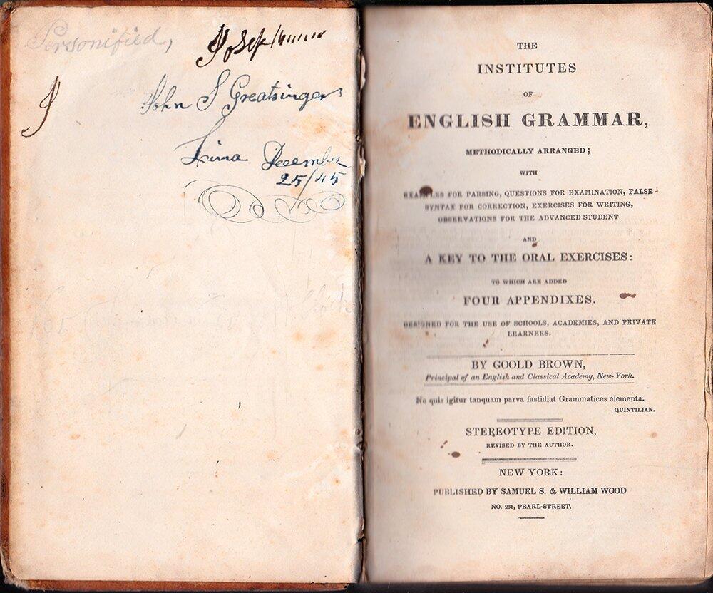 THE INSTITUTES OF ENGLISH GRAMMAR Methodically Arranged; With Examples of Parsing, Questions for Examinations, False Syntax for Correction, Exercises for Writing, Observations for the Advanced Student and a Key to the Oral Exercises: to which are added FOUR APPENDIXES. DESIGNED FOR THE USE OF SCHOOLS, ACADEMIES, AND PRIVATE LEARNERS. By Goold Brown STEREOTYPE EDITION REVISED BY THE AUTHOR 1845* Published by Samuel S. & William Wood New York Full Leather, 312 pages X Click to Enlarge An antique English grammar book first published in 1823 and reprinted a number of times up through 1879. Goold Brown (1791 - 1857) was an American grammarian born in Providence, Rhode Island, the third child of Smith Brown and Lydia Gould. His family could be traced to some of the earliest Quakers in New England. He was educated in Friends' Schools in Providence and Dutchess County, New York. He began teaching at age 19, and at 21 he opened an academy for classical and literary studies in New York City. *Although this book has no publication date at the bottom of the title page, the original owner left a handwritten in contemporary pen clue opposite the title page "December 25/45" which is taken to mean December 25 (Christmas) 1845. The only other date in the book is 1832 at the bottom of the Preface. There is other writing by the original owner in both pencil and pen on the last black endpaper. It appears that the older this work is, the more that it's worth. BOOK DESCRIPTION/CONDITION: Presumed 1845 edition as stated above. 12mo - over 6¾" - 7¾" tall. Full leather binding with title in gilt over black on spine. Spine partially chipped 2" from bottom. Some other small areas of leather wear and chipping on cover. Hinges cracked but holding. Textblock stable. Some writing front and rear as described above. Interior generally good with sparse, minor foxing, minimal marginalia. 4 3/4" x 7 1/2" x 1 1/8" We can combine shipping for similar items when practical, but you must contact seller prior to purchase and wait for an invoice from us (with combined shipping discount) prior to payment or we will not be able to Shipping via USPS unless other carrier stated in listing description. Stated shipping charges are for delivery to locations in the U.S. only. Shipping cost to foreign destinations will be higher and in most cases will go through eBay's Global Shipping Program which we have no control or knowledge of the cost. (Please contact eBay directly for that.) Please email any questions/concerns prior to bidding and/or conclusion of sale. See my other listings for more great items! X Click to Enlarge X Click to Enlarge X Click to Enlarge X Click to Enlarge Payment due at time of purchase. Shipping via USPS unless other carrier stated in listing description, within three business days of payment. We do not usually ship on Saturday, Sunday or holidays. Delivery confirmation is used for items of sufficient value and at our expense. All additional postal services must be requested in advance of payment and may be subject to additional charges. Stated shipping charges are for delivery to locations in the U.S. only. Shipping cost to foreign destinations will be higher and it is strongly recommended that you email us prior to bidding for shipping costs so there will be no surprises. Any additional services or shipping options requested by buyer must be communicated to seller prior to end of auction and/or payment. Please email any questions/concerns prior to committing to buy and payment. OUR RETURN POLICY All items returnable as long as received back by the seller within 30 days from date of purchase and in the same condition the item was sent. Refunds apply to the item only and do not include shipping cost paid by buyer to receive or return the item. Intention to return an item must be communicated to the seller within 30 days of the buyer receiving the item in order to qualify for a refund. In certain cases, a partial refund may be negotiated between seller and buyer at seller’s discretion. No other guarantees or warranties are implied by this return policy, including but not limited to additional remuneration over and above the cost of the item due to any circumstances not stipulated in this policy. Seller strongly recommends that prospective buyers communicate any questions or concerns to seller prior to payment by contacting this seller through the eBay system. eBay Store txzj pxzj7585 txzj-11 txzj111 txzj115