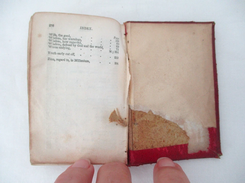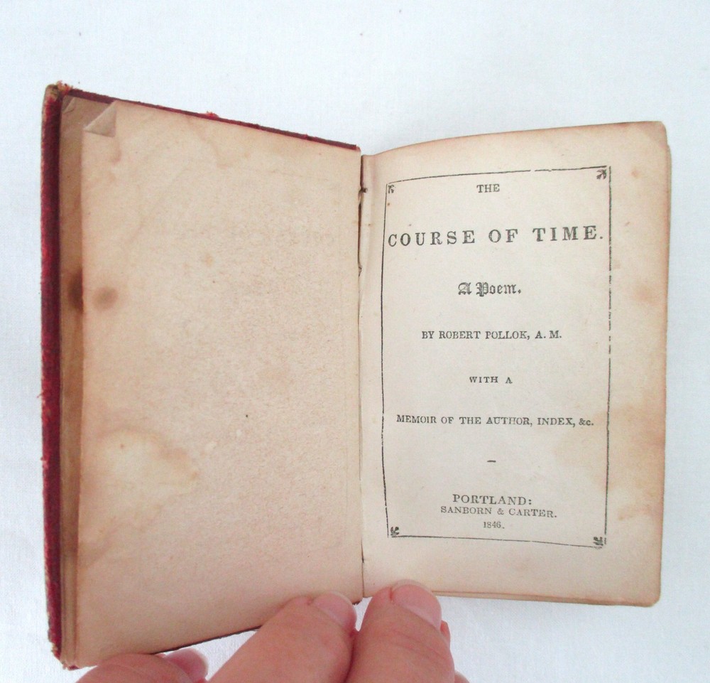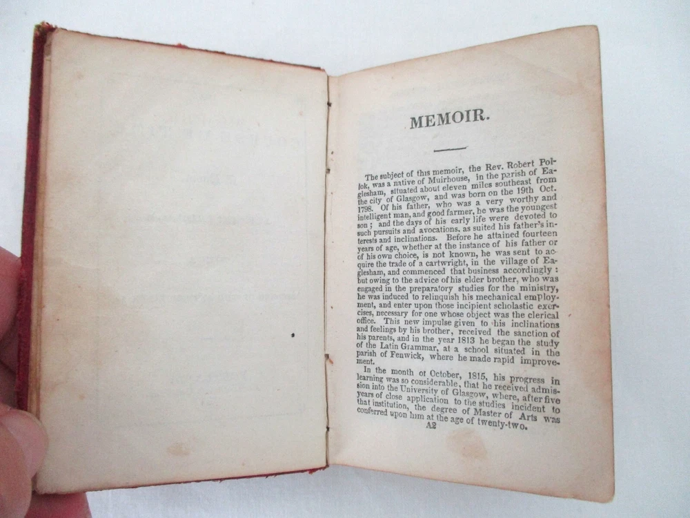 Hello and Welcome ! Today, the listing is THIS IS A WONDERFUL ANTIQUE MINIATURE BOOK BY REVEREND ROBERT POLLOK OF HIS MEMOIRS. THESE MEMOIRS ARE BEAUTIFULLY POETIC OF HIS LIFE AND PRSUITS OVER...."THE COURSE OF TIME". BEING THE SUBJECT OF THIS MEMOIR, HE WAS BORN OCTOBER 19, 1798, A NATIVE OF MUIRHOUSE, PARISH SITUATED ABOUT 11 MILES SOUTH EAST OF GLASGOW. THIS IS LITTLE MINIATURE TREASURE IS FULL CALF RED LEATHER. IT IS IS VERY GOOD ANTIQUE CONDITION CONSIDERING IT IS 178 YEARS OLD! GILT EMBOSSED SPINE AND PAGE EDGES. THE LEATHER SHOWS SOME WEAR TO THE EDGES AND THE INSIDE BACK COVER. THIS IS A WONDERFUL LITTLE MINIATURE AND STILL A TREASURE AFTER ALL THESE YEARS. PLEASE SEE ALL PICTURES. IT IS ALWAYS A PLEASURE BRINGING YOU GREAT TREASURES THAT I HAVE FOUND EITHER IN AUCTIONS OR PRIVATE ESTATES. BECAUSE MOST OF MY ITEMS ARE OVER 100 YEARS OLD, EXPECT TO SEE SOME AGE-RELATED WEAR OR A LITTLE IMPERFECTION HERE AND THERE ESPECIALLY ON LACE OR FABRIC. NOTHING MORE THAN YOU WOULD EXPECT TO SEE AND ACTUALLY WANT TO SEE TO CONFIRM AGE. SOMETIMES WHAT I MIGHT THINK IS NOTHING, YOU MAY NOT AGREE. MY ITEMS MAY BE A LITTLE ECLECTIC BUT THEY HAVE A SPECIAL MEANING AND BRING ME JOY AND I HOPE THEY WILL YOU ALSO. SO, PLEASE LOOK AT ALL THE PICTURES AND USE THE MAGNIFICATION TO REALLY SEE AND APPRECIATE THE CONDITION AND HOW WONDERFUL IT TRULY IS. THANK YOU SO MUCH FOR VISITING AND I AM HONORED THAT YOU HAVE LOOKED AT ONE OF MY ITEMS. THAT'S ALL FOR NOW....MARY It is very important to me that you love everything you purchase so please email me with any questions you may have prior to your purchase. I take great care in everything I ship so be assured that your treasure will be carefully packaged to ensure that it arrives in the condition you would expect. Payment is expected within 2 days of purchase, and I will ship upon notification of payment. Shipping is within the Contiguous U.S. and additional shipping charges may apply to outer states. Shipping charges are determined by weight and dimension. I ship USPS ground. Like everything else, shipping rates have gone up so I will always seek the best possible rate for you.