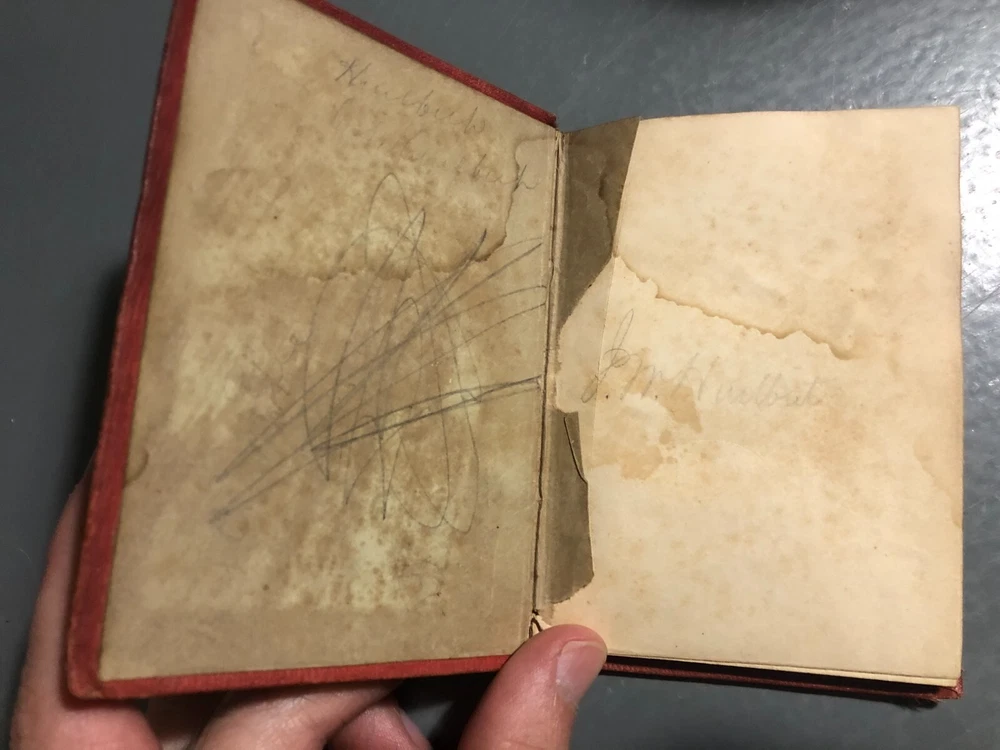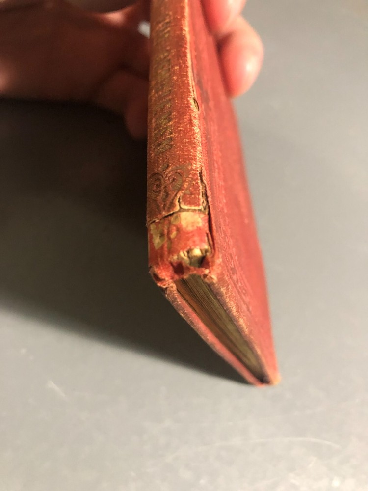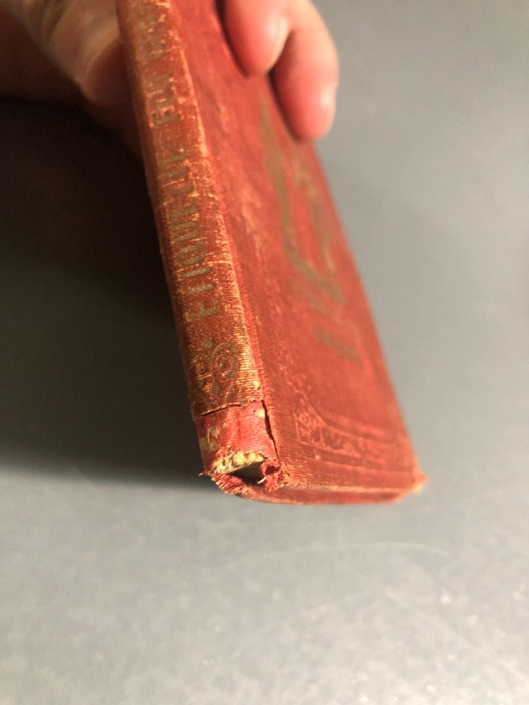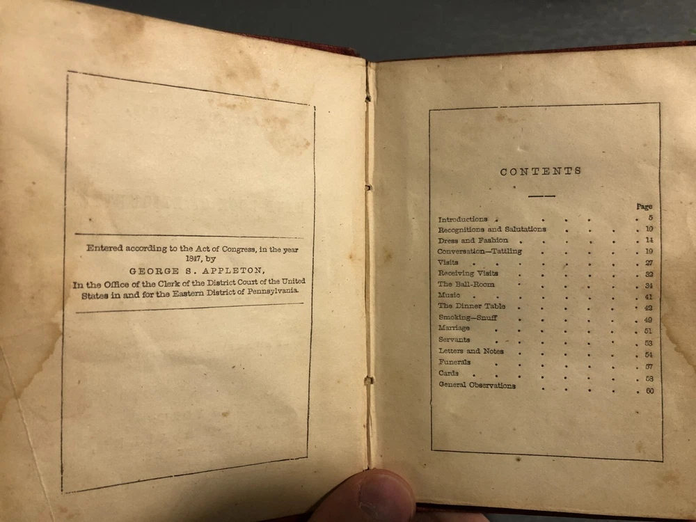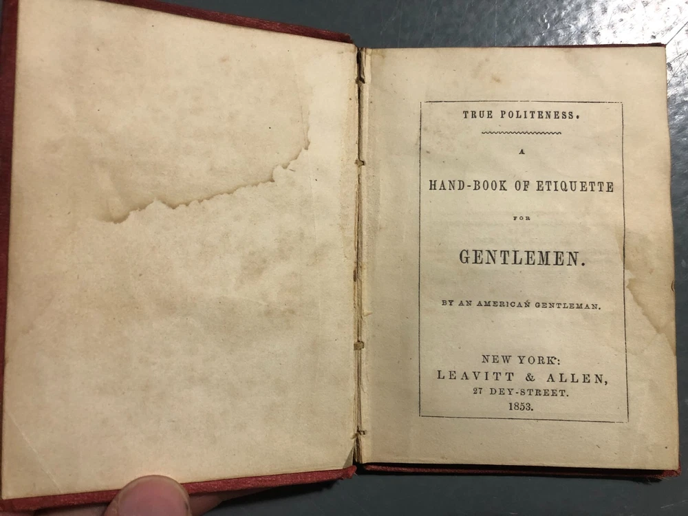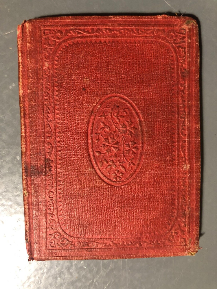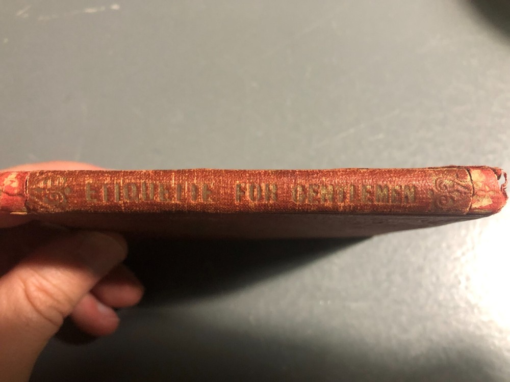 Very rare 1853 antique "Etiquette for Gentlemen" pocket book! Measures approximately 4.5" x 3.5". Cover shows various signs of age/wear. There is staining, scuffing tearing and edge wear. The title, picture, and decoration are still clear and visible. Binding is intact and holding pages but there is some looseness/separation to it. Interior pages text is clear and legible but the pages have various amounts of staining. The very first and very last pages have larger amounts of staining as well as scribbles and writing. Gilt outside edges are holding up pretty well. See photos for more detail. Let me know if you have any questions. Thank you for your interest!