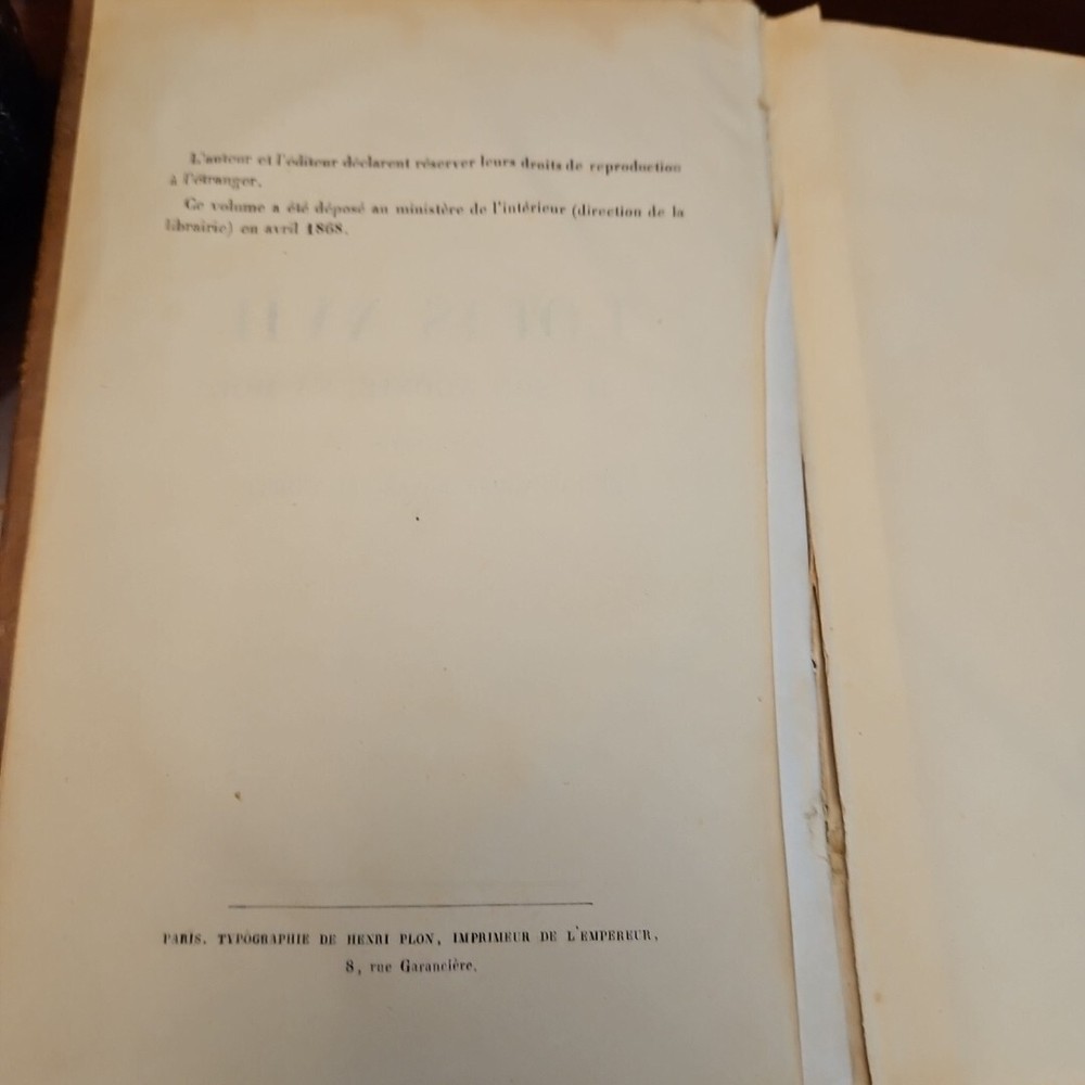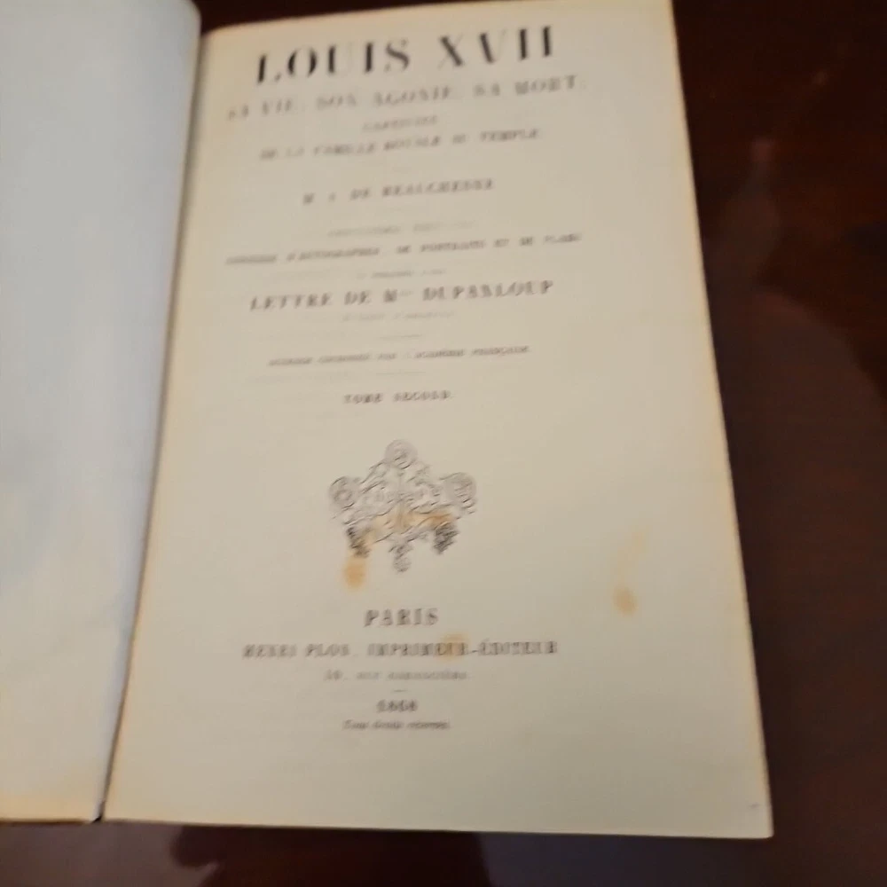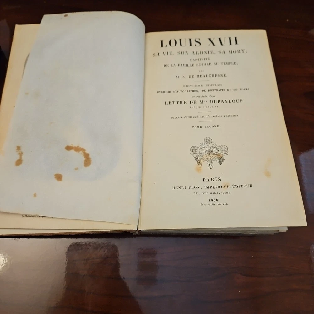 This antique book from 1868, titled "Louis XVII, sa vie, son agonie, sa mort" by A. De Beauchesne, is a collector's edition vintage paperback. It features a leather binding and is in its original form. Henri Plon, imprimeur-éditeur in Paris, published the French book. The book is a biography and autobiography about the life of Louis XVII, the last king of France, and his tragic end. It is illustrated and has special attributes that make it a unique addition to any collection. This book is a must-have for literature enthusiasts and collectors alike. See pictures Measurements 7.25 x 5 x 1 inch LOUIS XVII SA VIE, SON AGONIE, SA MORT; CAPTIVITÉ DE LA FAMILLE ROYALE AU TEMPLE; PAR M. A. DE BEAUCHESNE. SEPTIÈME EDITION ENRICHIE D'AUTOGRAPHES, DE PORTRAITS ET DE PLANS ET PRÉCÉDÉE D'UNE LETTRE DE MAR DUPANLOUP ÉVÊQUE D'ORLÉANS. OUVRAGE COURONNÉ PAR L'ACADÉMIE FRANÇAISE. TOME SECOND. PARIS HENRI PLON, IMPRIMEUR-ÉDITEUR 10, RUE GARANCIÈRE. 1868 Tous droits réservés. LOUIS XVII HIS LIFE, HIS AGONY, HIS DEATH; CAPTIVITY OF THE ROYAL FAMILY IN THE TEMPLE; ABOUT Mr. A. DE BEAUCHESNE. SEVENTH EDITION ENRICHED WITH AUTOGRAPHS, PORTRAITS AND PLANS AND PRECEDED BY A LETTER FROM MAR DUPANLOUP BISHOP OF ORLEANS. WORK CROWNED BY THE FRENCH ACADEMY. TOME SECOND. PARIS HENRI PLON, PRINTER-PUBLISHER 10, RUE GARANCIÈRE. 1868 All rights reserved.