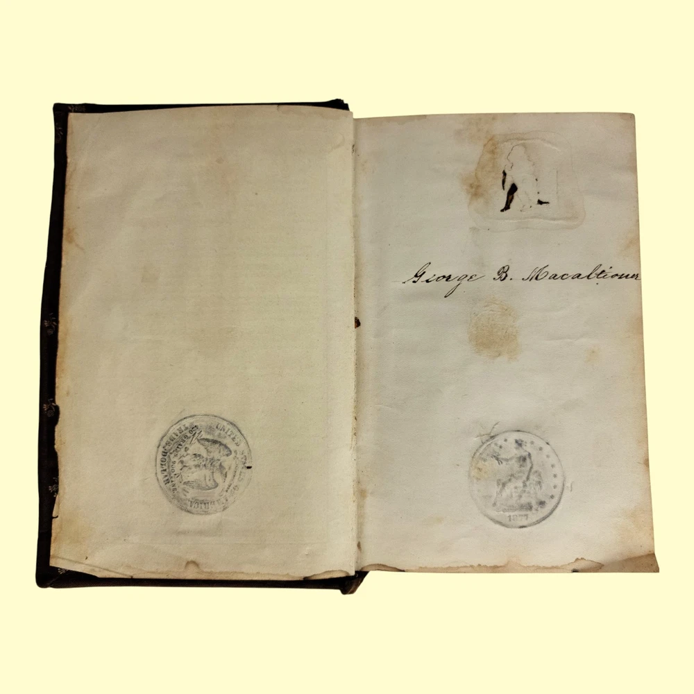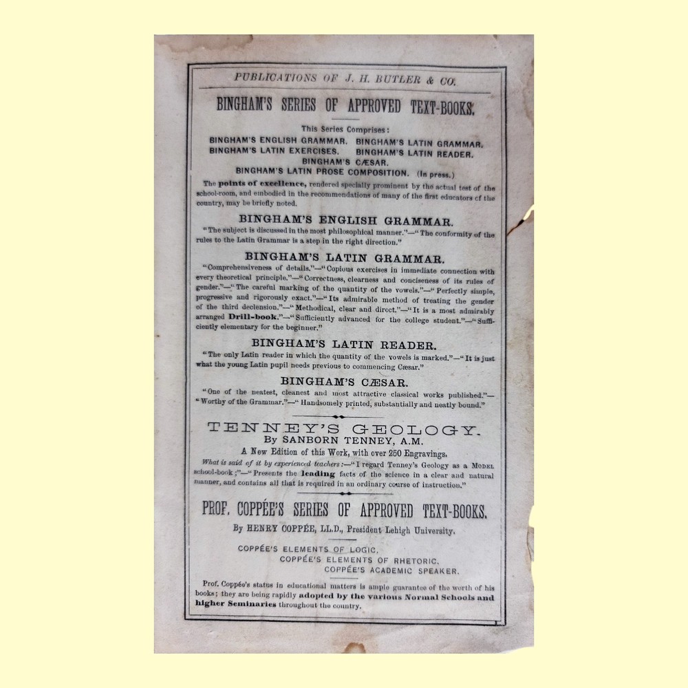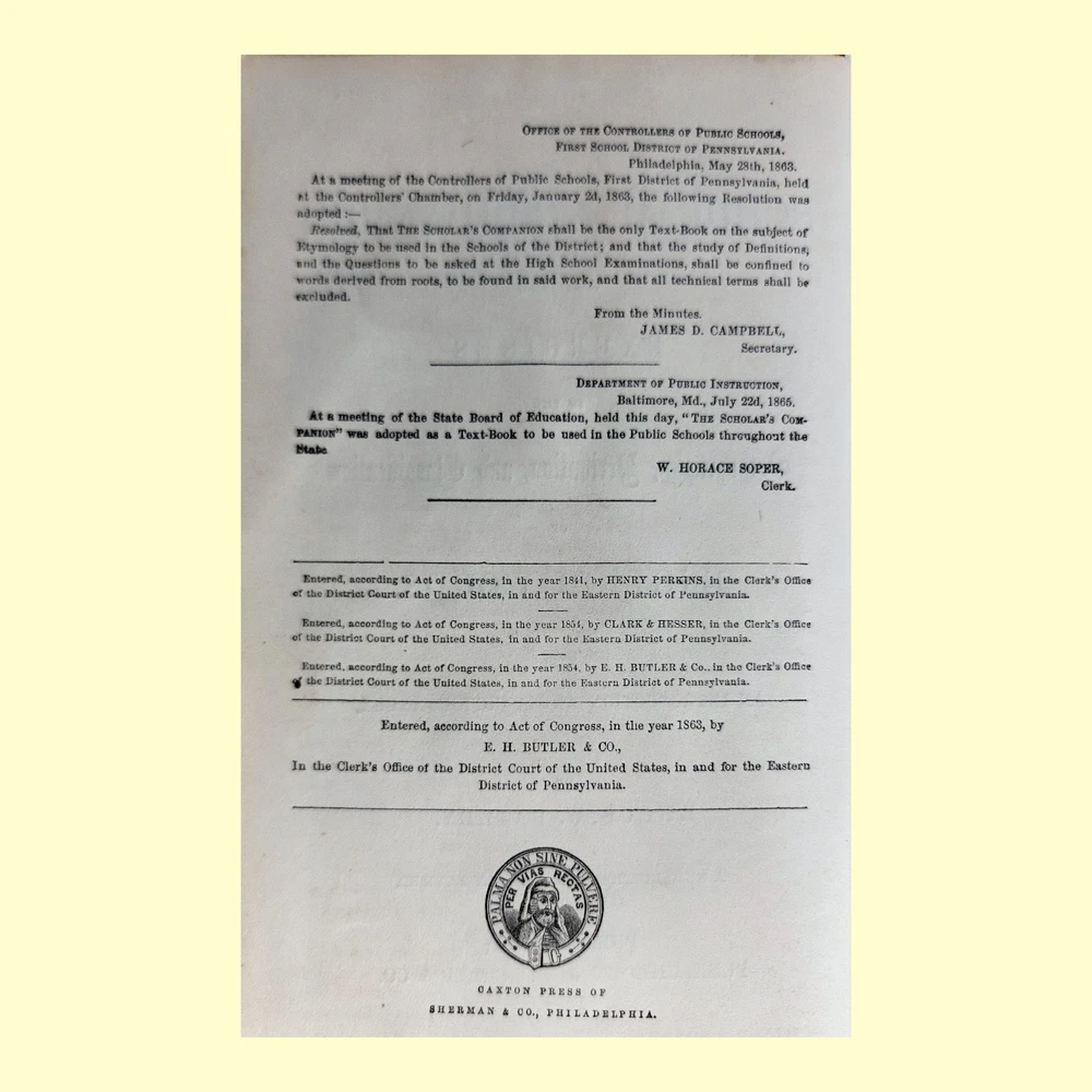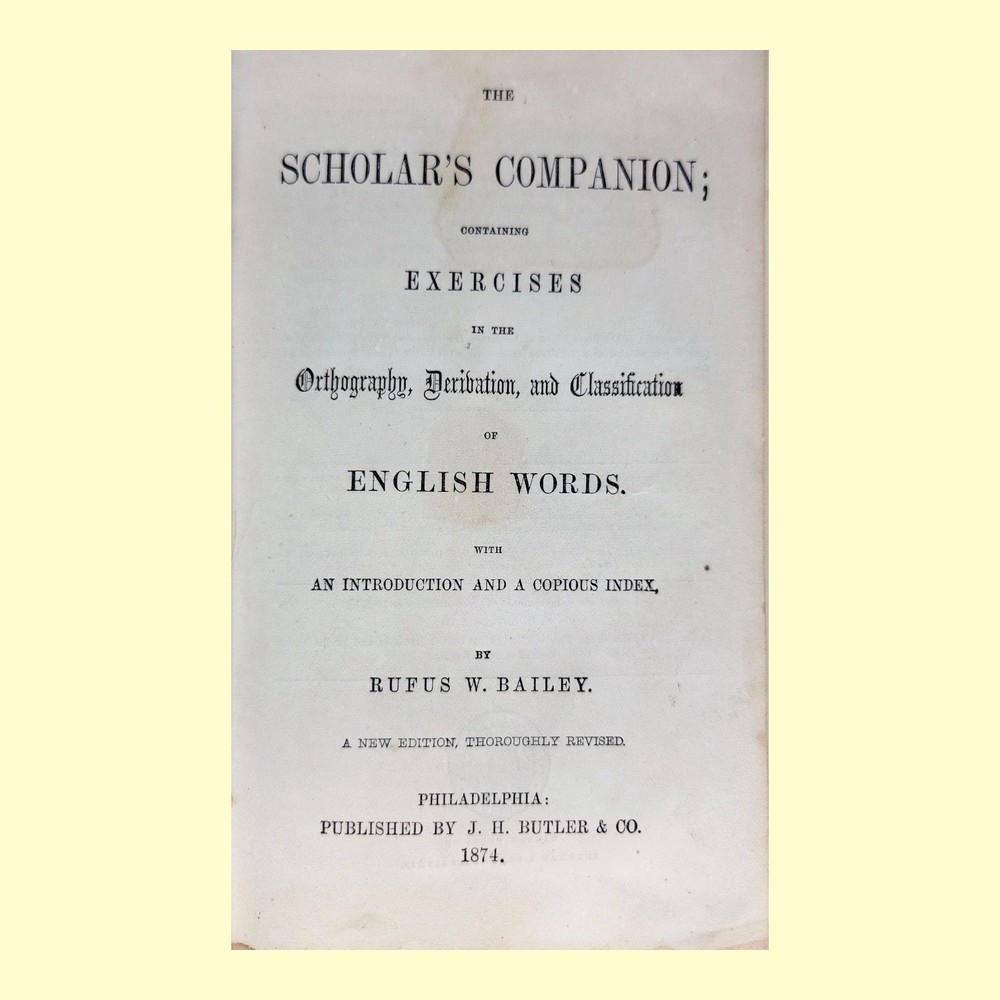Item: Antique 1874 Edition of "The Scholar's Companion" Book Details: This is a rare and authentic copy of "The Scholar's Companion; Containing Exercises in the Orthography, Derivation, and Classification of English Words," by Rufus W. Bailey. This specific edition was published in 1874 by J. H. Butler & Co. in Philadelphia. Historical Significance: More than just a book, this item is a fascinating piece of educational history. The interior pages feature official resolutions from the public school districts of Pennsylvania and Baltimore, Maryland, adopting this very book as a formal textbook. This is a unique insight into the curriculum and teaching methods of the late 19th century. Physical Condition & Features: Cover: The book has a hardback cloth cover with a beautiful and intricate repeating gold floral pattern. It shows significant wear consistent with its age and use, including fraying at the spine and corners, as well as some discoloration and staining. Interior: Pages are intact and provide a wealth of information. The front and back interior covers contain period advertisements for other educational texts, offering a glimpse into the publishing landscape of the era. Personalization: A page inside is marked with the handwritten name "George B. Macalister," a charming detail that adds to its unique history. Size: The book is a small, compact size, typical for a school textbook of the time. Why It's a Great Collectible: This is a perfect item for collectors of: Vintage & Antique Books: Particularly 19th-century educational texts. Educational Memorabilia: A tangible piece of American school history. Americana: Reflects the culture and academic standards of the post-Civil War era. Decorative Objects: Despite its wear, the cover's decorative pattern makes it a great piece for display. This is a wonderful find for anyone who appreciates the history of language, education, or simply the unique character of antique books.