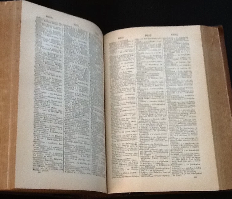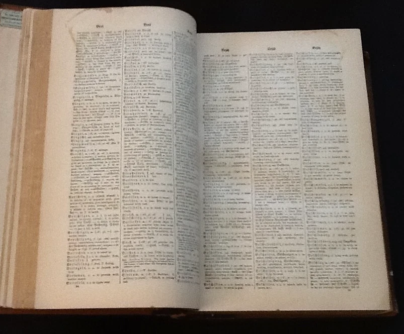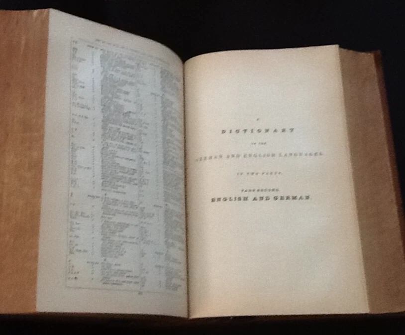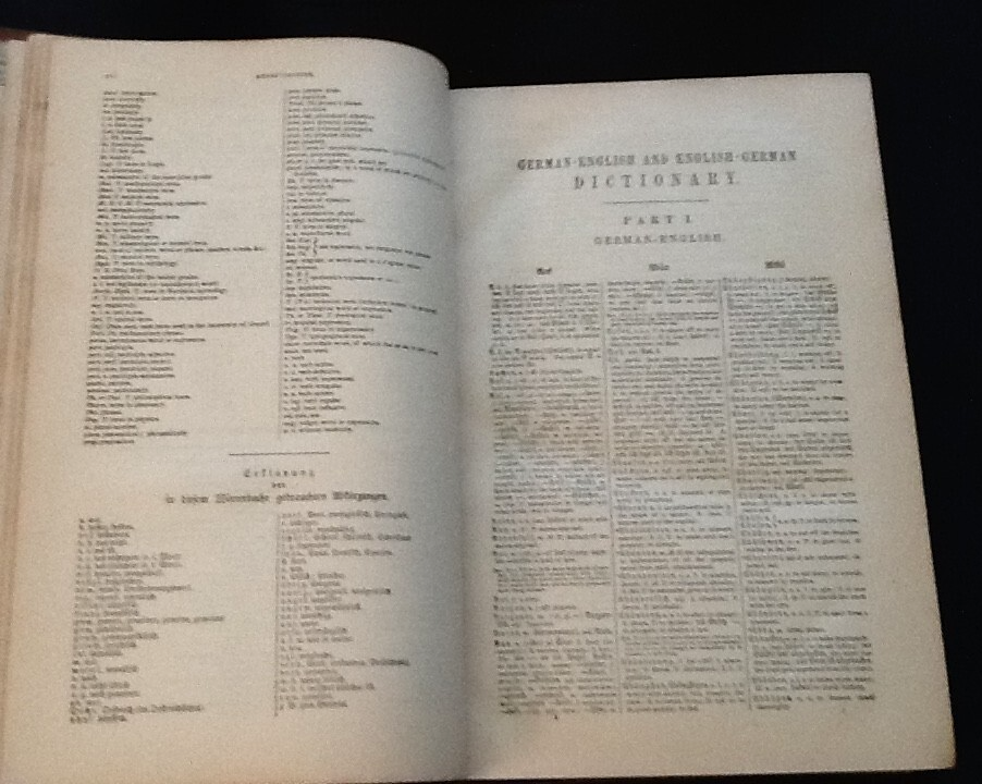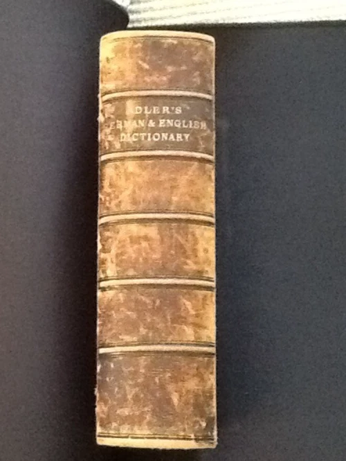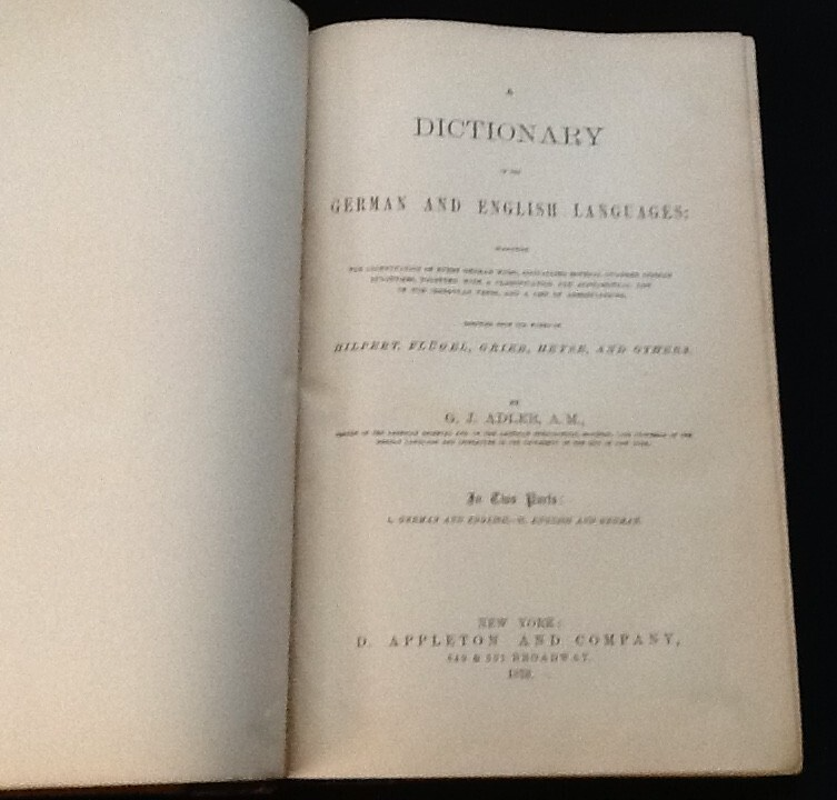 Antique 1878 Leather Bound Book A DICTIONARY OF THE GERMAN AND ENGLISH LANGUAGES This quarter bound leather book measures 7 by 10 inches, has over 1,374 pages and weighs just under 5 pounds. It is in very good condition for its age. There is wear on the brown leather binding and on the cloth board cover corners. On the front flyleaf page is a name and address in pencil dated "Dec. 22 1876" (see photo 2). The interior is clean. I only found one page to have minor staining (see photo 5). All other pages are free from writings, marks or stains and are secure to the binding. The book A Dictionary of the German and English Languages by G.J. Adler is a ** dictionary** that compiles works from various German and English language sources. I will combine shipping with other auctions won.