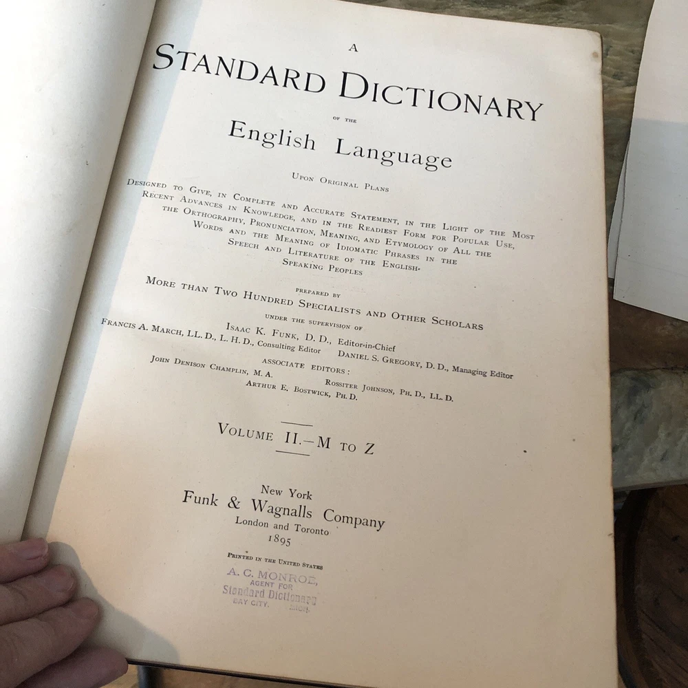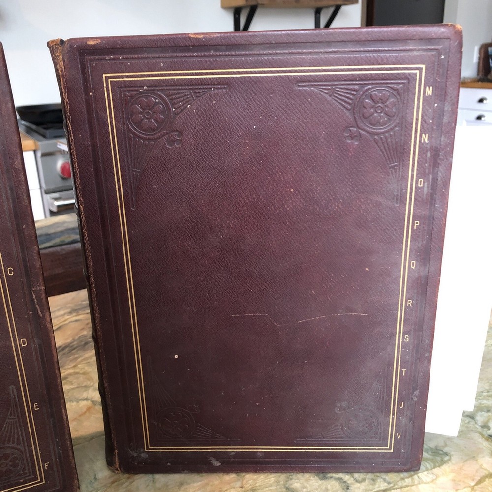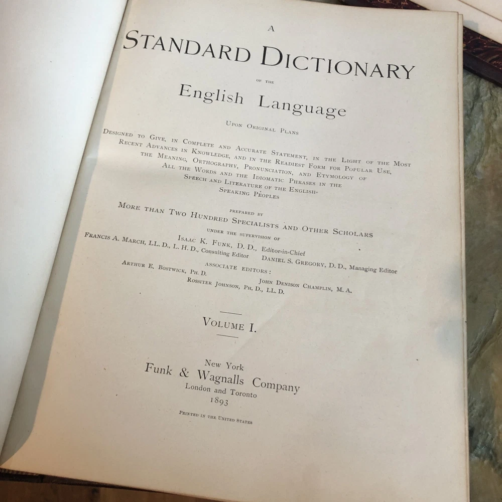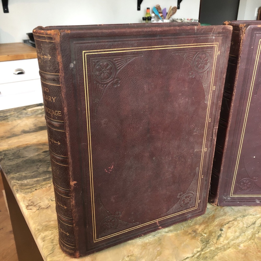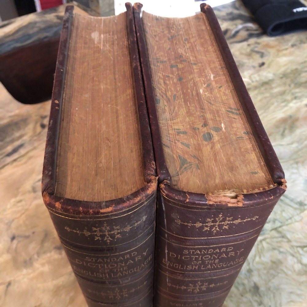 (Old Books, 19th Century Books, Leather Books, English Dictionary, ). A Standard Dictionary of the English Language, Upon Original Plans, ed. by Isaac K. Funk. Published 1893 & 1895, London by Funk & Wagnalls Company. 2 volumes. Volume 1 A-L is published in 1893. And is 1060 pages. Volume 2 M-Z is published in 1895. 1257 pages. Text in English. Chromolithographed full page plates, countless small line drawings within text throughout. A monumental set, each volume is thick, large and very heavy. Period full leather bindings, slightly raised bands, gilt compartment decorations and title lettering, embossed cover designs, gilt ruled cover, marbled end papers, all edges gilt, thumb indexed along fore-edges. Item is physically old and shows some signs of handling and time. Item is not new or in "new" condition. Bindings gently age worn, joints rubbed and slightly scuffed with minor short surface cracking at ends of front joints, some weakening of covers (due to weight of each) although all covers remains firmly attached, set is sound, some old edge staining along top of spine near rear joint of vol. 1, tips of boards worn down a bit, still remains overall attractive as an object. Text block paper is clean, internally well preserved, little staining or soiling, any flaws of a minor type unworthy of specific mention. Still attractive on the shelf. Item displays a pleasing and unique age patina and is in nice antiquarian condition, any age flaws easy to overlook or forgive. Please review photos for more detail and our best attempt to convey how this antique set survives. Book Measures c. 12 3/4" H x 9 1/2" W.