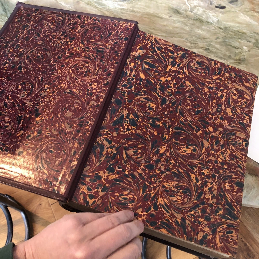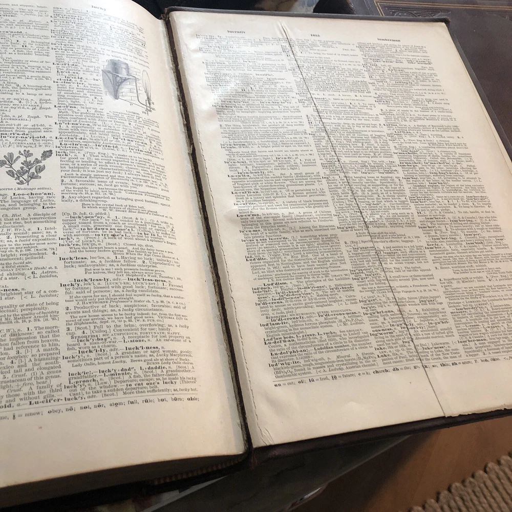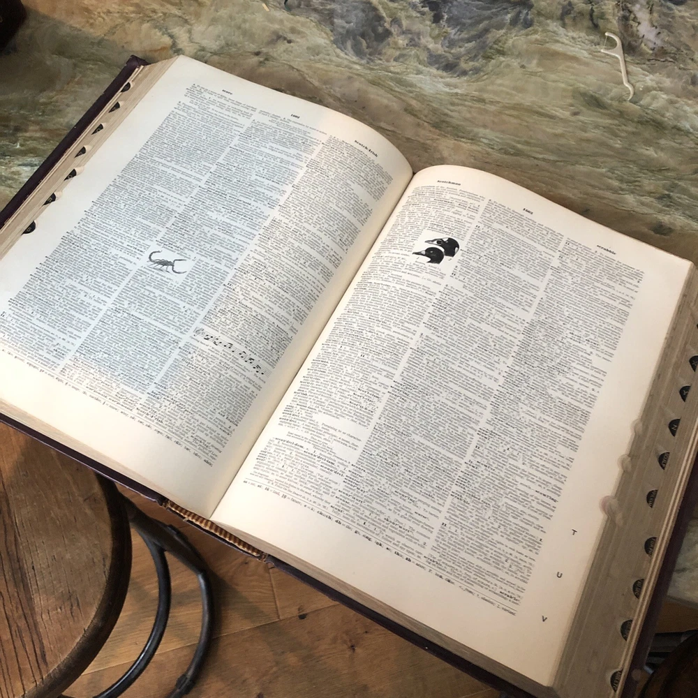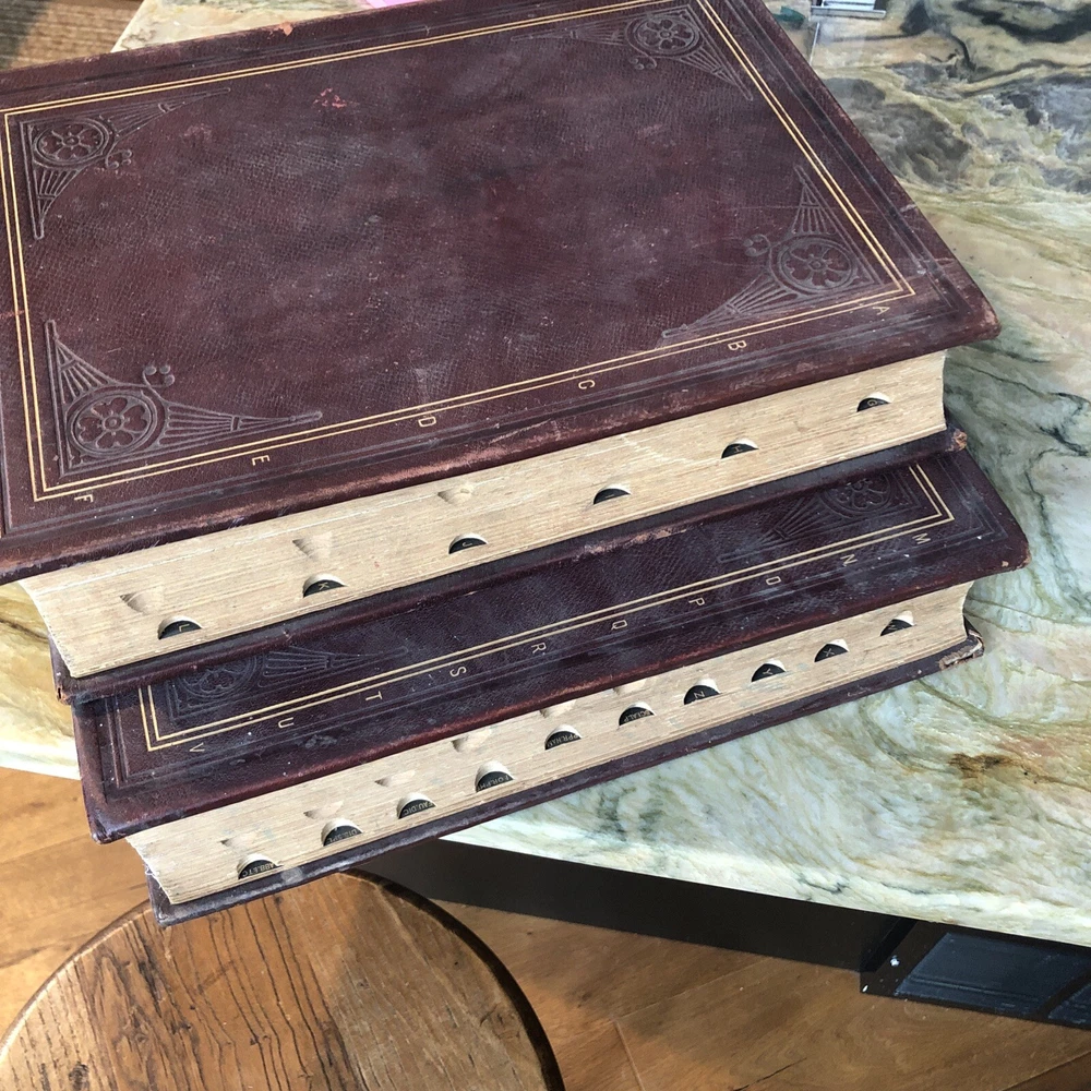 (Old Books, 19th Century Books, Leather Books, English Dictionary, ). A Standard Dictionary of the English Language, Upon Original Plans, ed. by Isaac K. Funk. Published 1893 & 1895, London by Funk & Wagnalls Company. 2 volumes. Volume 1 A-L is published in 1893. And is 1060 pages. Volume 2 M-Z is published in 1895. 1257 pages. Text in English. Chromolithographed full page plates, countless small line drawings within text throughout. A monumental set, each volume is thick, large and very heavy. Period full leather bindings, slightly raised bands, gilt compartment decorations and title lettering, embossed cover designs, gilt ruled cover, marbled end papers, all edges gilt, thumb indexed along fore-edges. Item is physically old and shows some signs of handling and time. Item is not new or in "new" condition. Bindings gently age worn, joints rubbed and slightly scuffed with minor short surface cracking at ends of front joints, some weakening of covers (due to weight of each) although all covers remains firmly attached, set is sound, some old edge staining along top of spine near rear joint of vol. 1, tips of boards worn down a bit, still remains overall attractive as an object. Text block paper is clean, internally well preserved, little staining or soiling, any flaws of a minor type unworthy of specific mention. Still attractive on the shelf. Item displays a pleasing and unique age patina and is in nice antiquarian condition, any age flaws easy to overlook or forgive. Please review photos for more detail and our best attempt to convey how this antique set survives. Book Measures c. 12 3/4" H x 9 1/2" W.