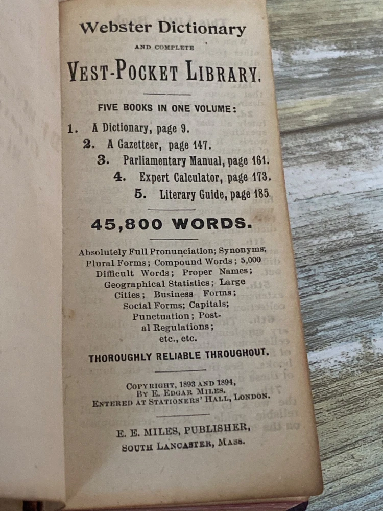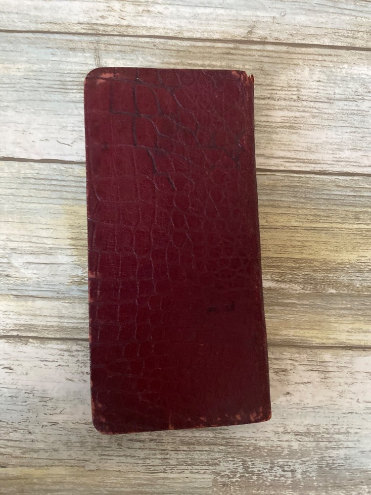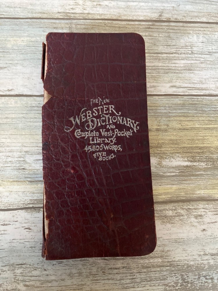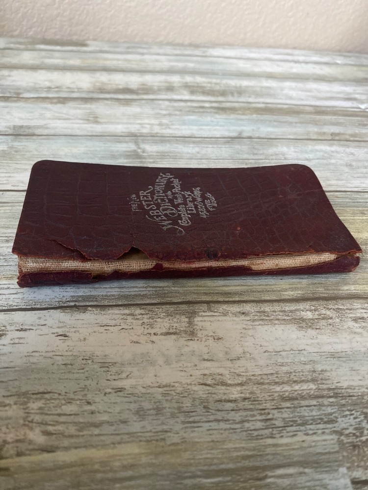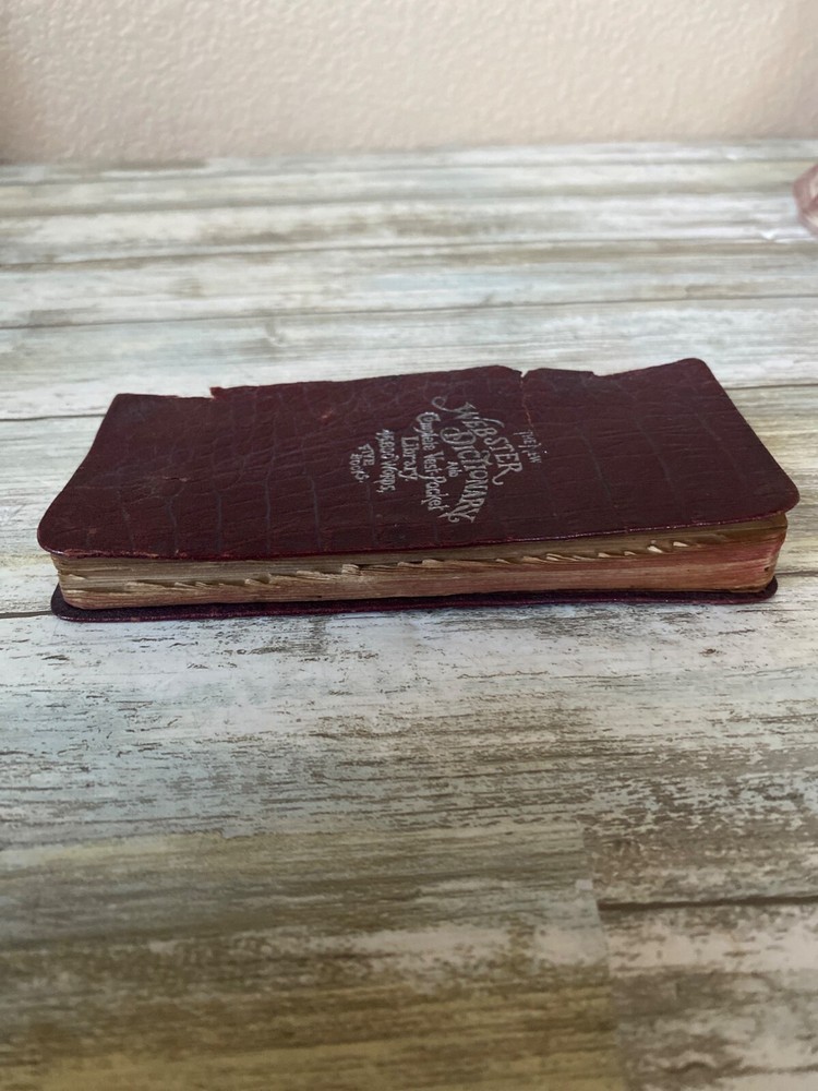 • Webster Vest Pocket Dictionary • 1894 Antique • Red crocodile-embossed leather cover with visible wear and tear • Book spine partially detached; pages intact Pre-owned NOTE: the leather material is tearing all over; writing on the inside cover and a few other pages. 4 oz *drawer