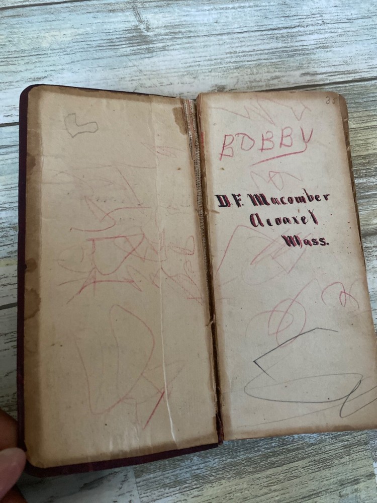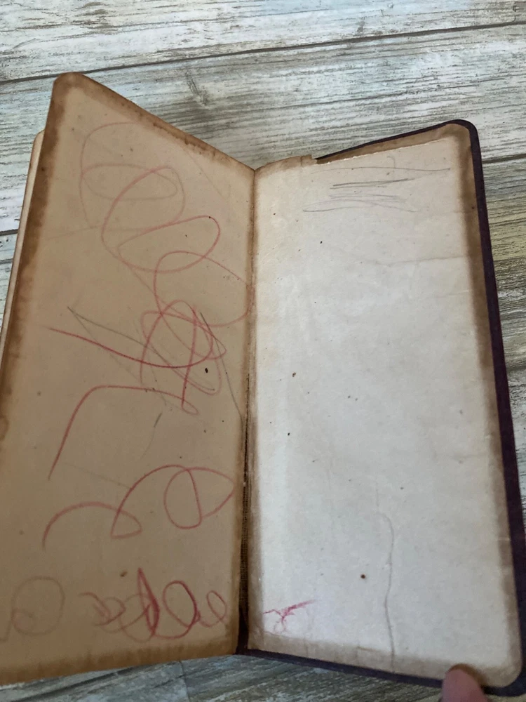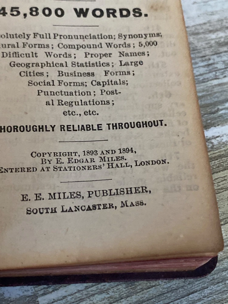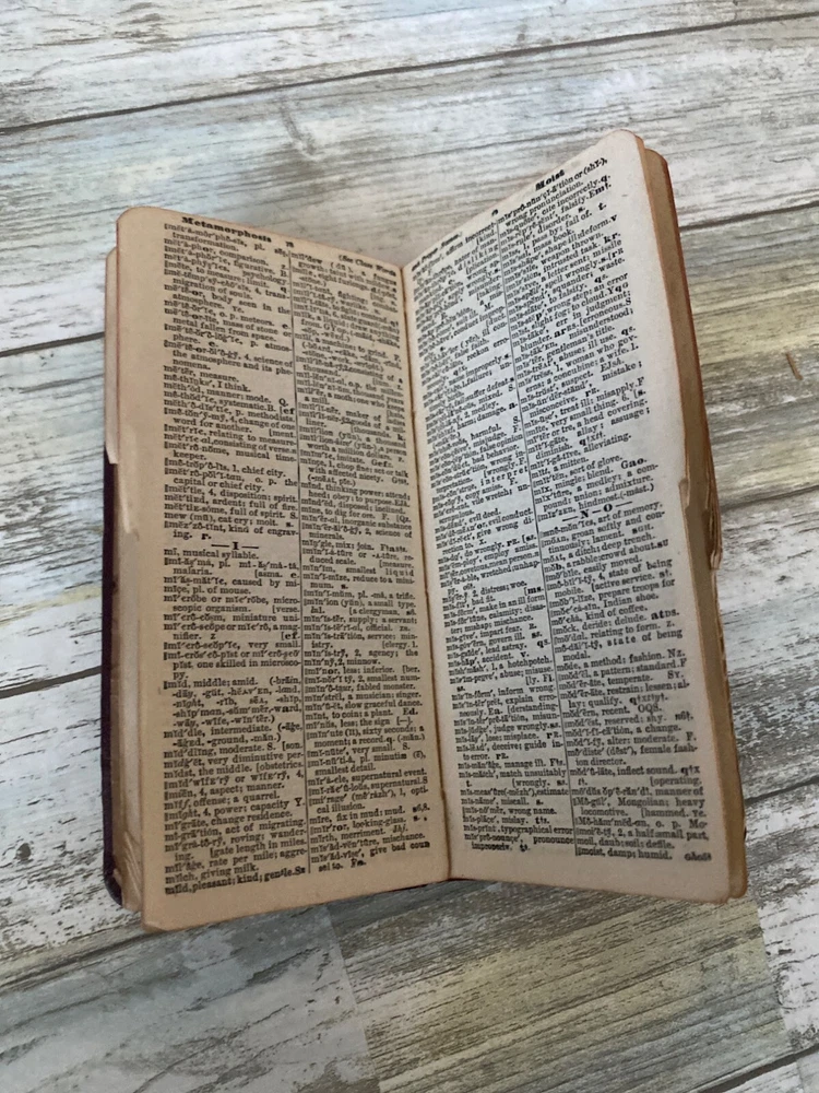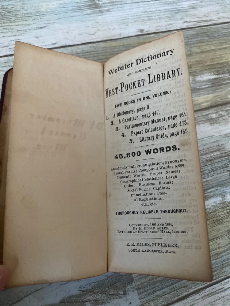 • Webster Vest Pocket Dictionary • 1894 Antique • Red crocodile-embossed leather cover with visible wear and tear • Book spine partially detached; pages intact Pre-owned NOTE: the leather material is tearing all over; writing on the inside cover and a few other pages. 4 oz *drawer