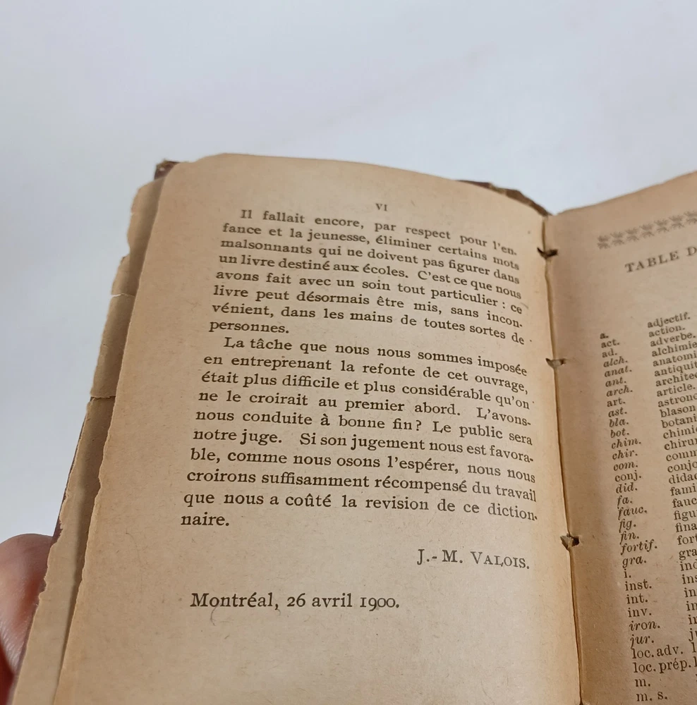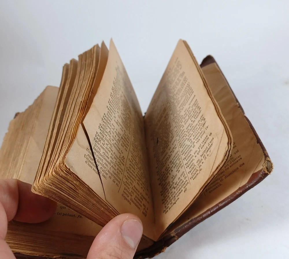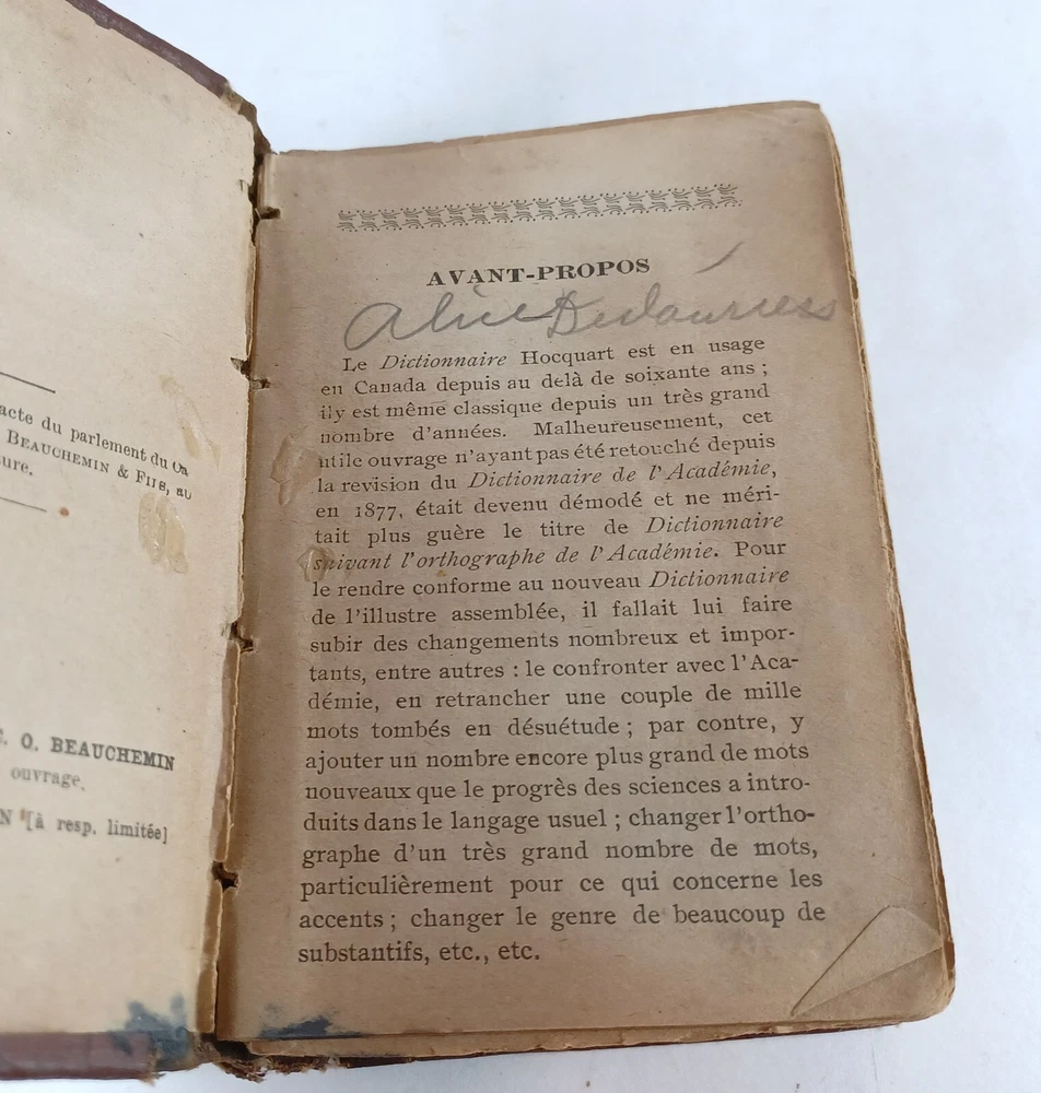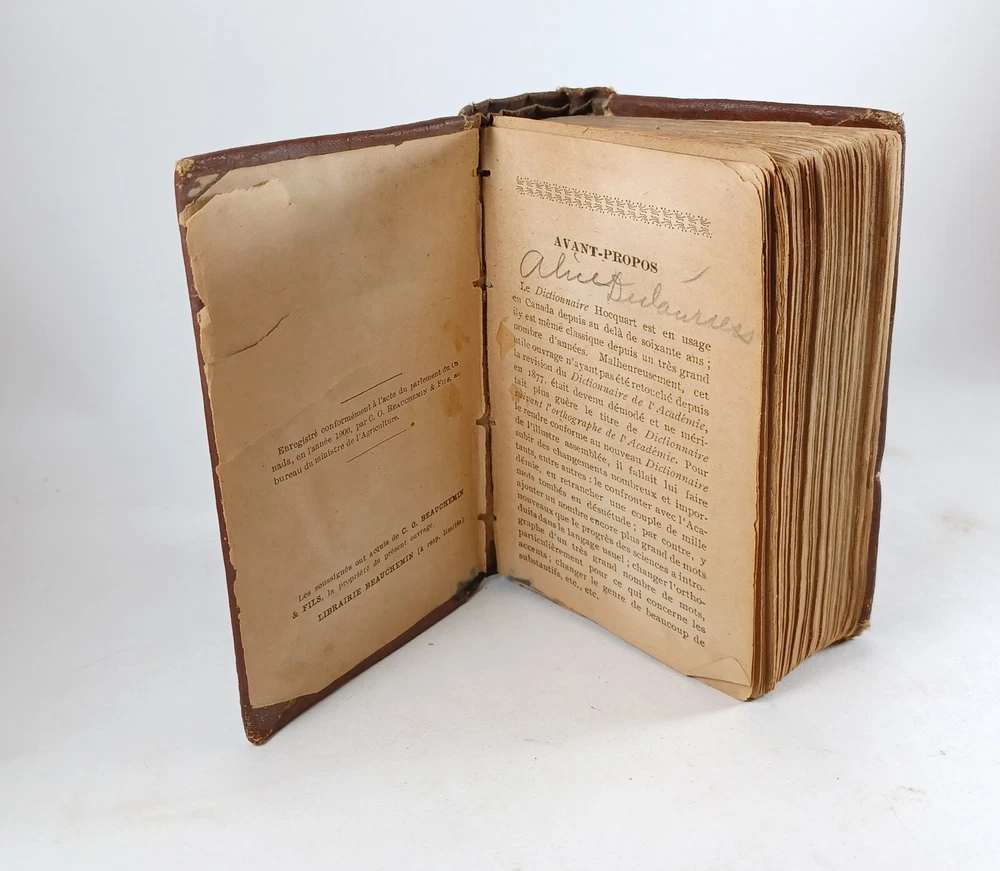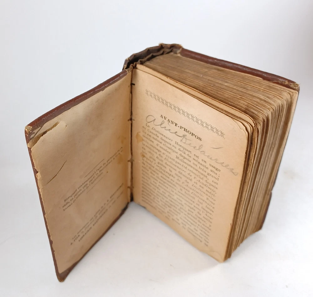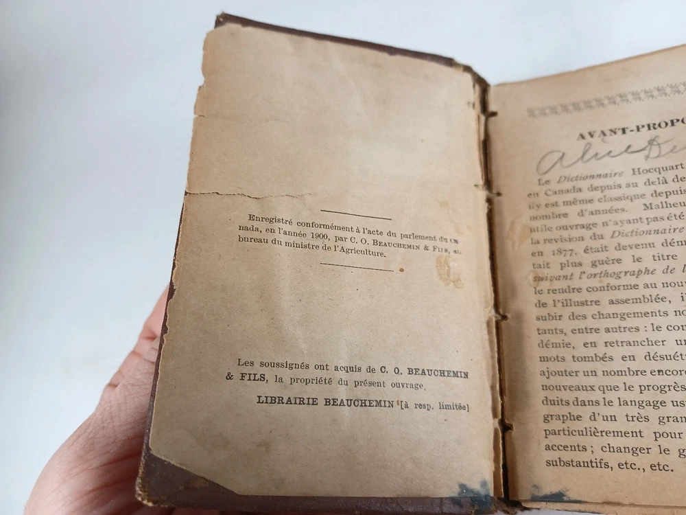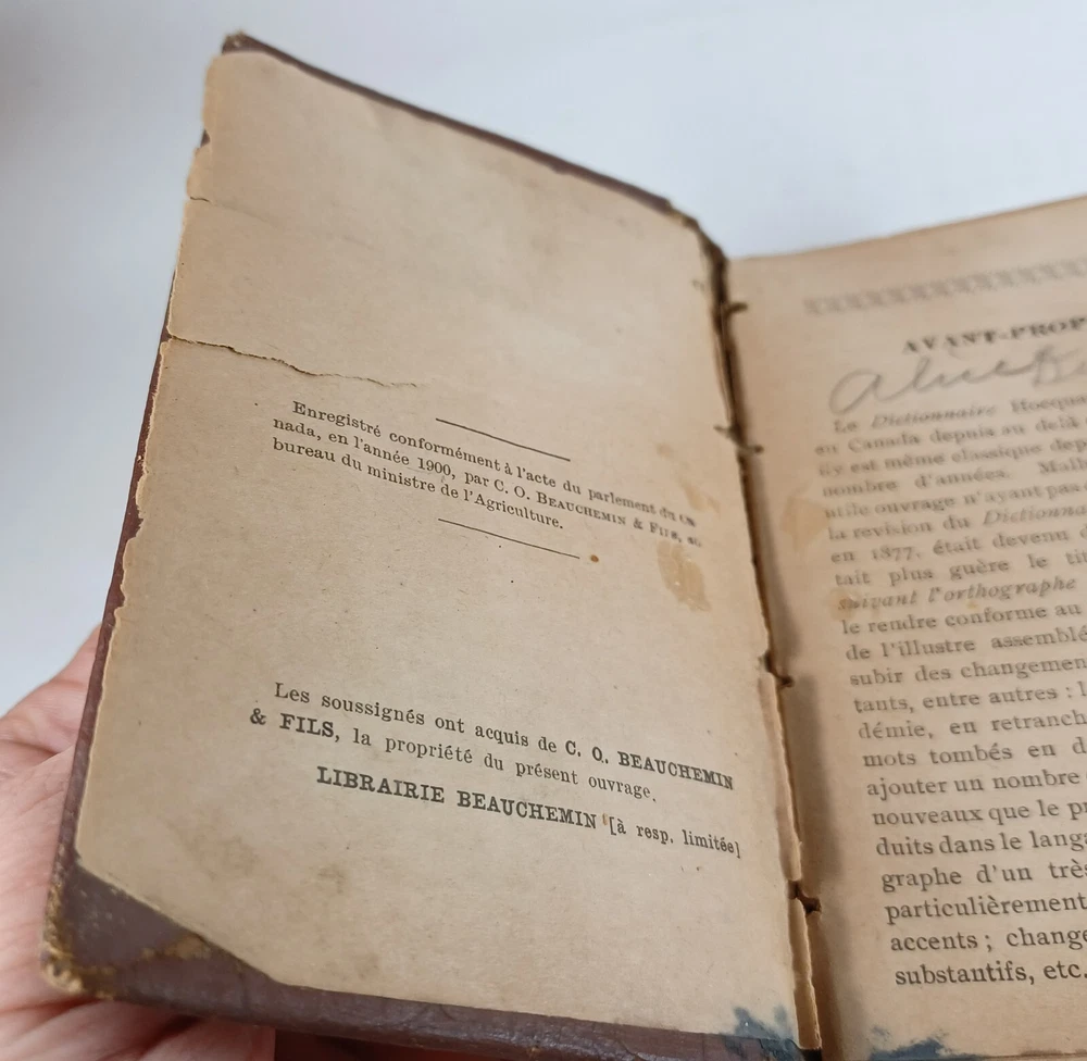 Please review all pictures for overall condition and size, as this helps form the overall condition/description of the item. Wear is consistent with age and use. Binding is a bit loose on the front and back pages. The further into the book you go, the tighter the binding is. The first and last pages are stuck to the inside cover, so that is covering up some information. Pages feel good to flip through. Measures 5" X 3.25" X 1.5" thick. Nice alligator skin texture to the binding. Very interesting book when we translated the first few pages. Please, message us with any questions, we respond fast. Thanks Most orders will ship out within 24 hours or same day after payment. ******************************************************* We translated the first few pages. They read: "Registered in accordance with the Act of Parliament de on nada, in the year 1900, by CO BEAUCHEMIN & Fire Office of the Minister of Agriculture. The undersigned have acquired from C. Q BEAUCHEMIN & FILS, ownership of this work. BEAUCHEMIN BOOKSTORE resp. limited" "FOREWORD The Hocquart Dictionary has been in use in Canada for over sixty years; it has even been classic for a very large number of years. Unfortunately, this useful work having not been retouched since the revision of the Dictionary of the Academy in 1877, had become out of fashion and no longer deserved the title of Dictionary of Spelling of the Academy. To make it conform to the new Dictionary of the illustrious assembly, it was necessary to make it undergo numerous and important changes, among others: to confront it with the Academy, to remove a couple of thousand words which had fallen into disuse, on the other hand, add an even greater number of new words that the progress of science has introduced into everyday language; change the spelling of a very large number of words, particularly with regard to accents; change the gender of many nouns, etc., etc." "It was still necessary, out of respect for the en. age and youth, eliminate certain offensive words which should not appear in a book intended for schools. This is what we have done with particular care: the book can now be placed, without inconvenience, in the hands of all kinds people. The task that we imposed on ourselves in the overhaul of this work undertaking was more difficult and more considerable than one would believe at first glance. Did we bring it to a successful conclusion? The public will be our judge. If his judgment is favorable to us, as we dare to hope, we will believe ourselves sufficiently rewarded for the work that the revision of this dictionary cost us J.-M. VALOIS Montreal, April 26, 1900.