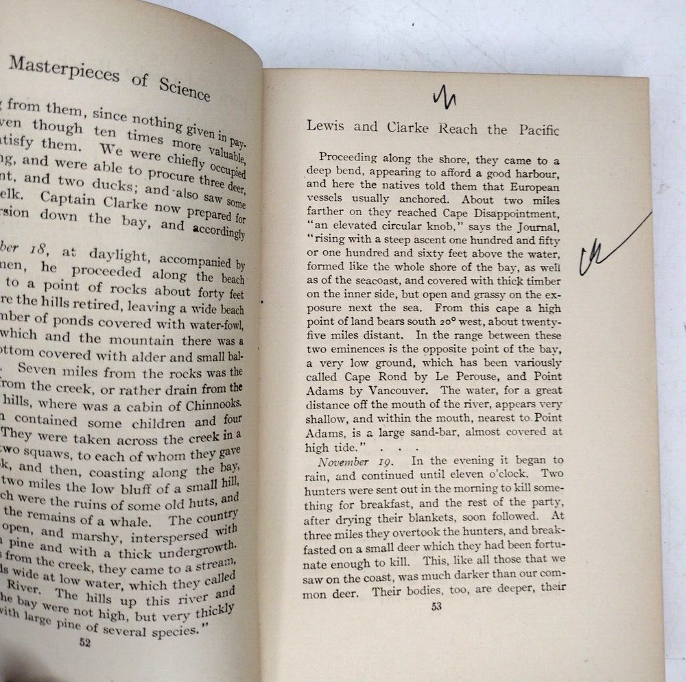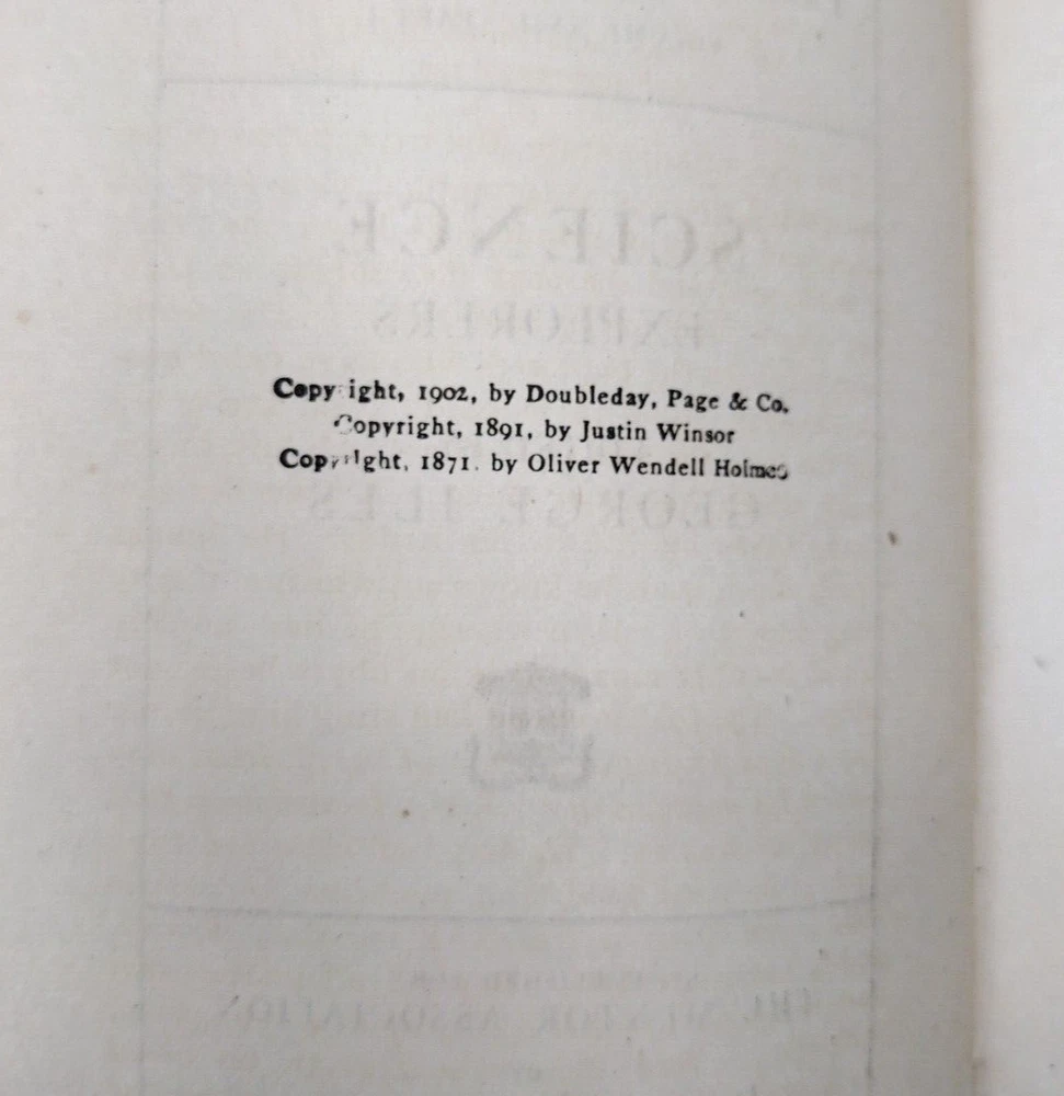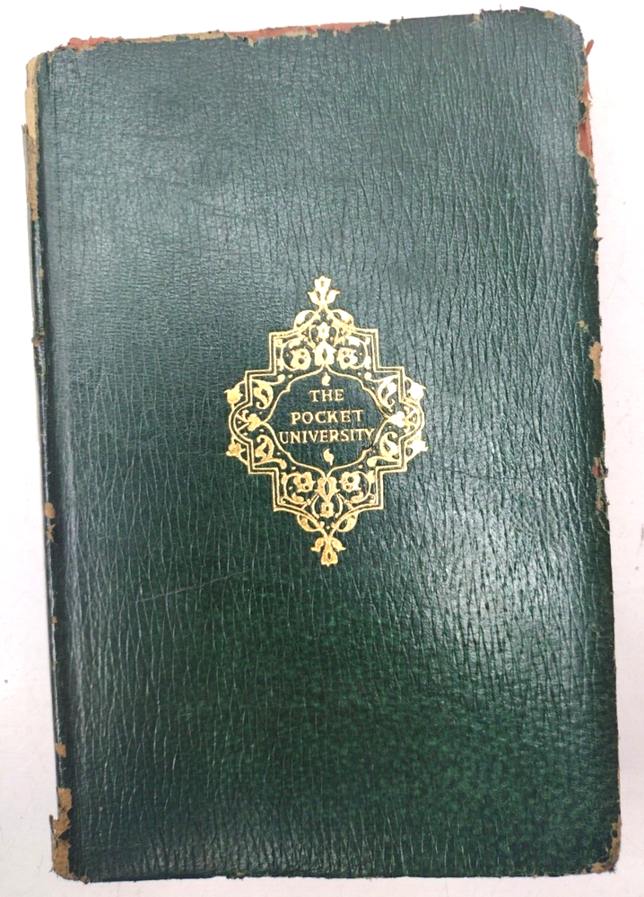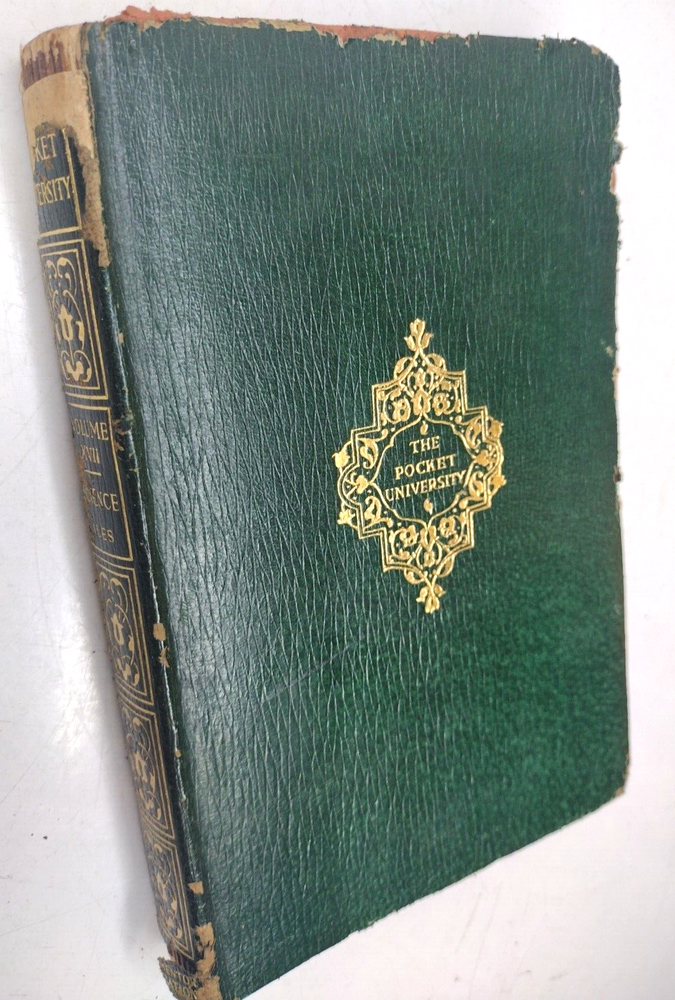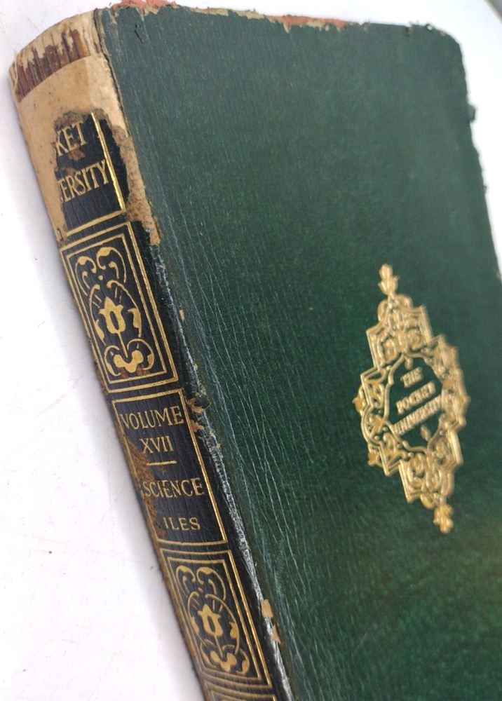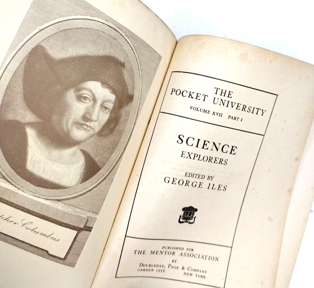Antiquarian 1902 The Pocket University Volume XVII Part 1 Science Explorers, edited by George Iles; Published for The Mentor Association by Doubleday; Green leather bound with gold accents, 191 pages; 6.5" x 4.5" x .75"; Cover in fair condition, spine and pages in good condition (see photos).