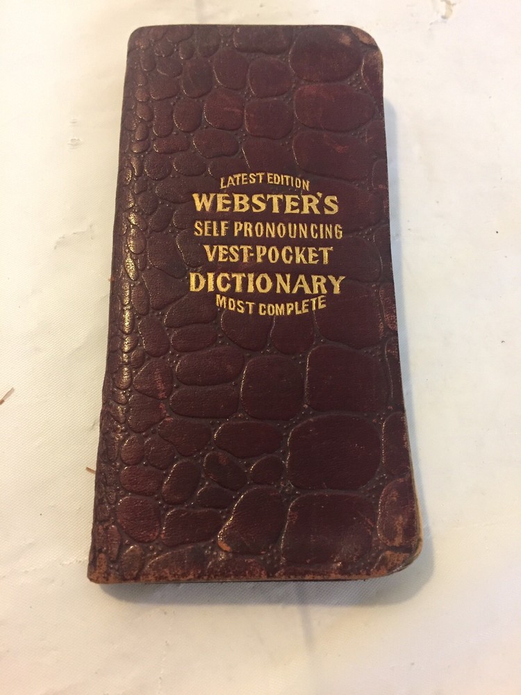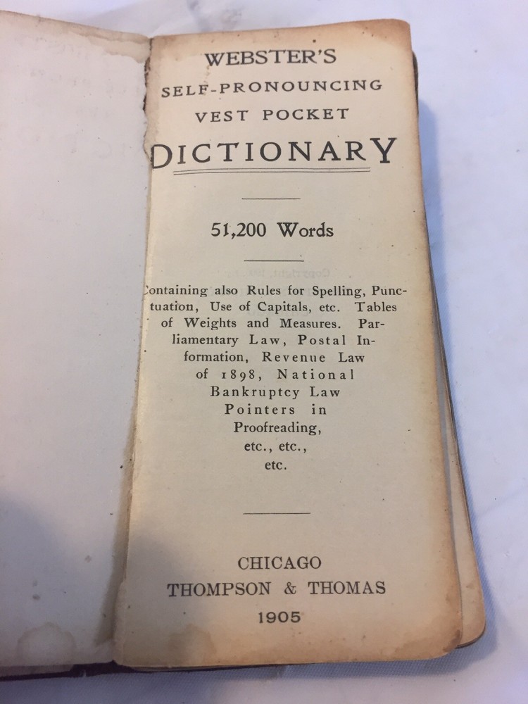 Antique 1905 Webster Dictionary Vest Pocket Self-Pronouncing Black Leather Bound Copyright 1900 by Thompson & Thomas Chicago Binder has come loose. Please view all photos to see Condition. Thanks for ...