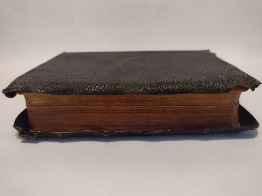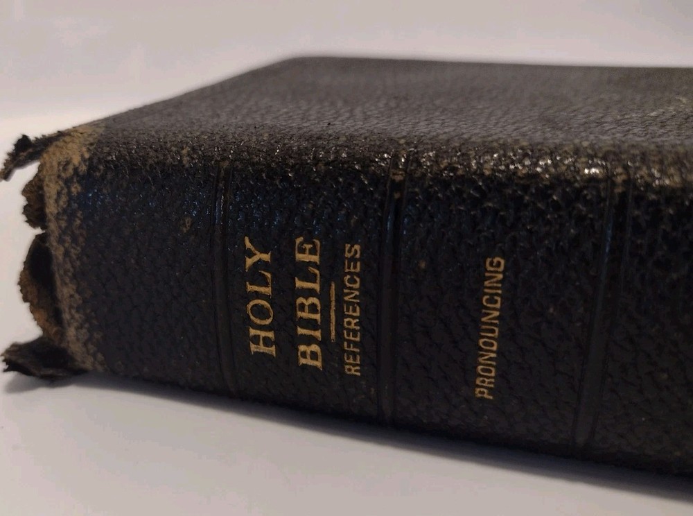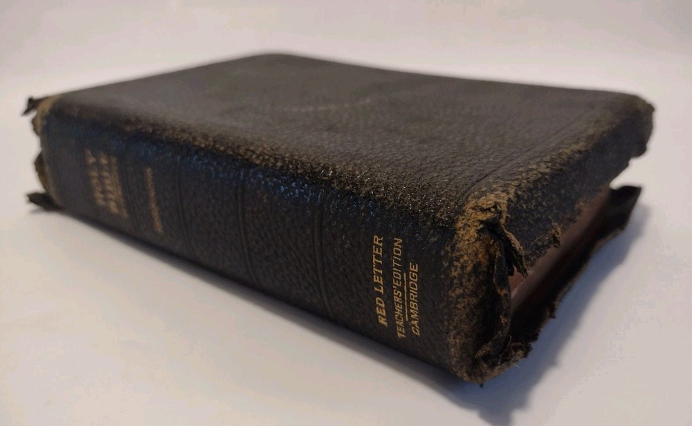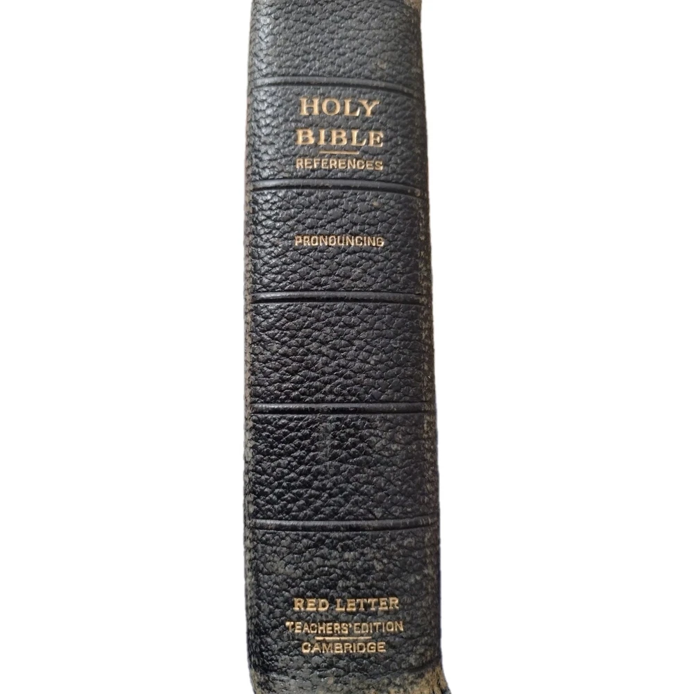 This antique 1910 Bible is a valuable addition to any collection. The black leather binding is in excellent shape and the red letter edition adds to its value. Published by Cambridge University Press, this Bible is an original is a pronouncing teacher's edition. The Bible is written in English. It has a place of publication in Great Britain. This Bible is a great find for collectors and those interested in religious literature. It has a compact size of 6.5 in x 5 in. It has some writing in the back as shown in the photos and also includes various maps in the back. it is in very good condition and has some loose pages but can still be used. See photos for conditioning details.
