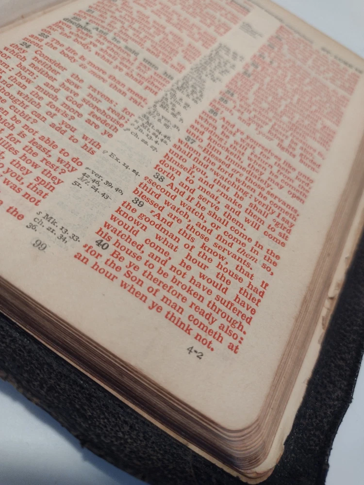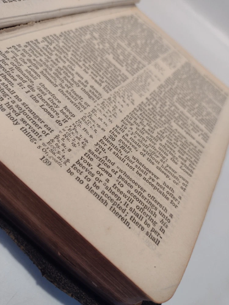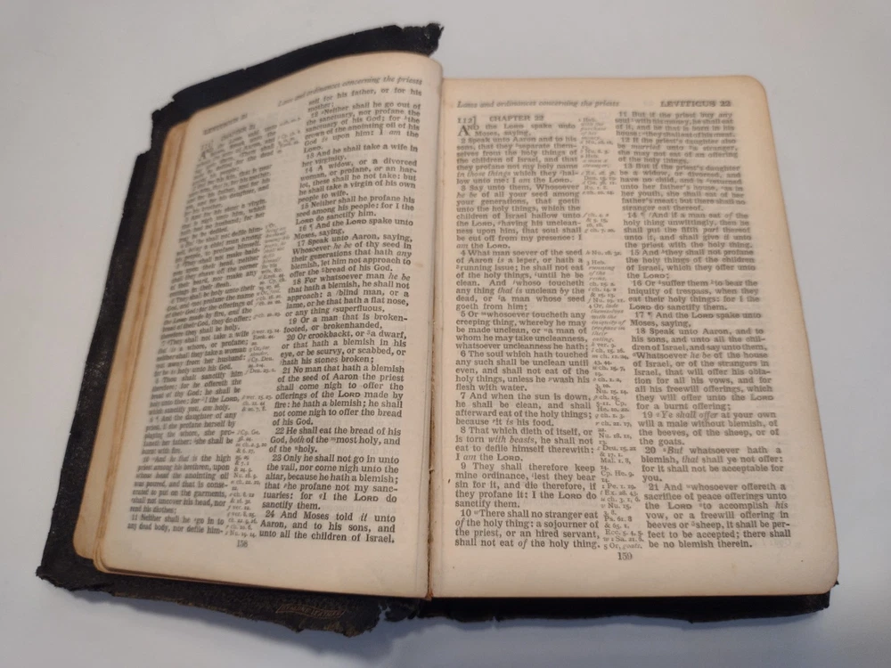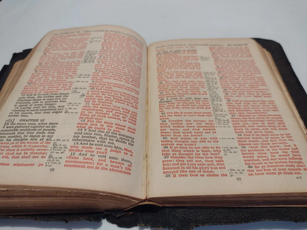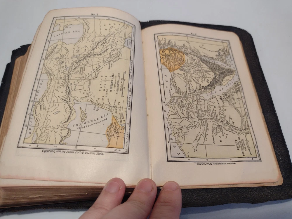 This antique 1910 Bible is a valuable addition to any collection. The black leather binding is in excellent shape and the red letter edition adds to its value. Published by Cambridge University Press, this Bible is an original is a pronouncing teacher's edition. The Bible is written in English. It has a place of publication in Great Britain. This Bible is a great find for collectors and those interested in religious literature. It has a compact size of 6.5 in x 5 in. It has some writing in the back as shown in the photos and also includes various maps in the back. it is in very good condition and has some loose pages but can still be used. See photos for conditioning details.
