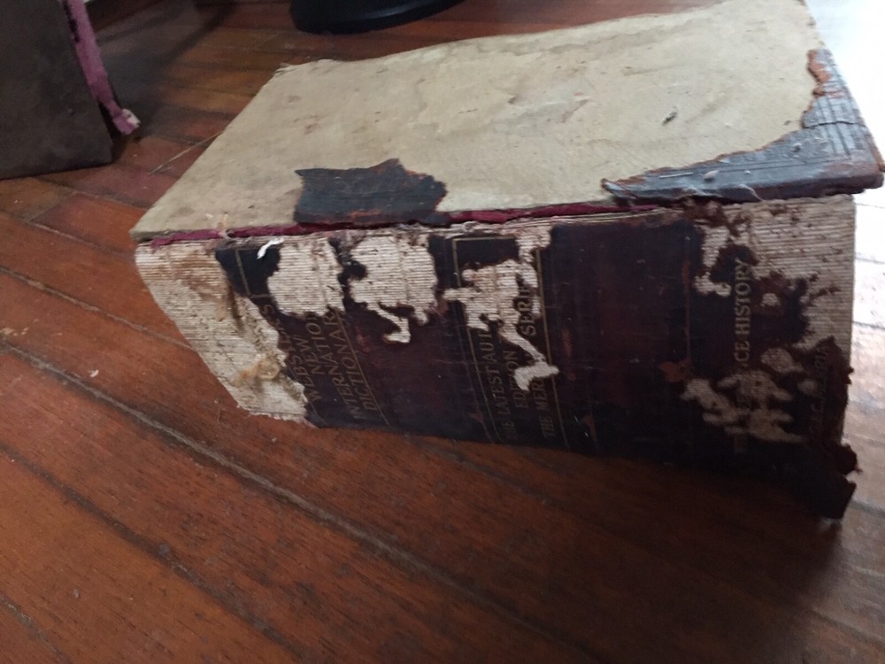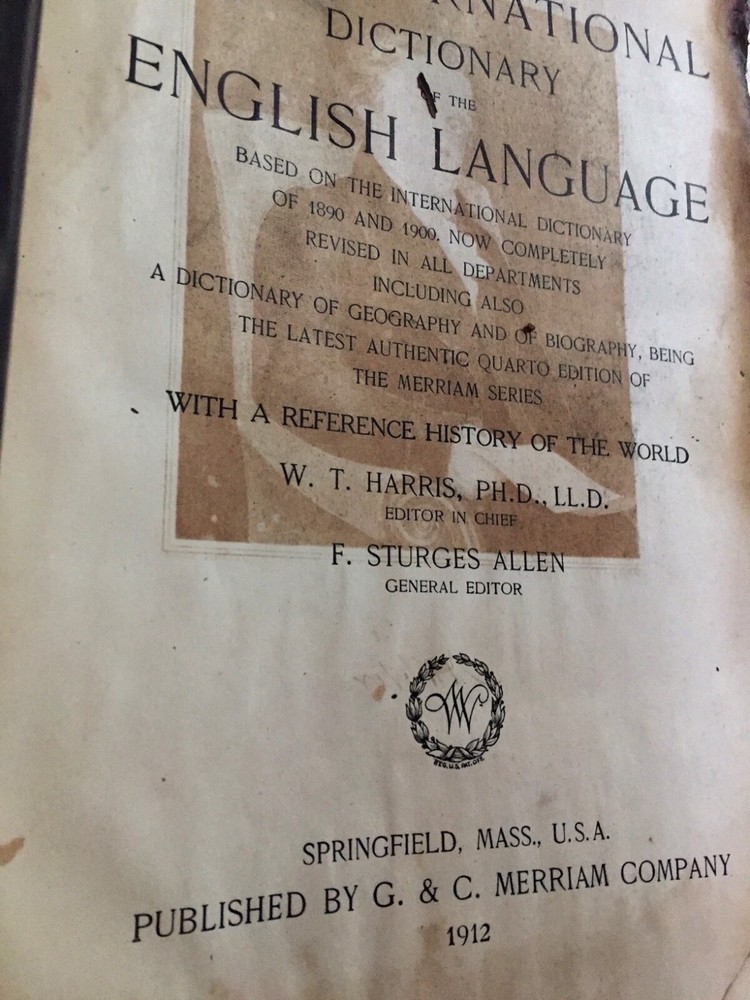 Antique 1912 Websters International Dictionary with Reference History Merriam Copyright 1890 This Antique 1912 Websters International Dictionary with Reference History Merriam is a great old dictionary . . Front and back cover separated-- great M red marbleized inner paper! .. spine in bad shape. Tiffany & Co Merriam The pages are darkened and faded from age burned edges . Nice illustrations throughout This is a very large Dictionary with over 1200 pages Size . It is 10 1/2” tall by 8 1/2” wide About 4 inches thick. Can send Media Mail More PHOTOS COMING SOON!
