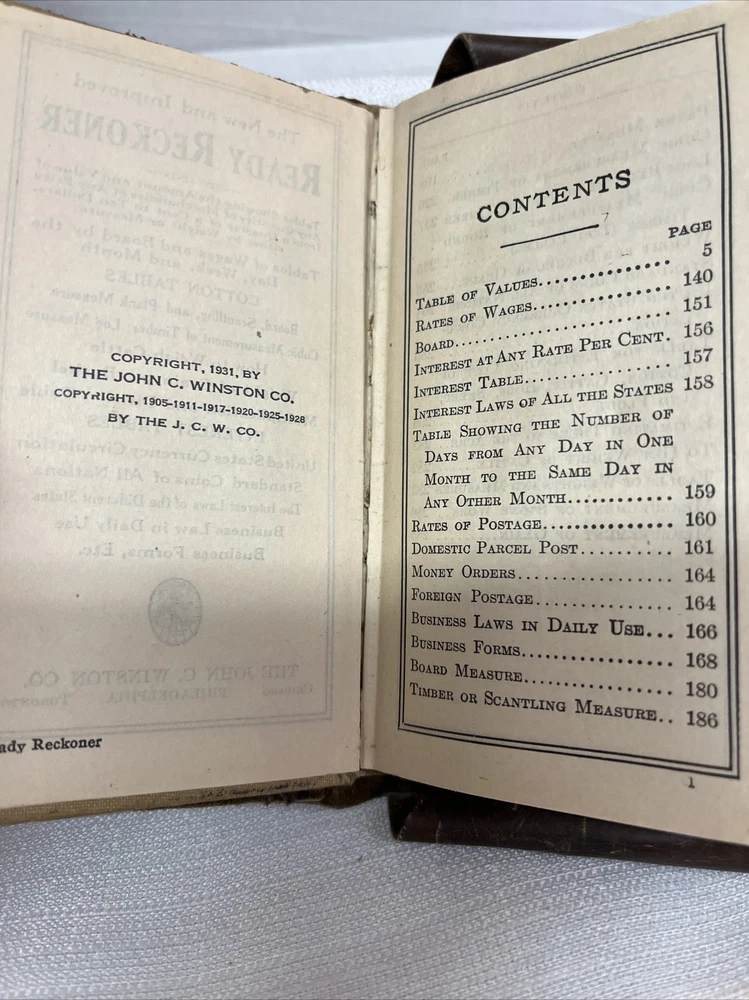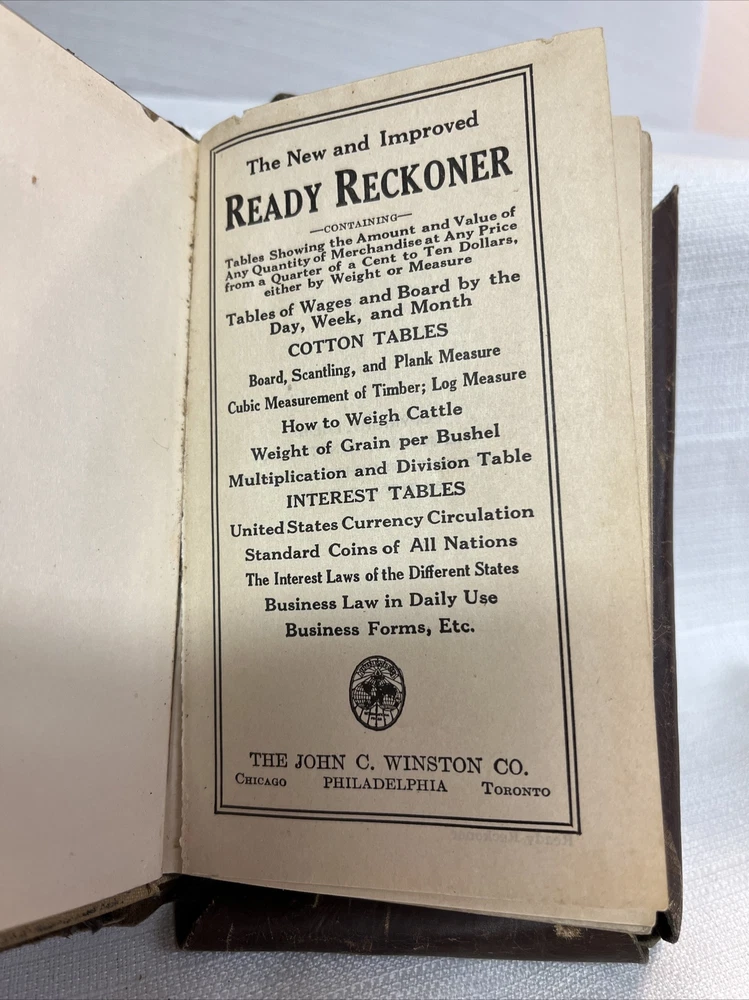 This antique leather bound book from 1931 is a true gem for collectors and enthusiasts alike. Published by The John C. Winston Co., this book titled "The Ready Reckoner Guide" is a valuable reference on tables showing amounts and values. The binding is made of high-quality leather, lending a timeless elegance to the book. It is written in English and is not signed by anyone. The book falls under the categories of Books & Magazines and Antiquarian & Collectible. Add this valuable piece to your collection today!
