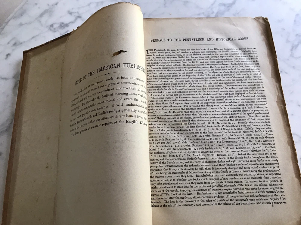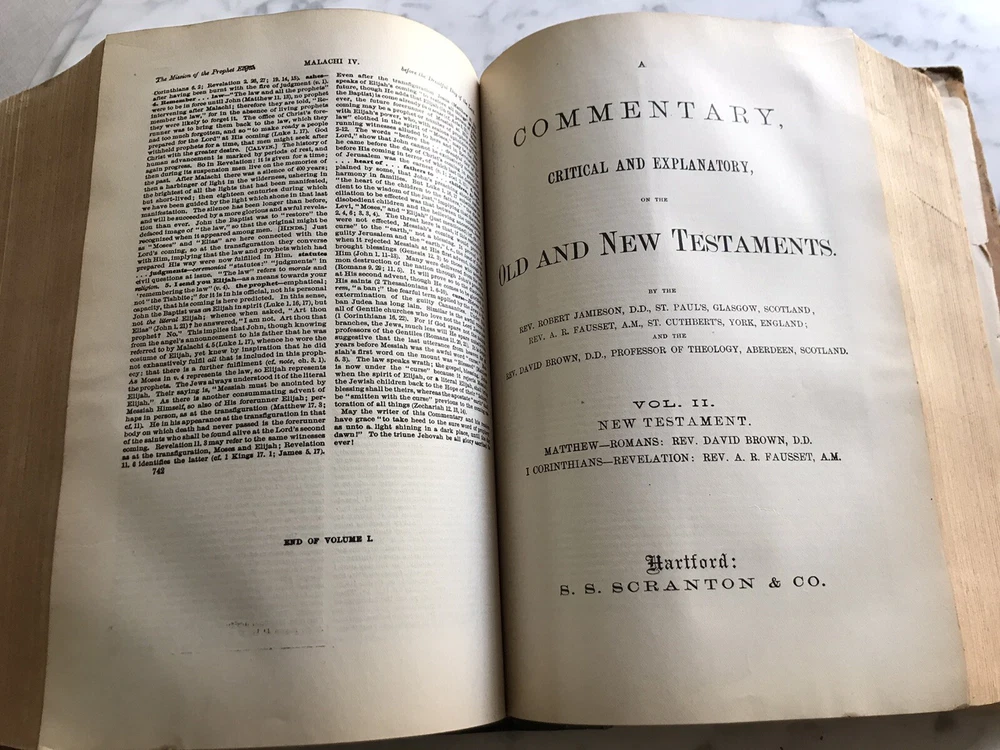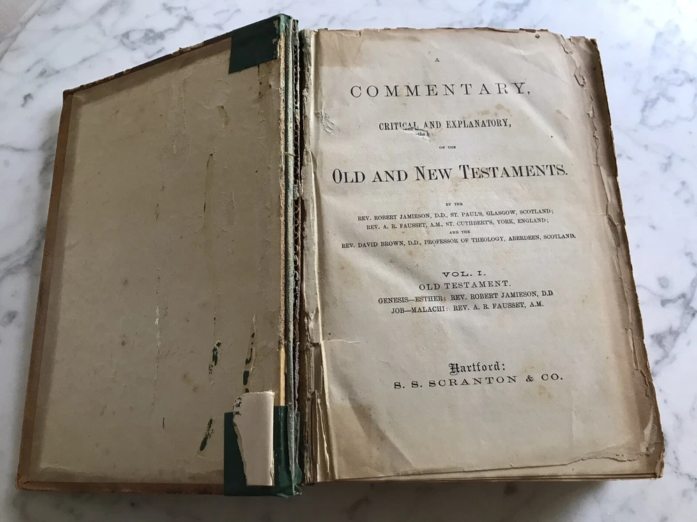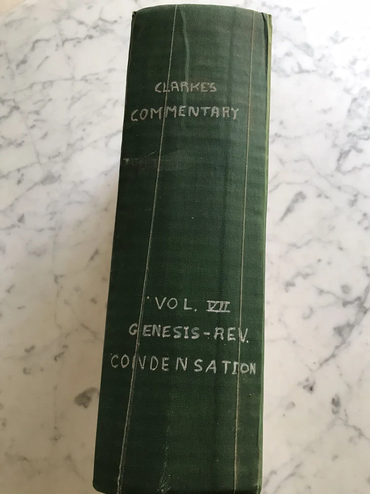 Leather bound Adam Clarke condensed commentary on the Old and New Testaments. Lots of evidence of age, use, and wear. Missing front pages but text appears to be complete. Some loose pages. Previous owner repaired spine with colored tape -- selling "as found." Large, heavy book measures approx. 8" x 11." Not new. Stains, loose pages - but appear to be complete. Found at a local estate sale. Being sold "as found." Be sure to inspect the photos. Signs of age and use. No publication dates but obviously old. 1905 ownership details inside. Evidence of age (see photos). Send questions prior to bidding. Shipping by USPS.