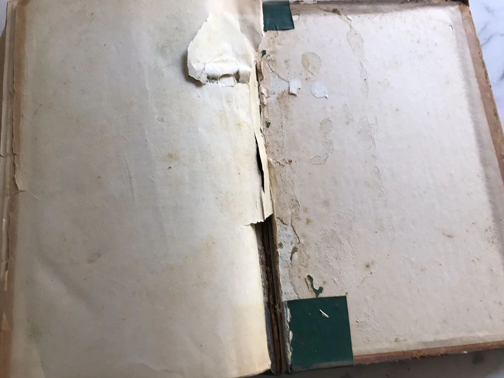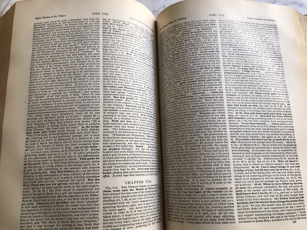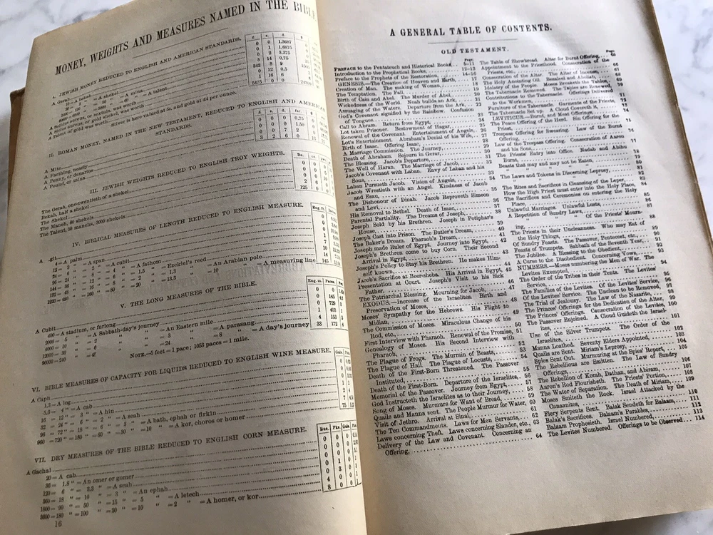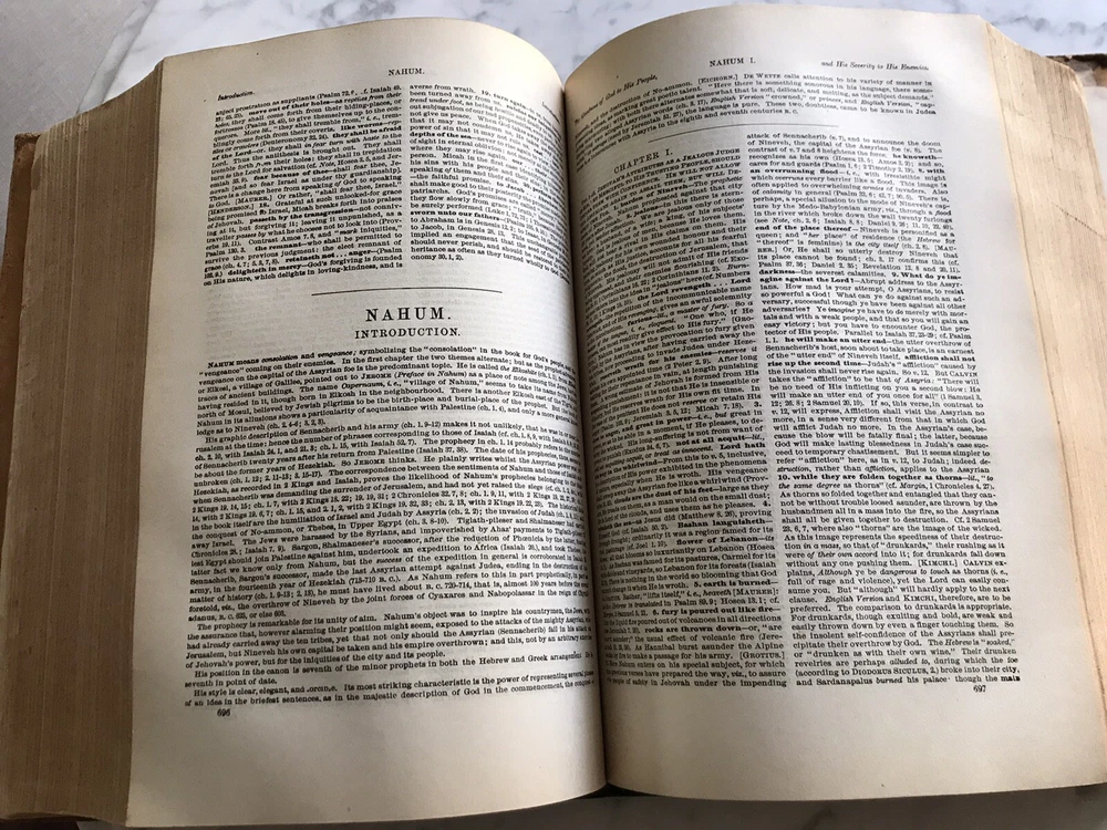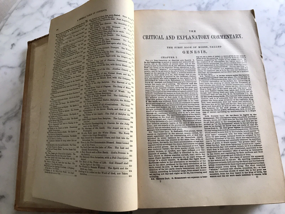 Leather bound Adam Clarke condensed commentary on the Old and New Testaments. Lots of evidence of age, use, and wear. Missing front pages but text appears to be complete. Some loose pages. Previous owner repaired spine with colored tape -- selling "as found." Large, heavy book measures approx. 8" x 11." Not new. Stains, loose pages - but appear to be complete. Found at a local estate sale. Being sold "as found." Be sure to inspect the photos. Signs of age and use. No publication dates but obviously old. 1905 ownership details inside. Evidence of age (see photos). Send questions prior to bidding. Shipping by USPS.