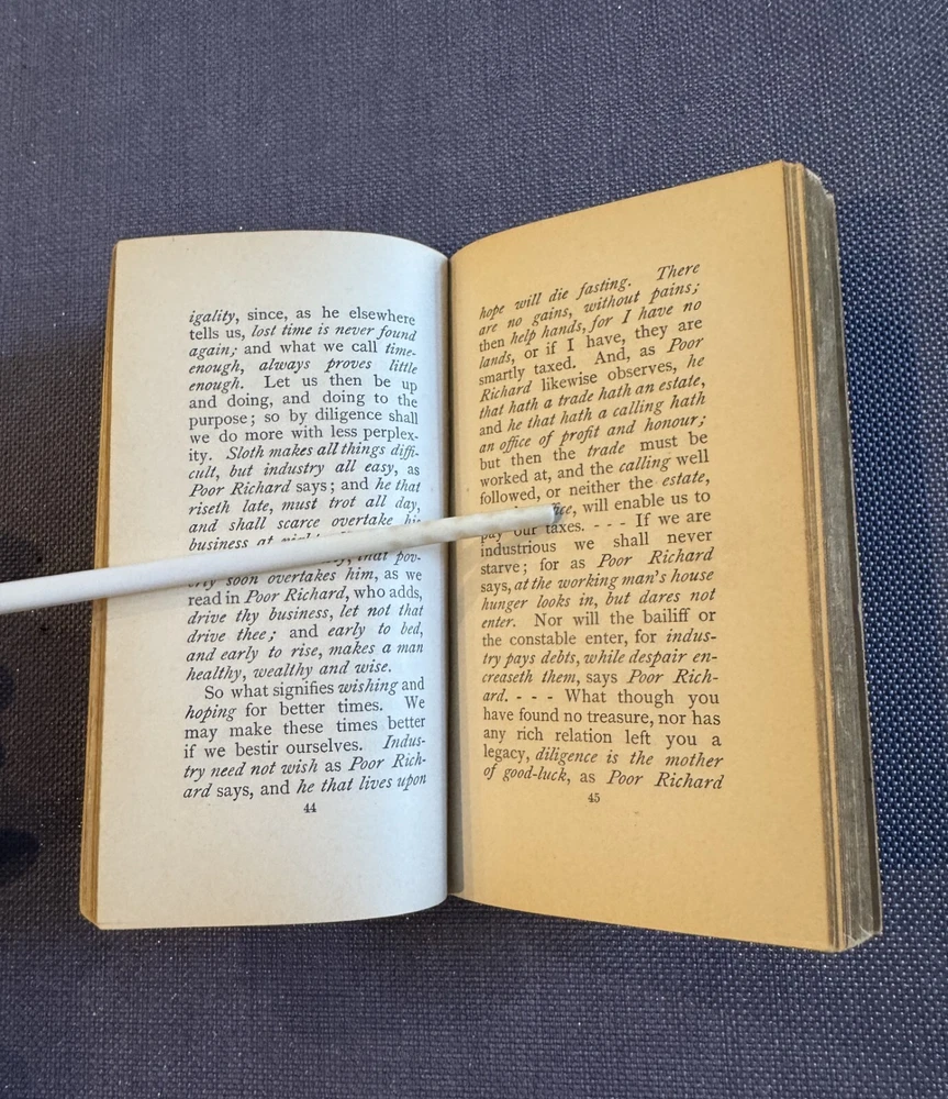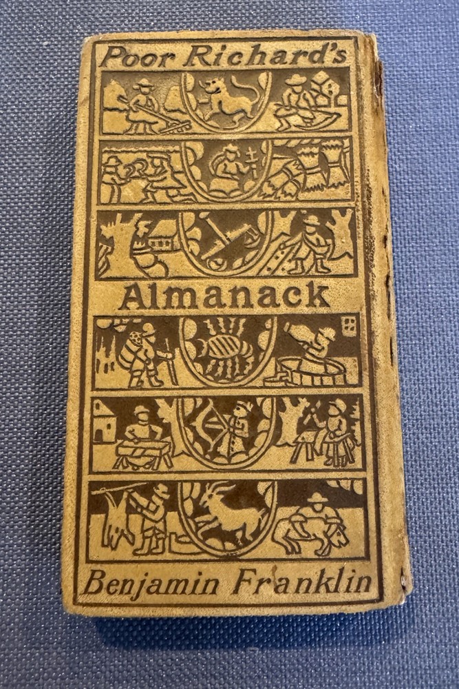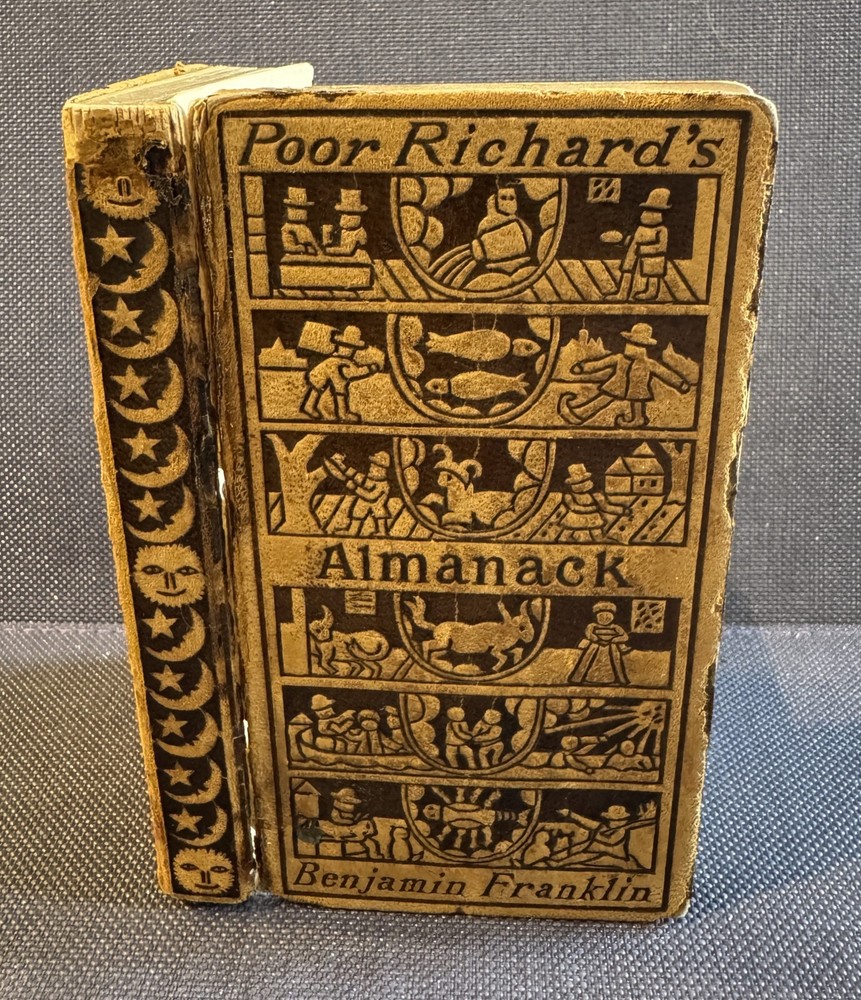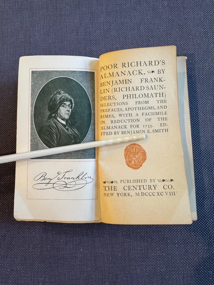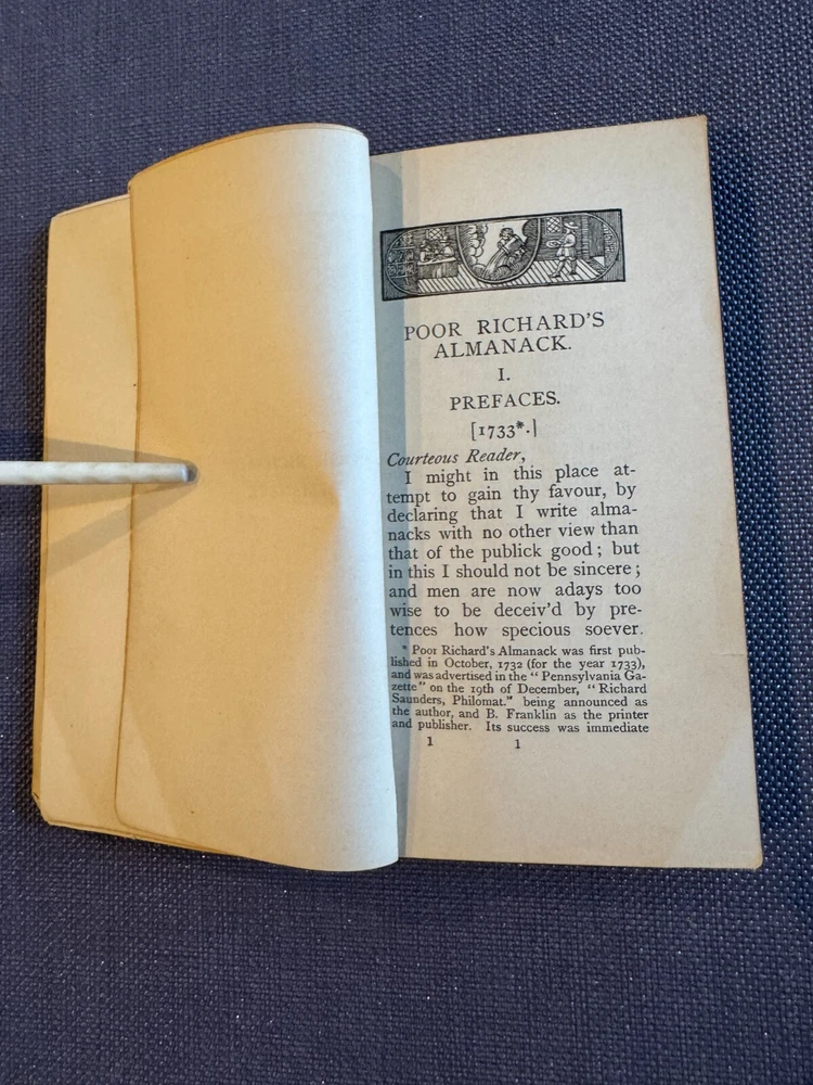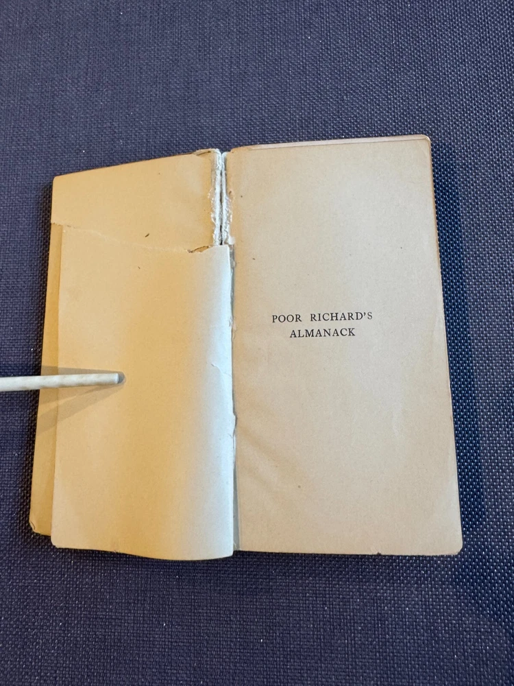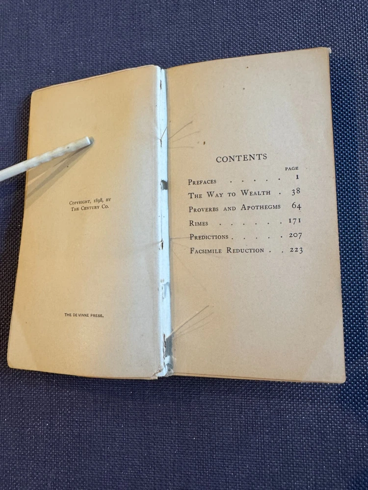 Antique Poor Richard’s Almanack by Benjamin Franklin leather edition printed by De Vinne Press in 1898. The book is in acceptable condition with a couple of splits in the binding, some wear on the top of the spine, 1 torn endpaper and a Brentano's bookstore sticker from Union Square, Manhattan, NYC. The book does not have any inscription, name plaque, writing or markings found by a spot check and the gold gilded page edges are in good condition. It is 5" by 2-7/8" with 221 numbered pages. Please view all the pictures for more information.