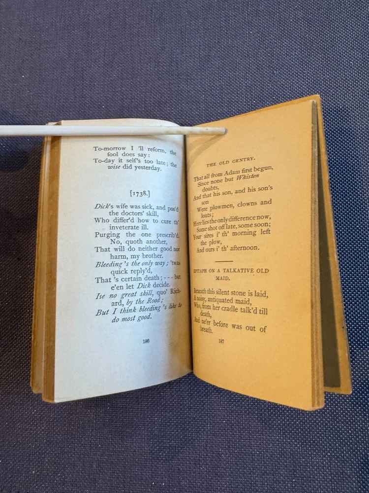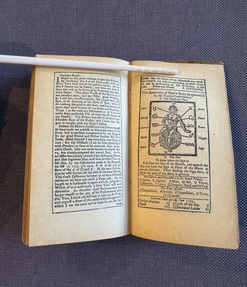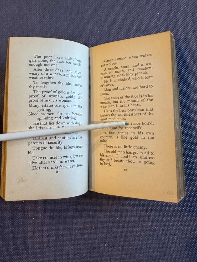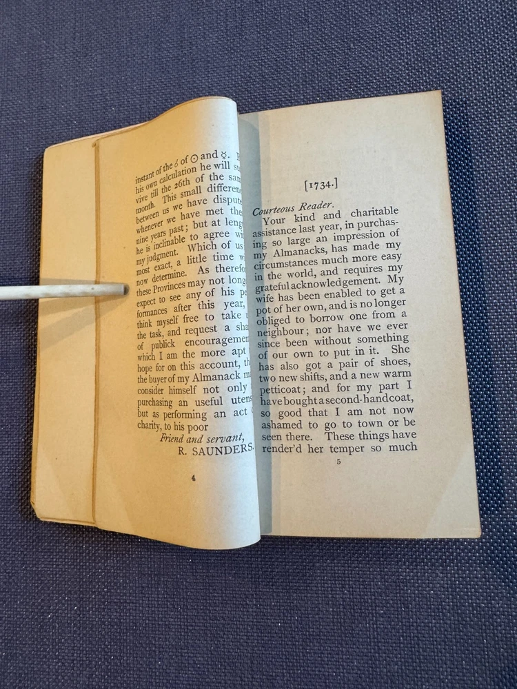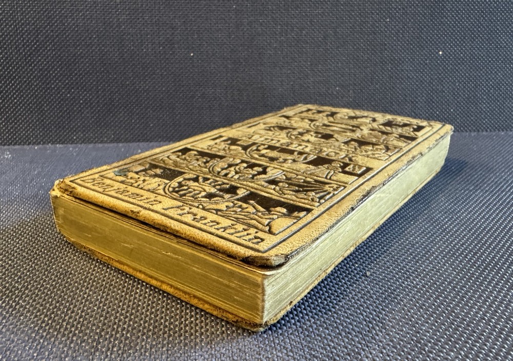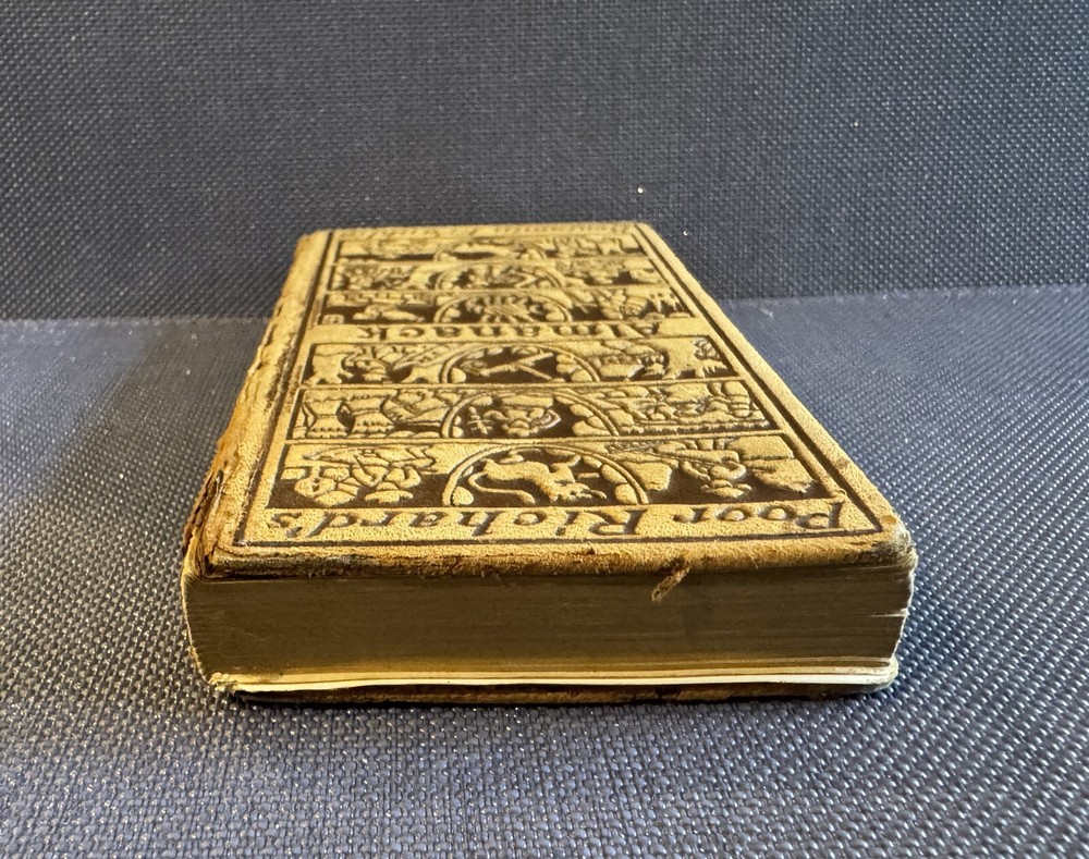Antique Poor Richard’s Almanack by Benjamin Franklin leather edition printed by De Vinne Press in 1898. The book is in acceptable condition with a couple of splits in the binding, some wear on the top of the spine, 1 torn endpaper and a Brentano's bookstore sticker from Union Square, Manhattan, NYC. The book does not have any inscription, name plaque, writing or markings found by a spot check and the gold gilded page edges are in good condition. It is 5" by 2-7/8" with 221 numbered pages. Please view all the pictures for more information.