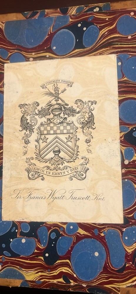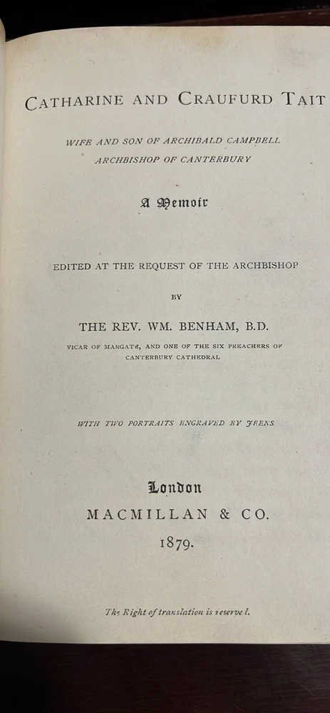 Antique rare Leather bound book With Sir Frances Wyatt Truscott Crest on inside cover. Published in London by Macmillan and Co. dated 1879. Two engravings with two portraits by Feens. Book material is a Memoir of wife and son of Archbald Campbell Archbishop of the Canterbury Cathedral.