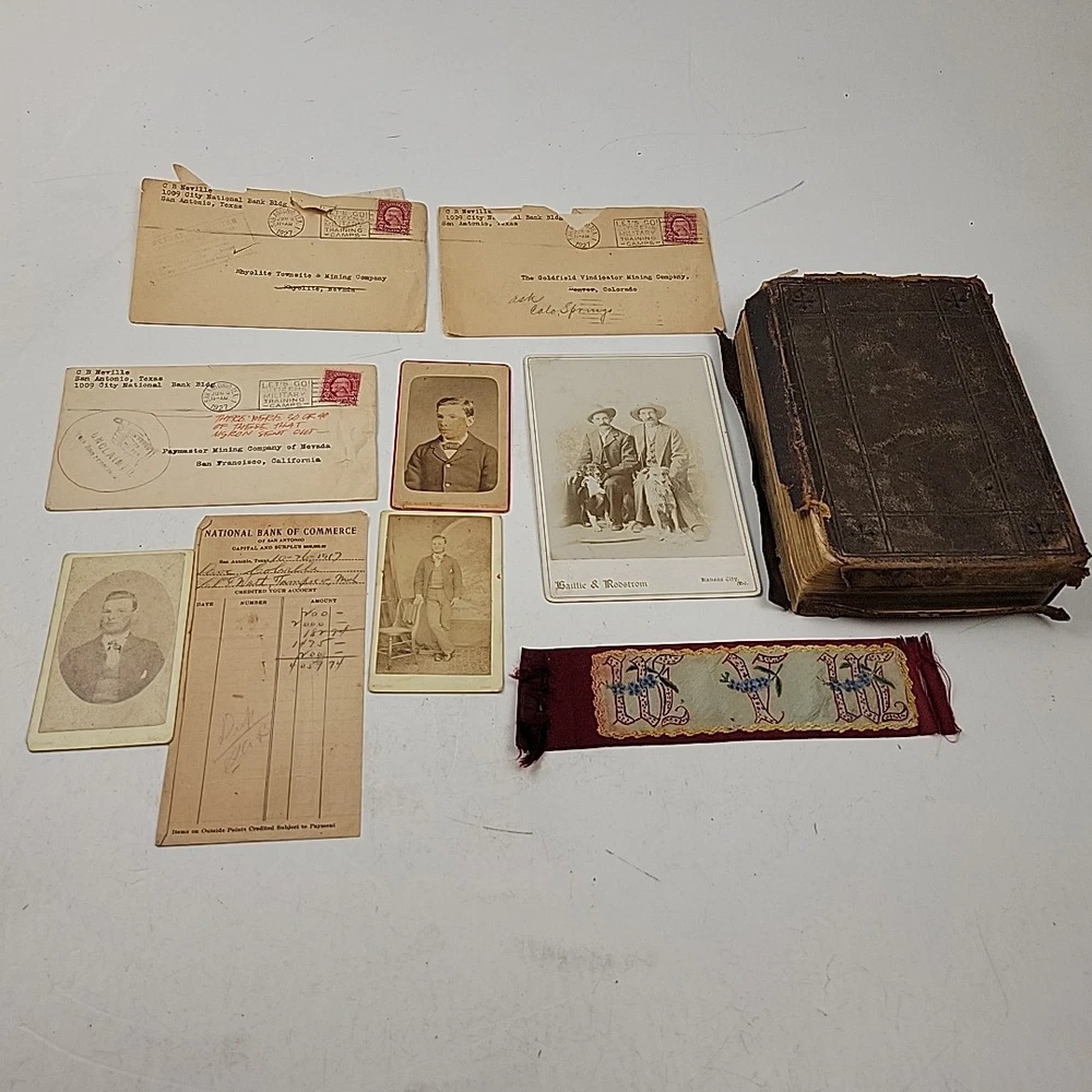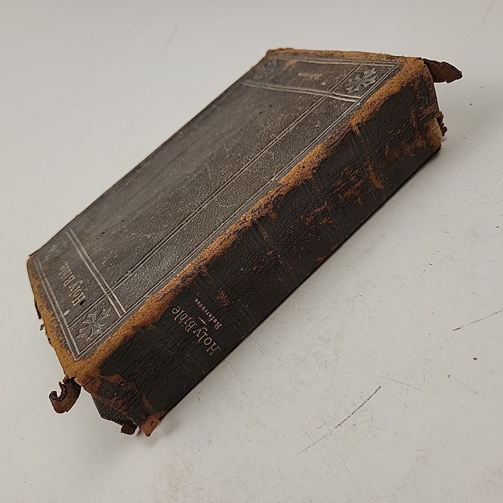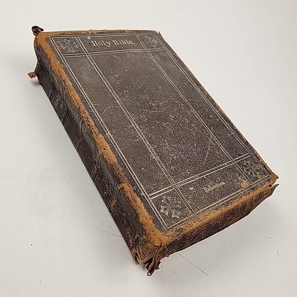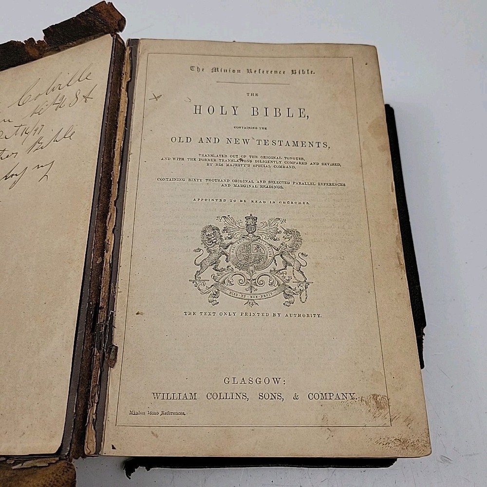 Minion Reference Bible • The Holy Bible Containing the Old and New Testaments (William Collins Sons & Co.). Bible is in poor shape but common for a 19th century bible. I can find no printed publication date but the inscription on the title facing page is from October 1897. I will include some of the letters and pictures ephemera found inside the pages of the Bible that were apparently from the original owner.
