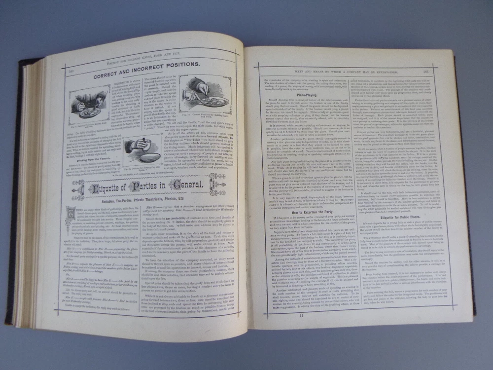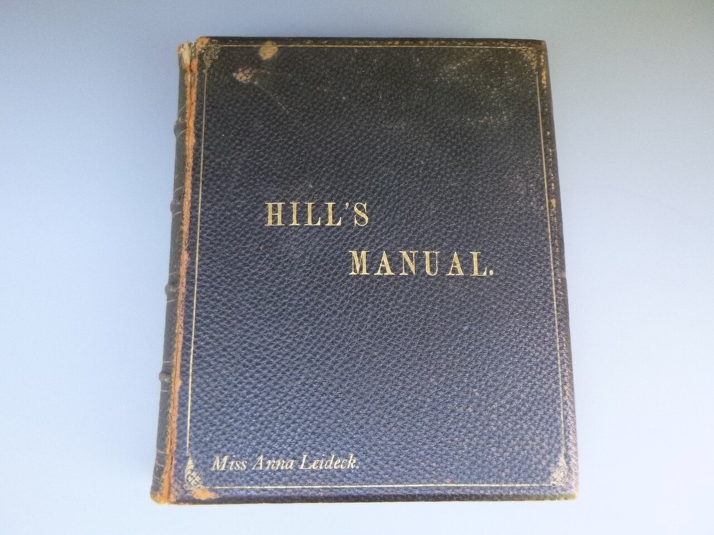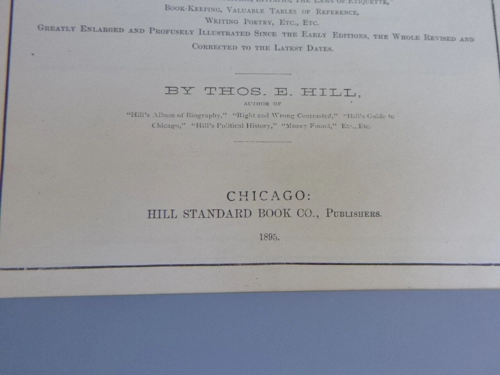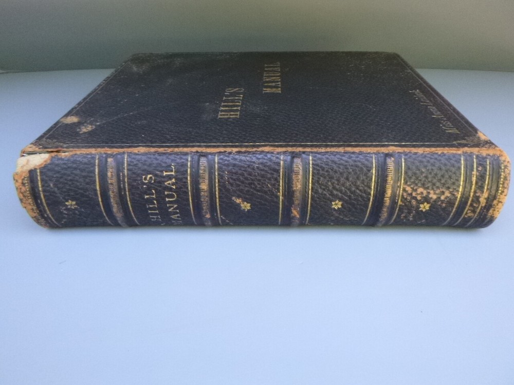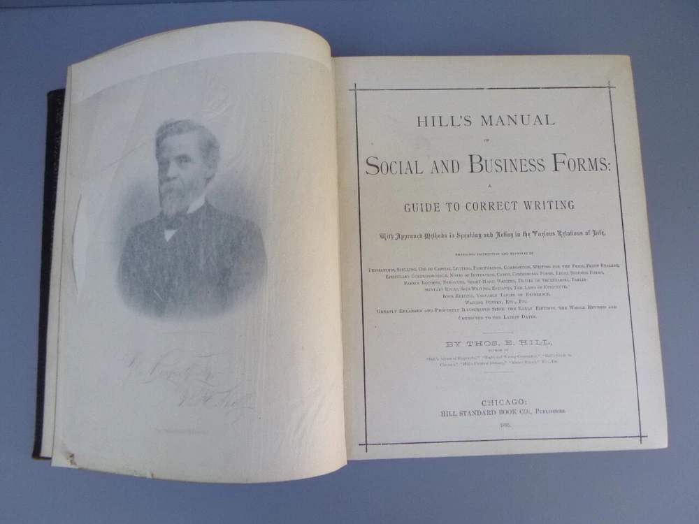 Antique Hill's Manual Social & Business Forms Thos Hill 1895 approx 10 in x 9 in 581 pages, gold gilt edges good with wear to cover/binding, age darkening to pages, light soil marks, (no writing) tear to tissue over plate