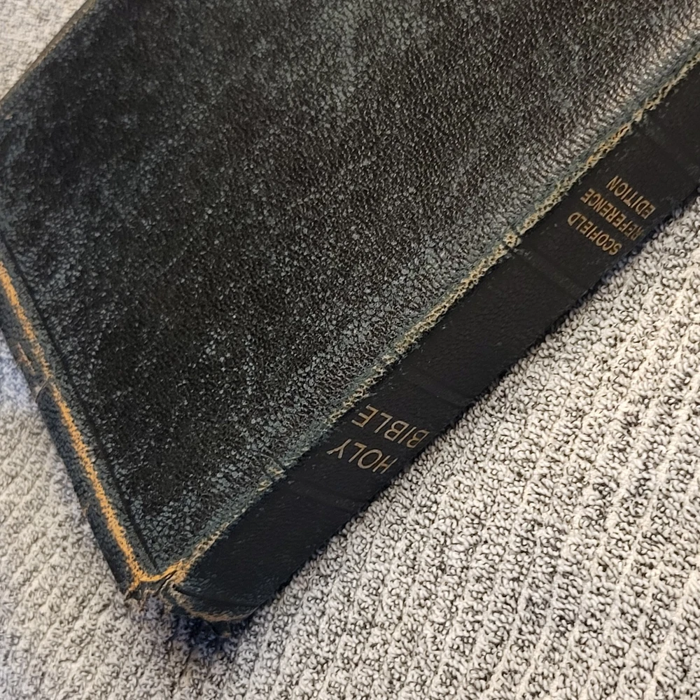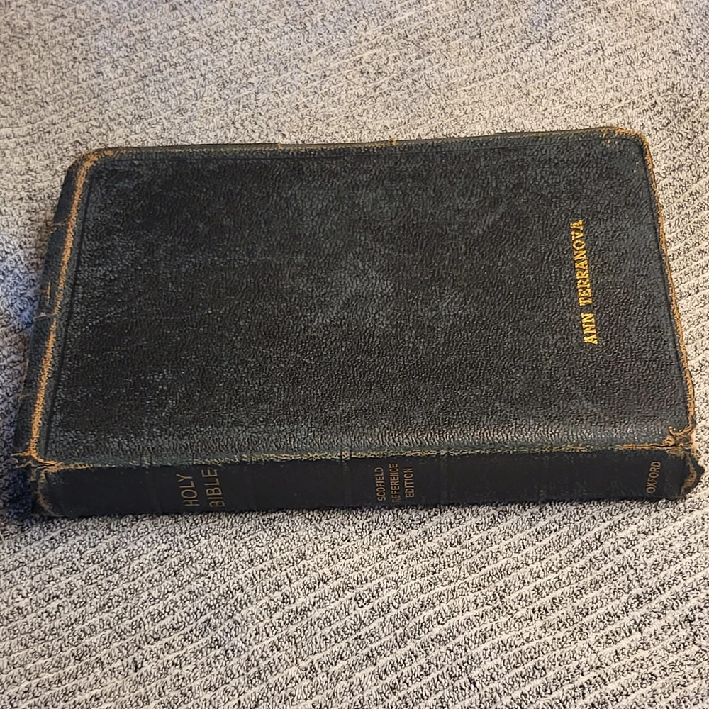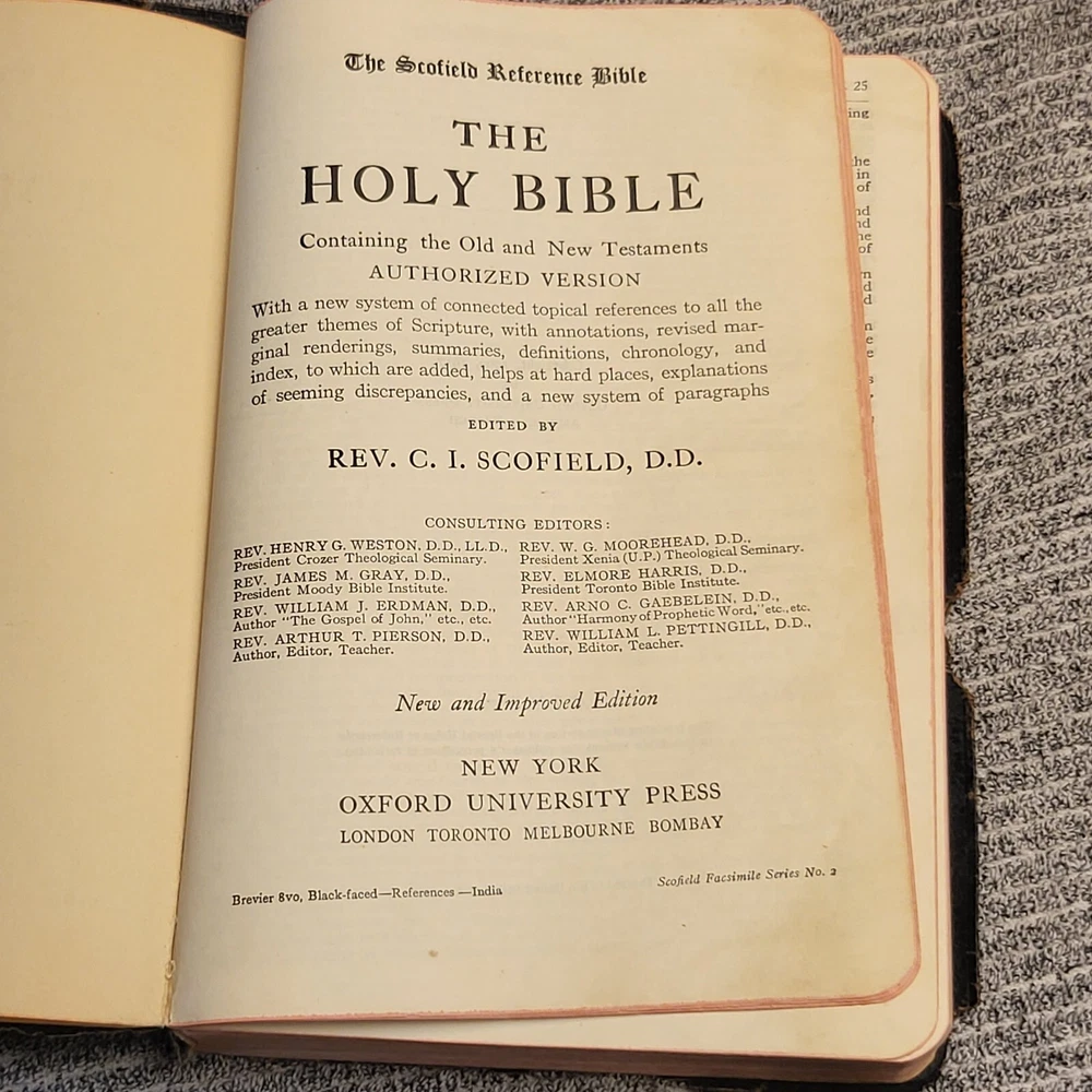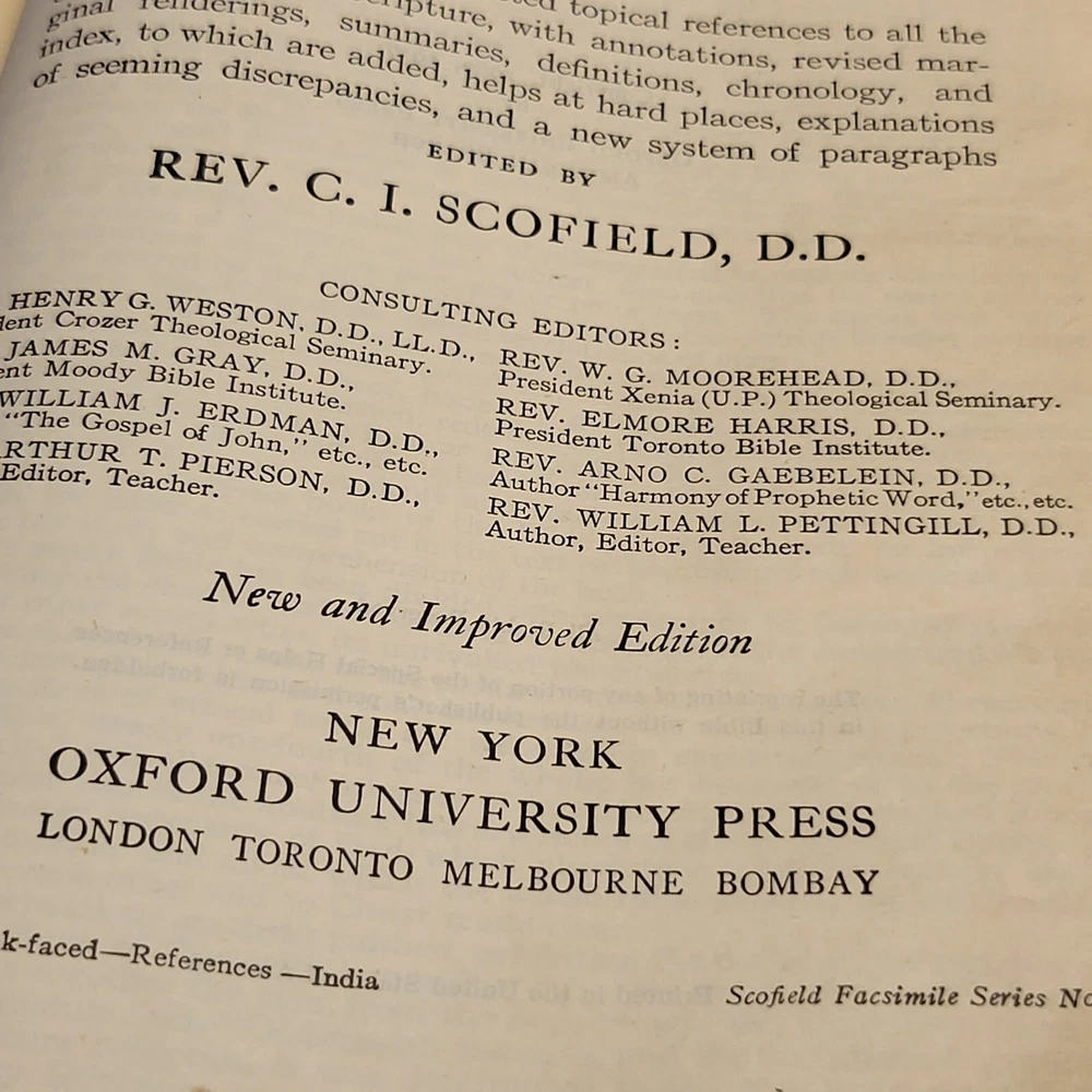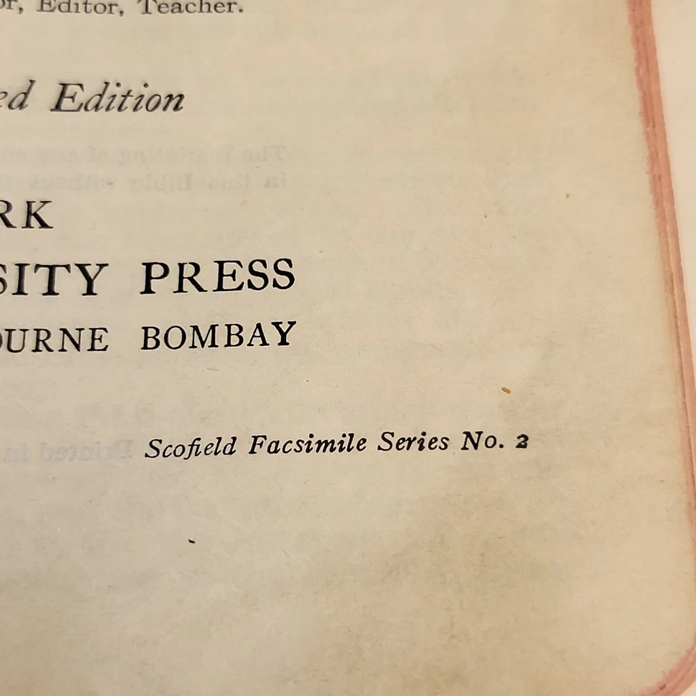 This 1917 edition Scofield Reference Bible, bound in black leather, offers a glimpse into historical scholarly interpretations of the Holy Scriptures. A collectible piece with handwritten notes and signs of age, it is a treasure for any bibliophile or religious historian. • Black leather binding • Authorized Version • Edited by Rev. C. I. Scofield • Published by Oxford University Press • Includes handwritten notes • New and improved edition *FLAWS: Loose binding, not completely separated Handwritten notes dated 1942, 1937, and 1948 Personalization stamped in gold on the front Edges and corners show wear... ~See all photos, and zoom in for full details