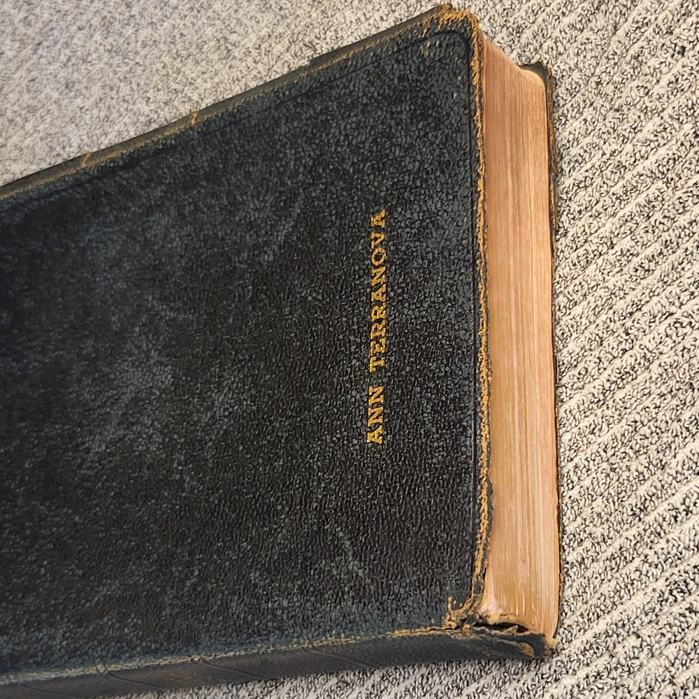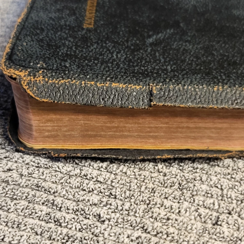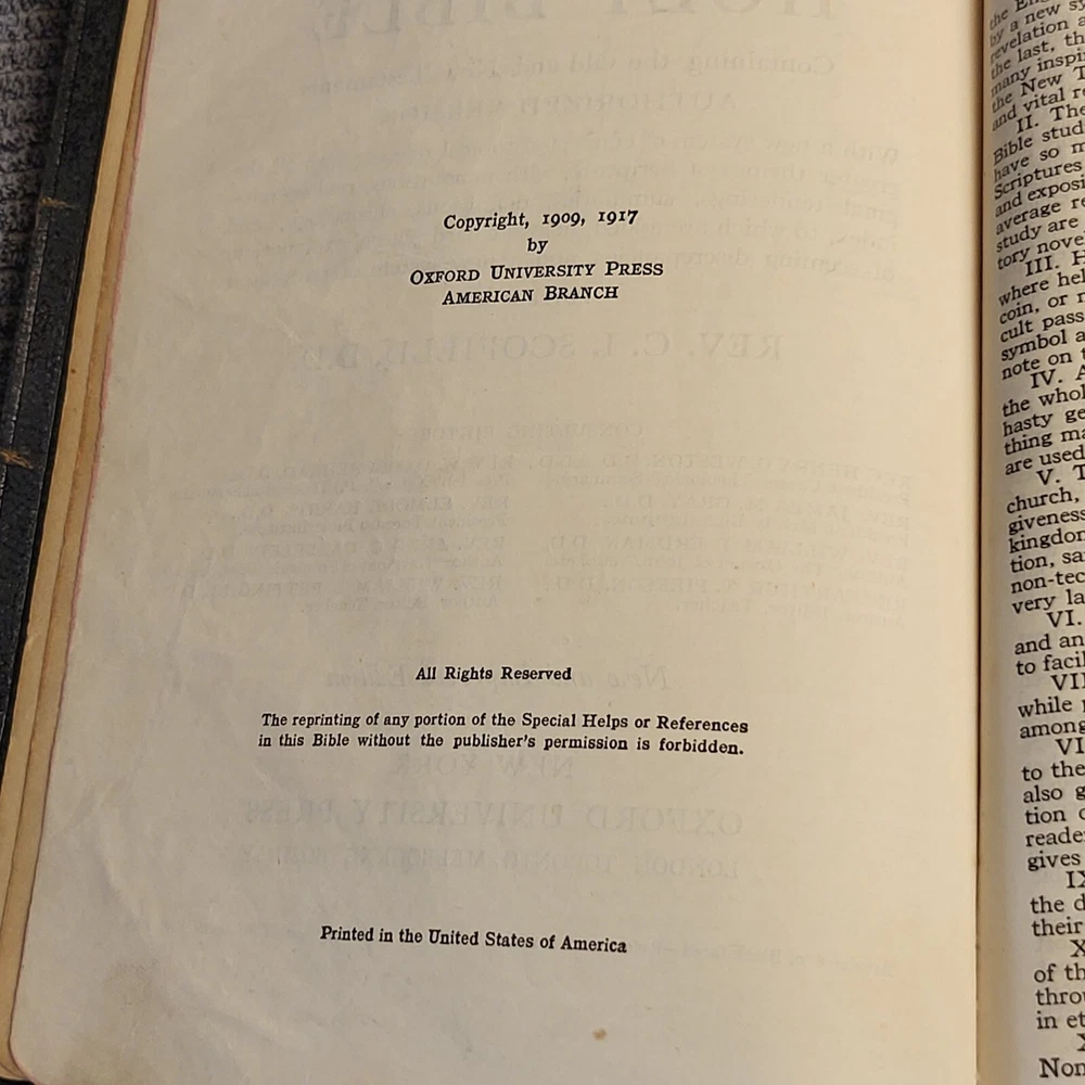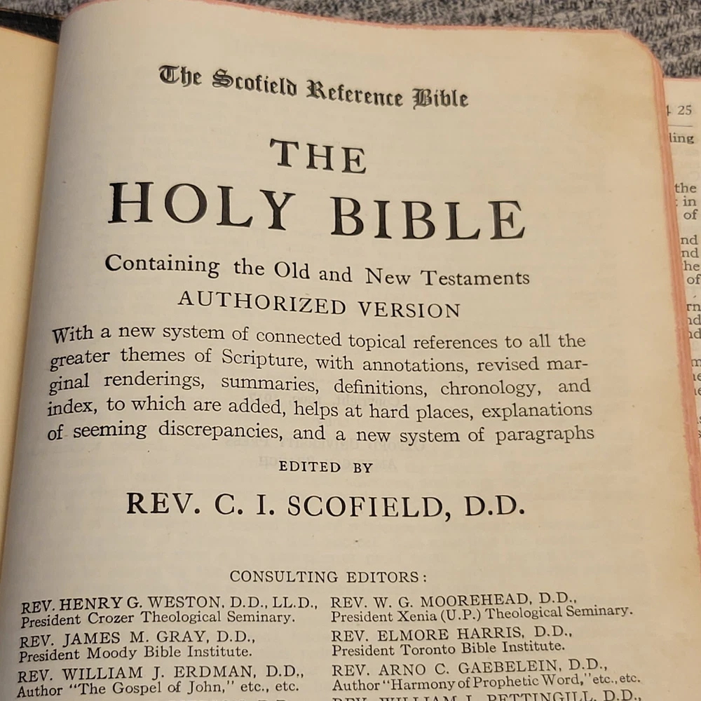 This 1917 edition Scofield Reference Bible, bound in black leather, offers a glimpse into historical scholarly interpretations of the Holy Scriptures. A collectible piece with handwritten notes and signs of age, it is a treasure for any bibliophile or religious historian. • Black leather binding • Authorized Version • Edited by Rev. C. I. Scofield • Published by Oxford University Press • Includes handwritten notes • New and improved edition *FLAWS: Loose binding, not completely separated Handwritten notes dated 1942, 1937, and 1948 Personalization stamped in gold on the front Edges and corners show wear... ~See all photos, and zoom in for full details