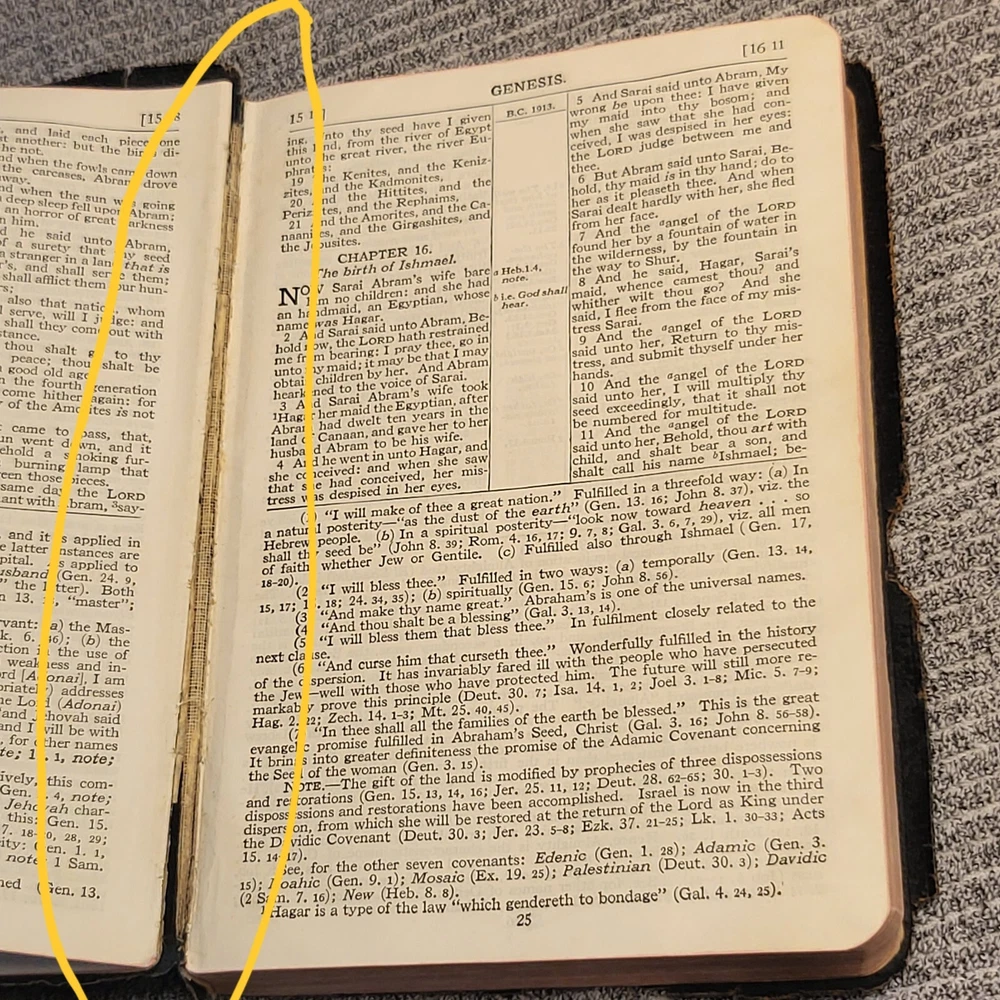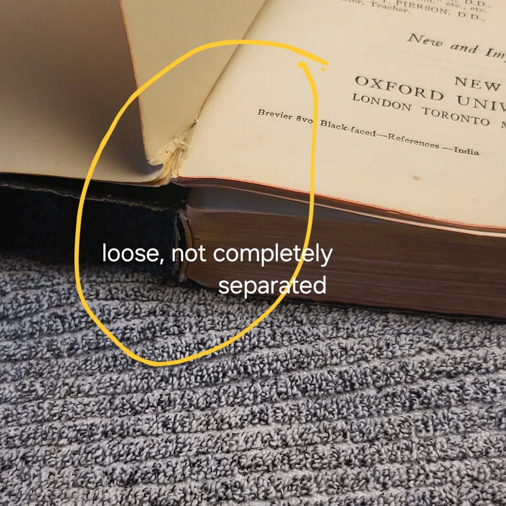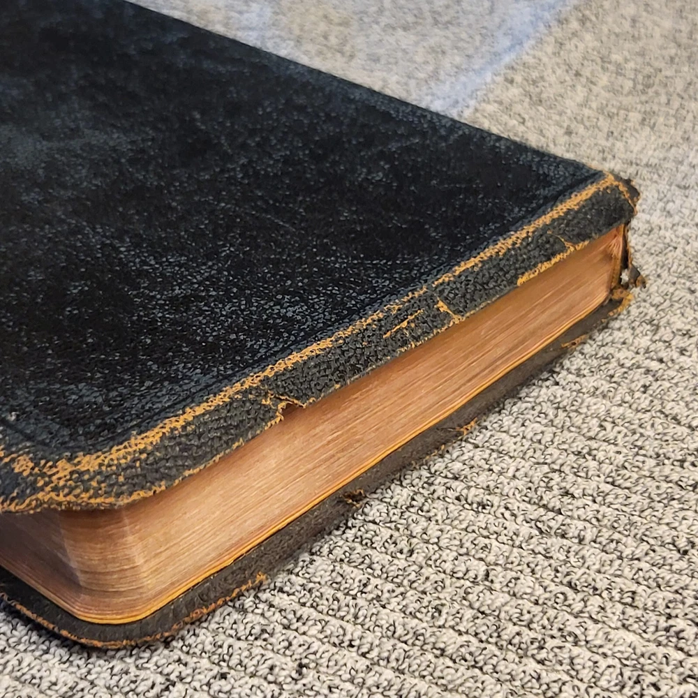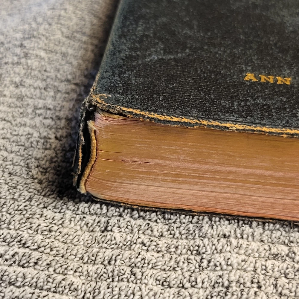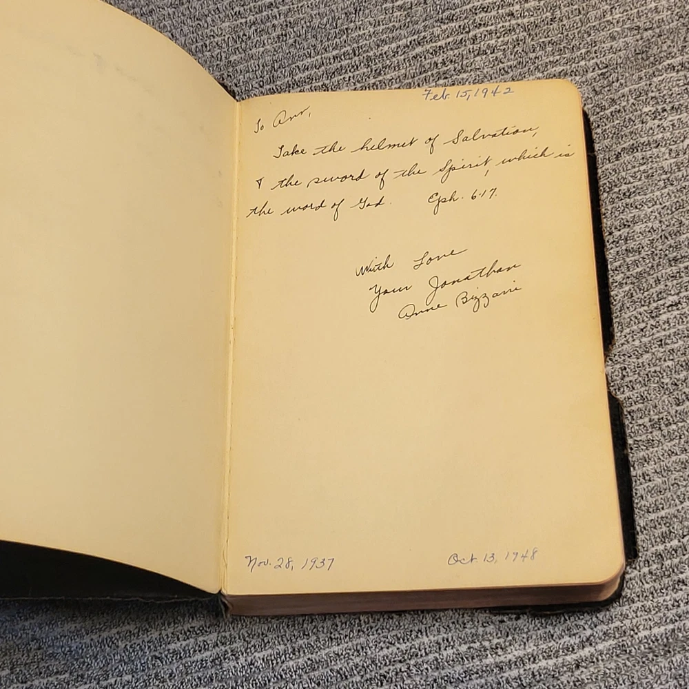 This 1917 edition Scofield Reference Bible, bound in black leather, offers a glimpse into historical scholarly interpretations of the Holy Scriptures. A collectible piece with handwritten notes and signs of age, it is a treasure for any bibliophile or religious historian. • Black leather binding • Authorized Version • Edited by Rev. C. I. Scofield • Published by Oxford University Press • Includes handwritten notes • New and improved edition *FLAWS: Loose binding, not completely separated Handwritten notes dated 1942, 1937, and 1948 Personalization stamped in gold on the front Edges and corners show wear... ~See all photos, and zoom in for full details