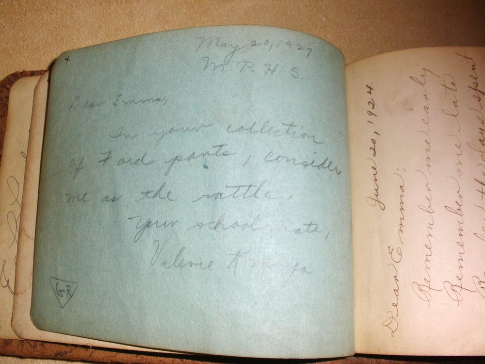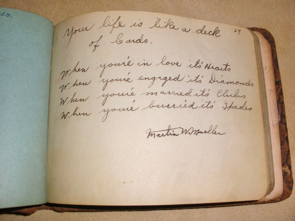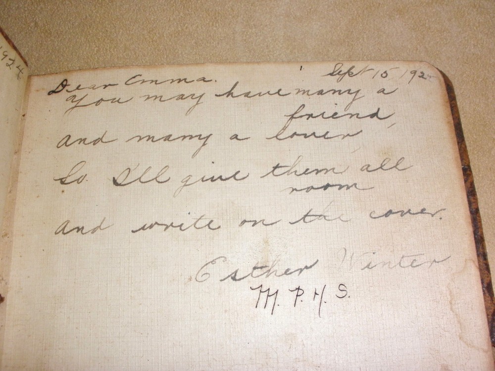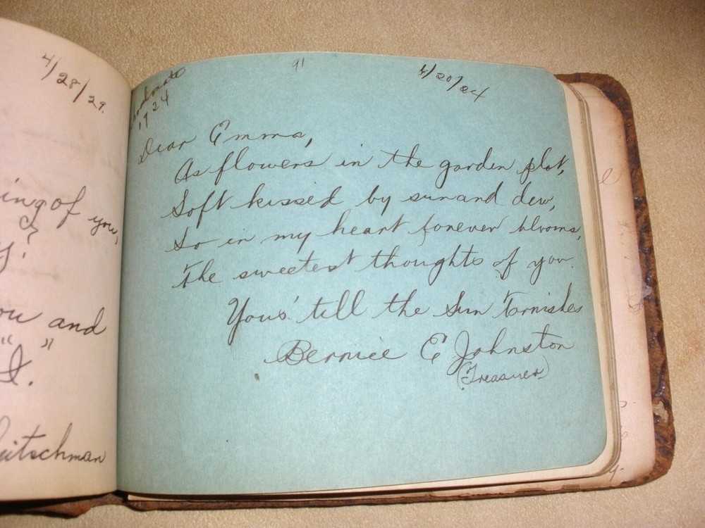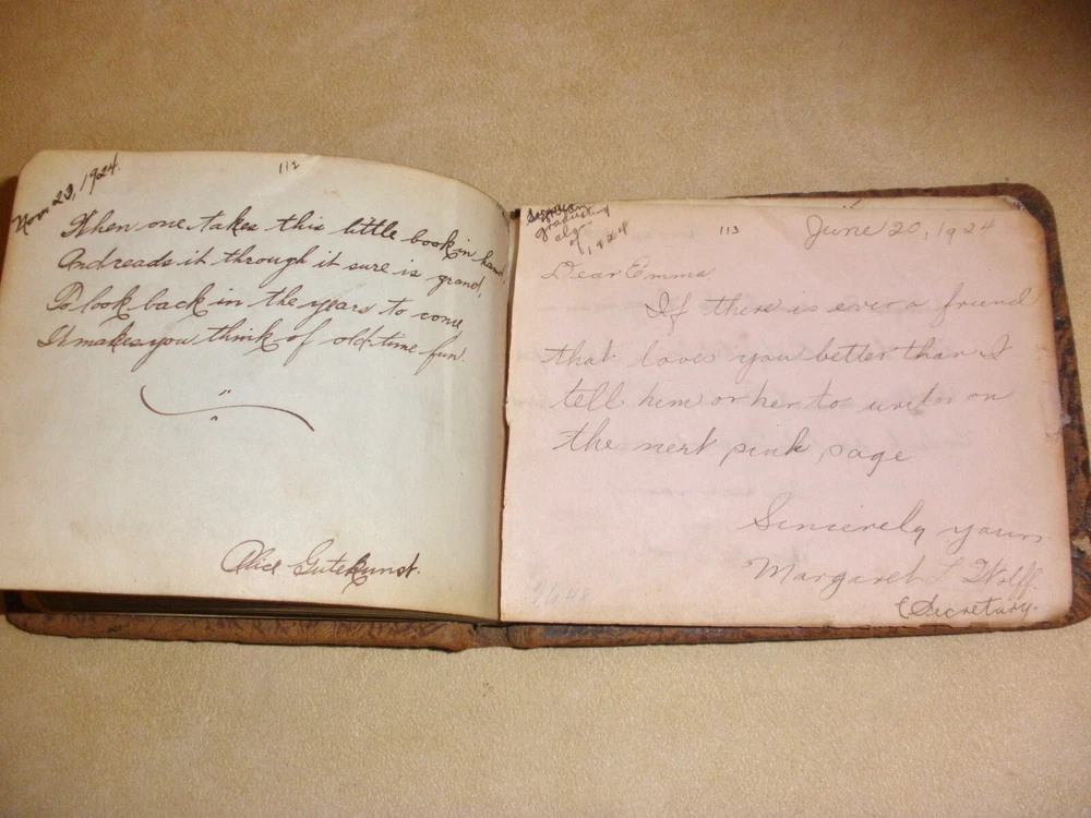 Hello, up for purchase is an antique leather autograph book. Every page has writing and dates ranging from varies years in the 1920's. The book measures 5 3/4 inches wide and is 4 1/2 inches tall. I'm guess there are 32 pages inside the book and they are signed on each side. The pages in side are well preserved. The leather is dry from storage and possibly changes in temperature over the last 100 years. It leaves a residue if left on fabric. Thanks for looking! Please check out the other items in my store. I am very flattered when someone wishes to purchase more than one item from my store. I will gladly combine shipping expenses. Please click on the "buy it now" button for each item desired, then request me to send you the total owed once you're finished. I will package the items and send an invoice based on the weight.