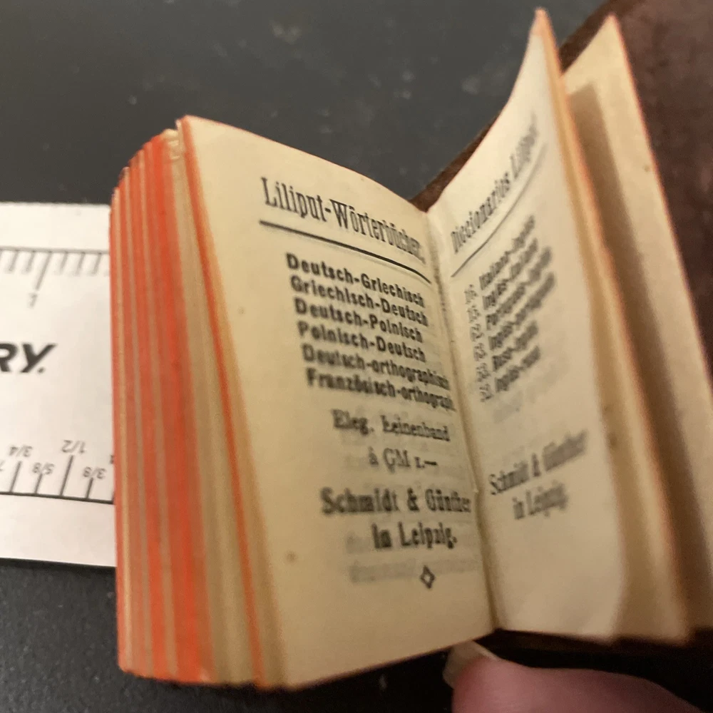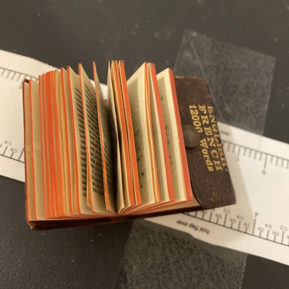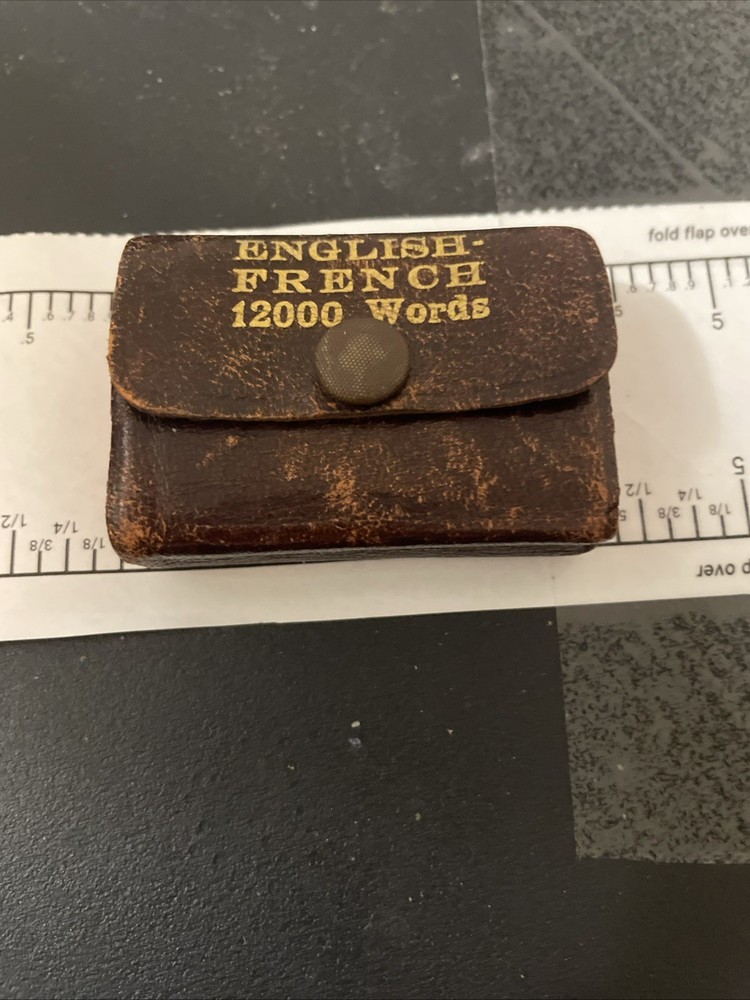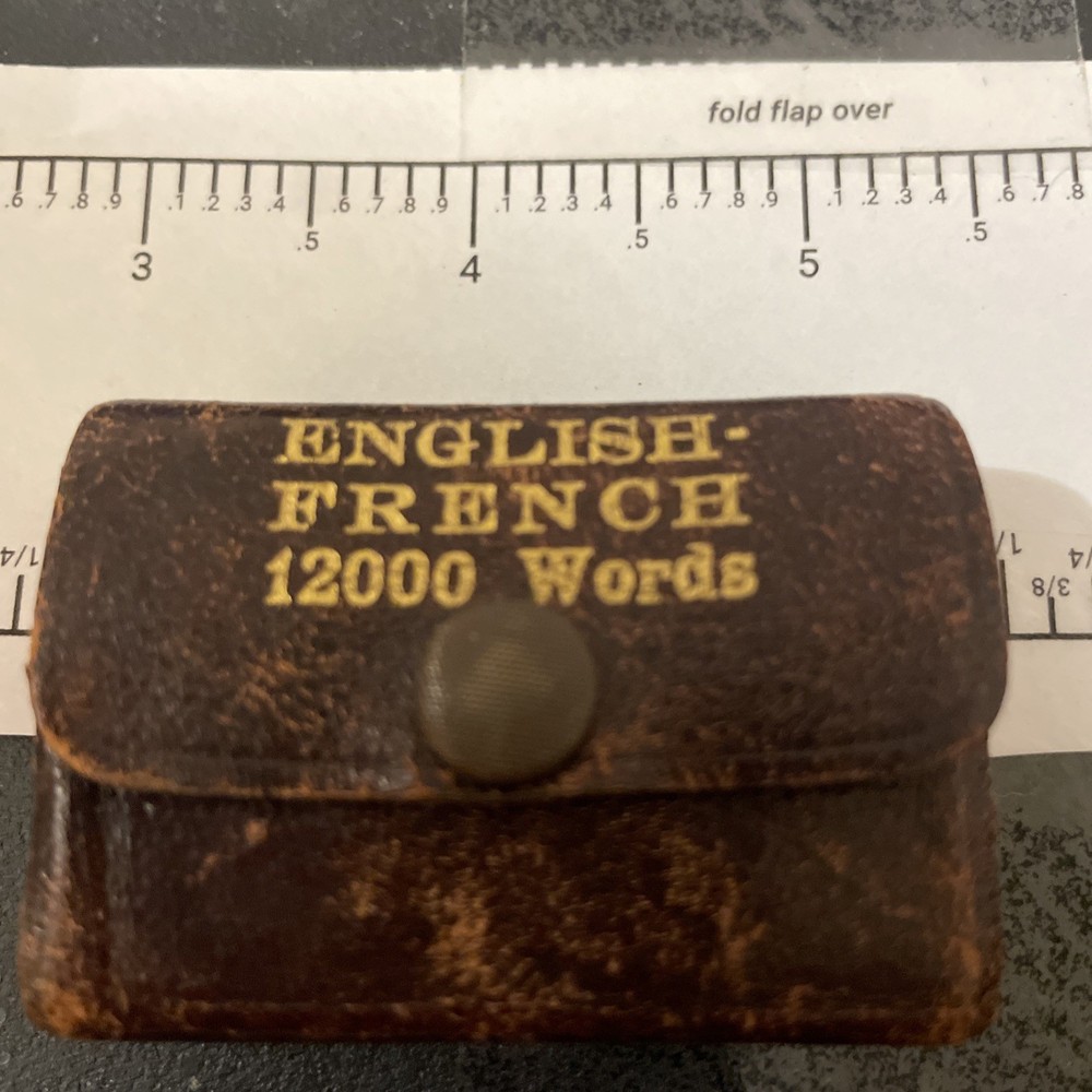 This antique dictionary is a miniature version of "The Little Webster" and contains 12,000 words in English and French. It was published in New York City by Miniature Dictionary Publisher and written by Dr. F.J. Wershoven. The binding is made of leather and the dictionary was originally published in Germany. This is a great collectible item for those interested in reference books and dictionaries.