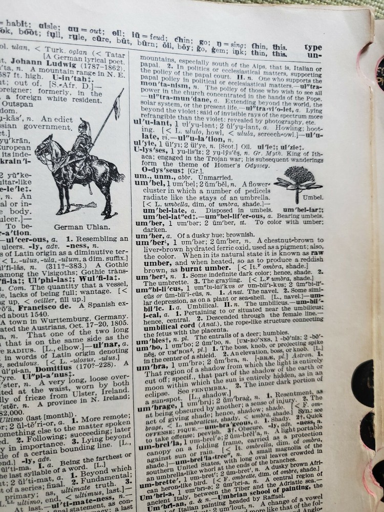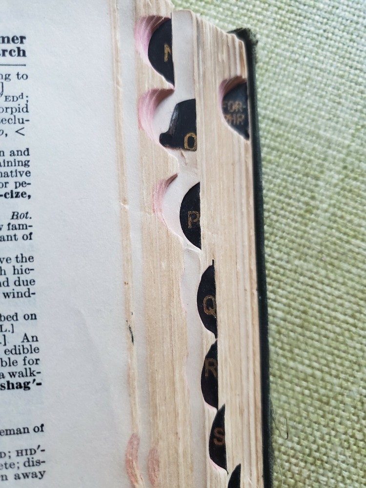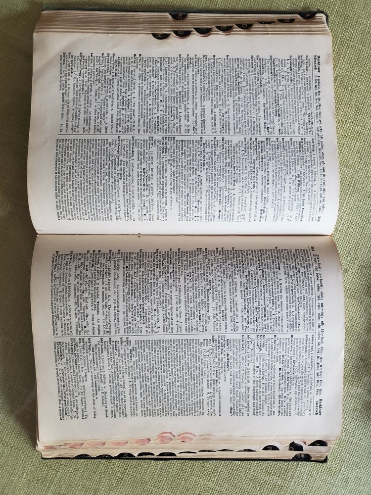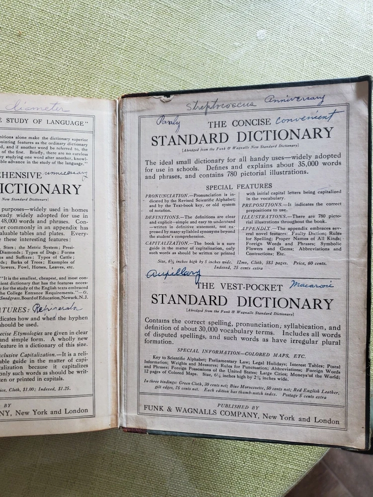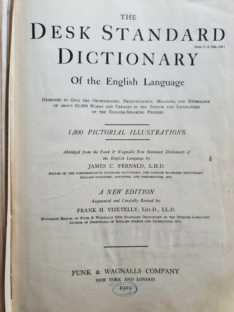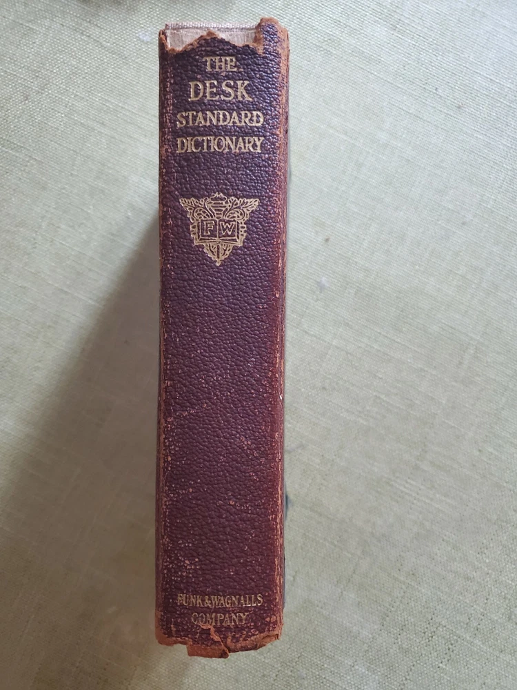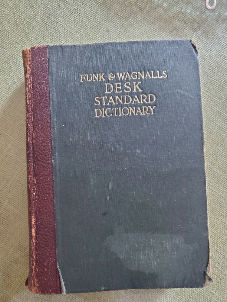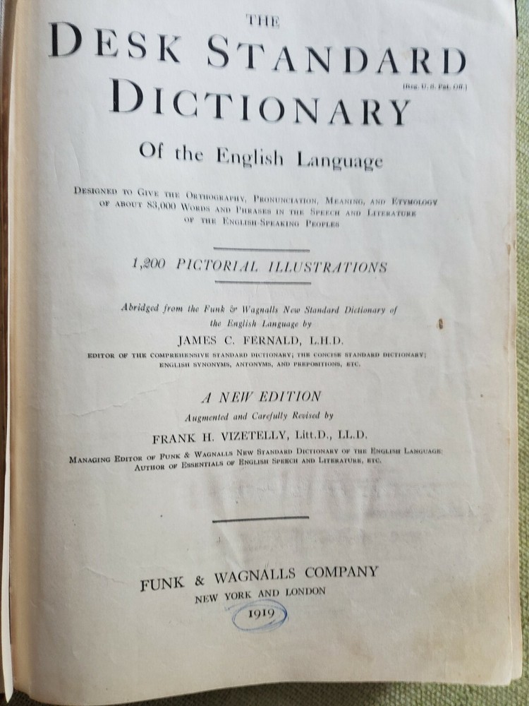 Unique Rare 1919 Standard English of the Language Dictionary - Funk and Wagnalls. Shipped with USPS Media Mail. A Standard Dictionary of the English Language” - Funk and Wagnalls - Publication 1919 “A standard dictionary of the English language upon original plans designed to give, in complete and accurate statement, in the light of the most recent advances in knowledge, and in the readiest form for popular use, the meaning, orthography, pronunciation, and etymology of all the words and the idiomatic phrases in the speech and literature of the English-speaking peoples” Published in New York by Funk & Wagnalls Company. This dictionary was "Prepared by more than two hundred specialists and other scholars" was published in 1919 The text in double column, illustrations in text, and appendix containing language key, publisher's statement on faulty diction, and an interesting list of words of disputed orthography and orthoepy, with citations. The covers are leather with embossed designs with marbled endpapers and is thumb-indexed. The pages are tight and all pages are mostly intact. The cover boards are scuffed. Several pages at the beginning and the end are worn, cracked and broken off but the body of the text is not affected. Contains some handwritings. See pictures.