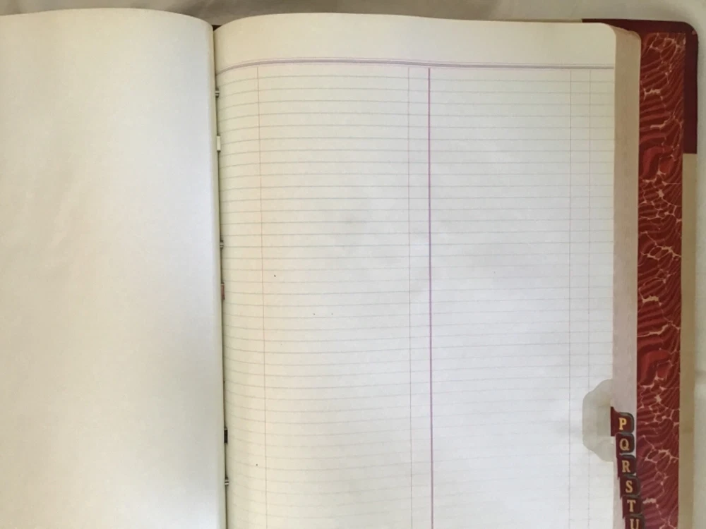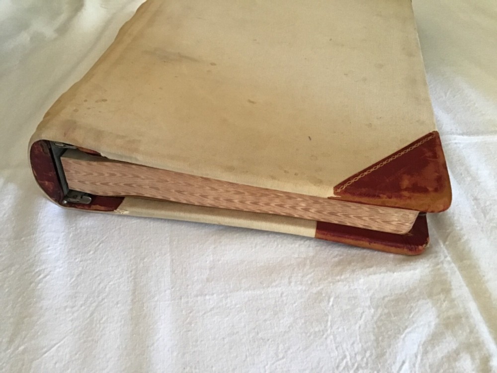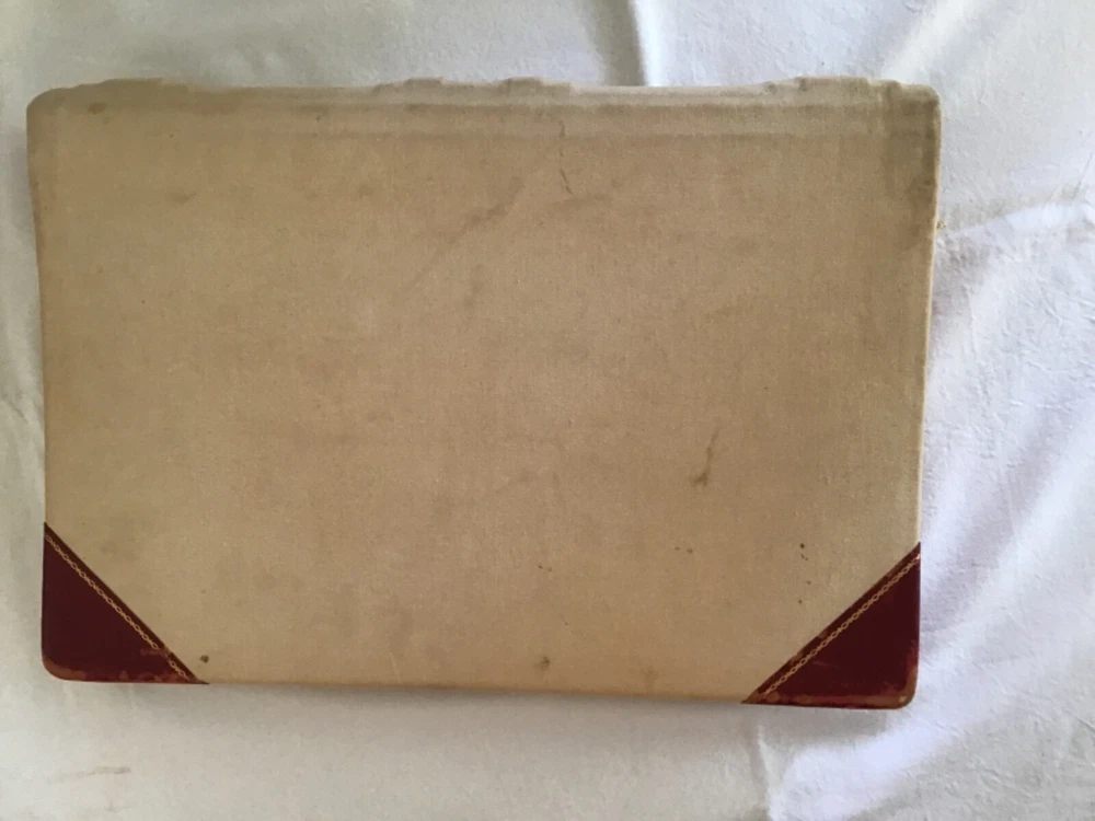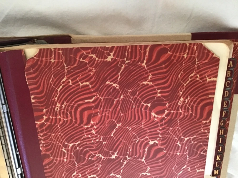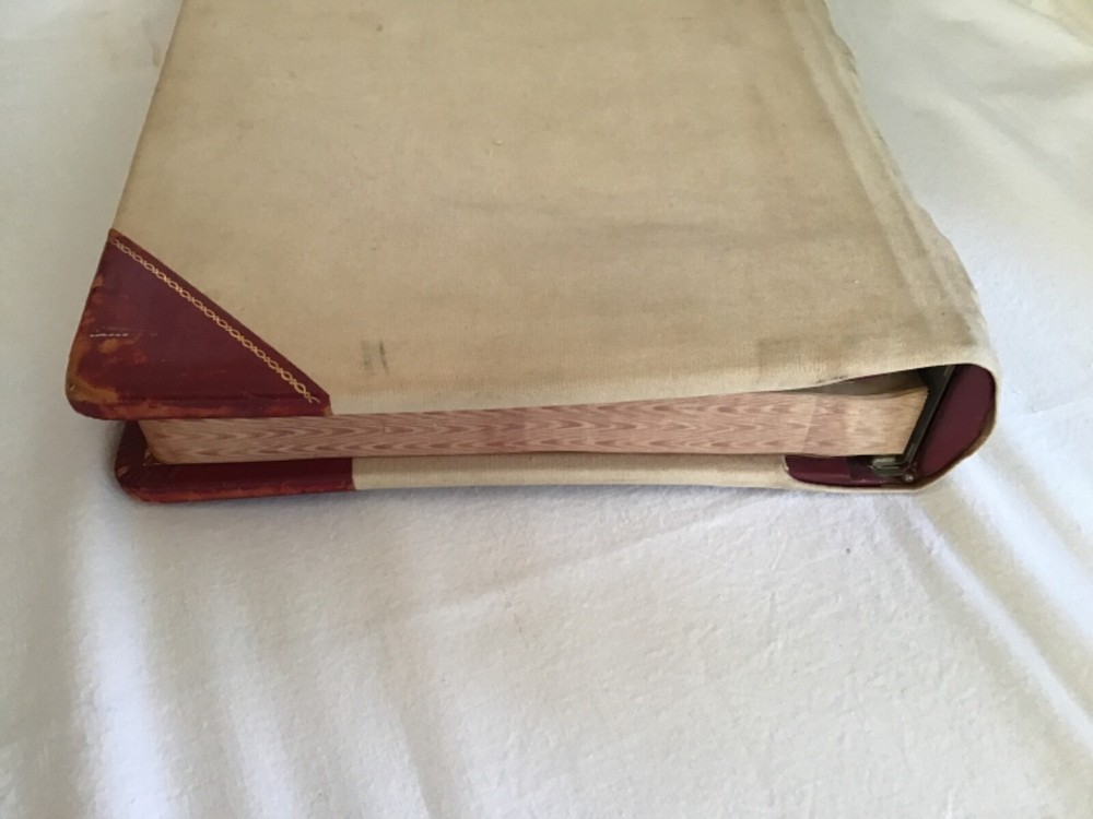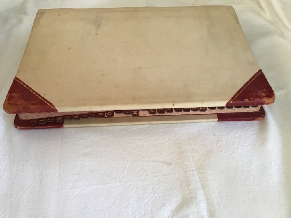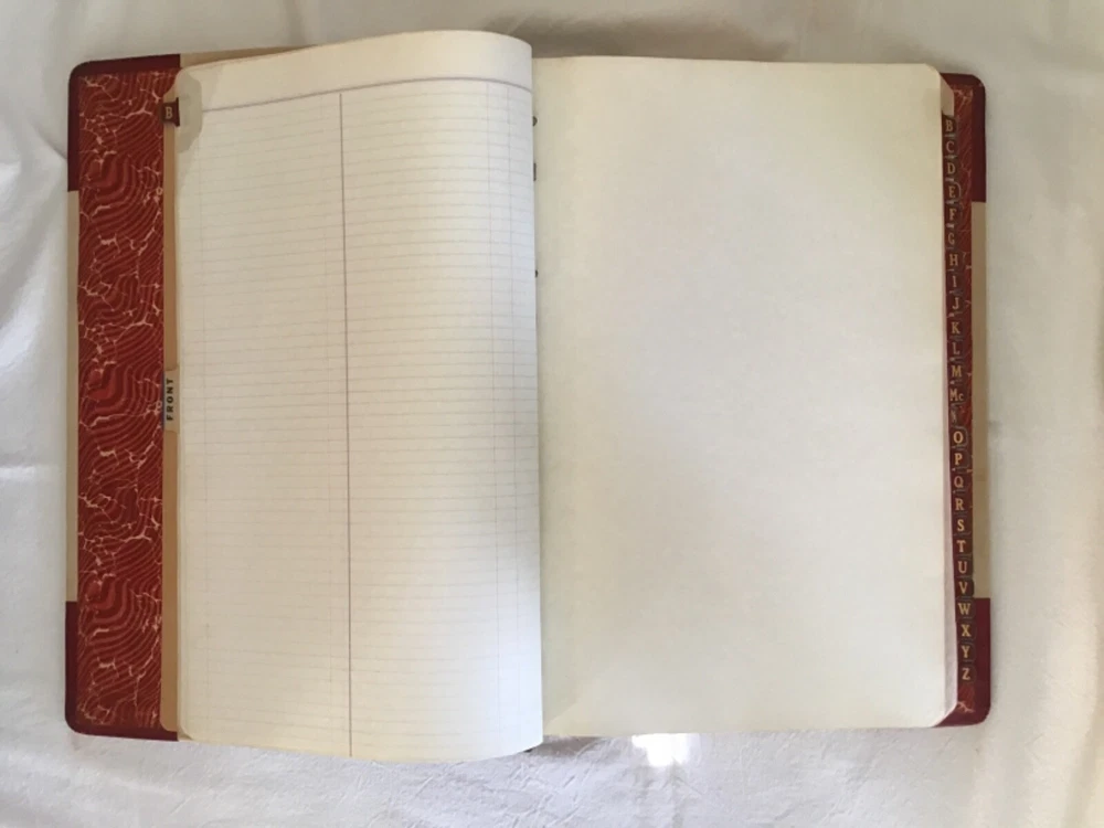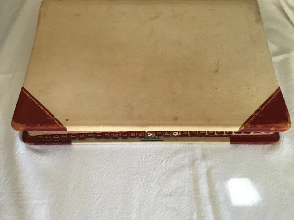 Very large and heavy old accounting / ledger / journal. Weight 17 pounds 9 ounces. Measures approximately 13" X 18.75" and 3" thick . Internal pages 11.5" X 18". Canvas cloth and red leather exterior cover. Alphabetical tabs. A few blank unlined pages for each letter tab and one lined page. Unsure of maker, a partial view of a label is visible under dust cover inside front cover. Metal spine for removing or adding pages. Condition is very good considering age and use. I have never removed the protective cover and have no idea what is underneath. Canvas cloth cover has soiling with scuffs and wear to the leather. One corner of the leather is worn through. Interior pages are clean and with no interior writing or marks. Metal spine is clean with no rust or corrosion. The letter " N " tab has the most wear/bend. All letter tabs are secure and intact. Please view carefully and use zoom options. Photos are considered an integral part of the description and condition statement. All items are from a clean, no pets, non smoking home. Also remember our items have been used. Items are not new. Please see measurements as some of the photos have been enlarged to show detail. Please ask questions if you have concerns. Thank you for looking and have a wonderful day.