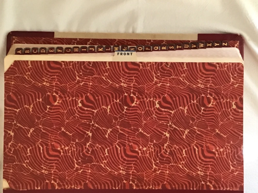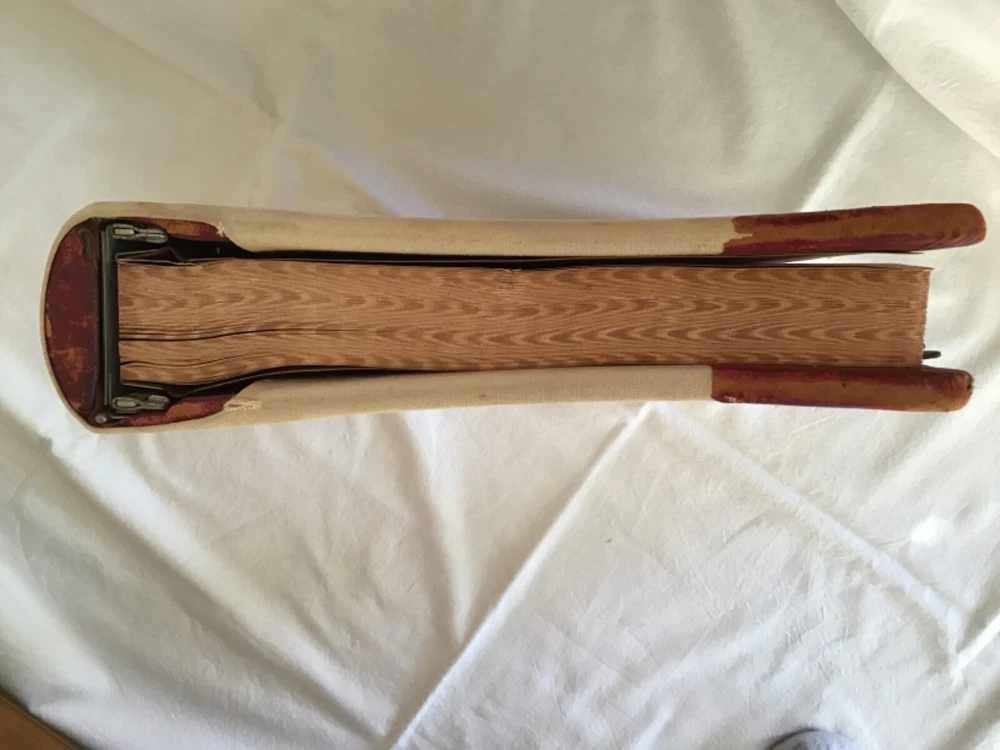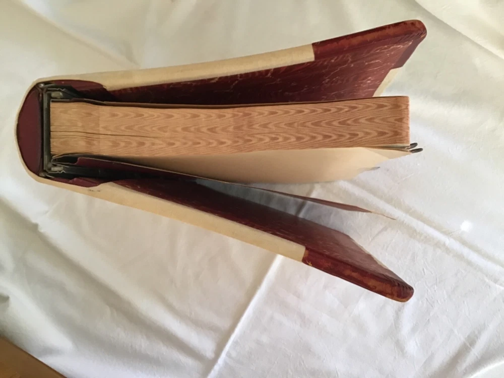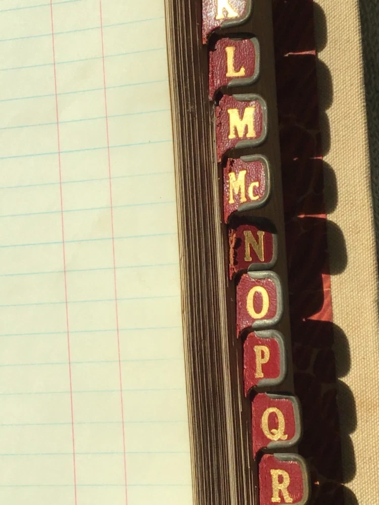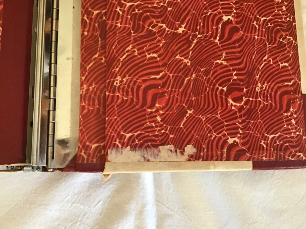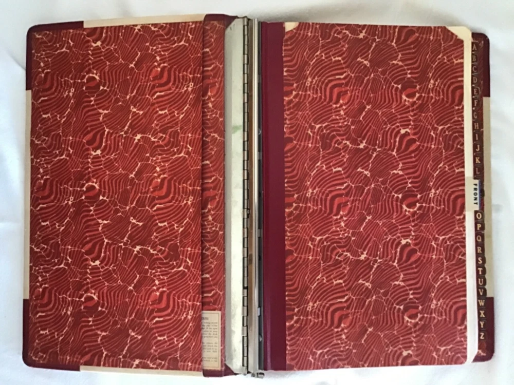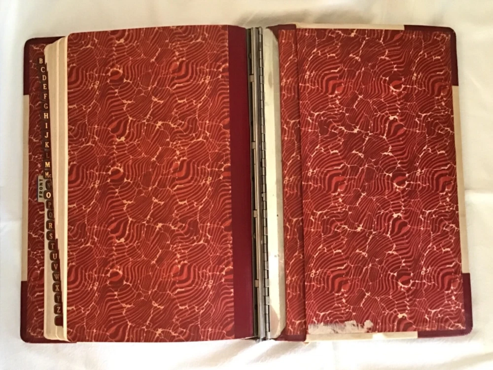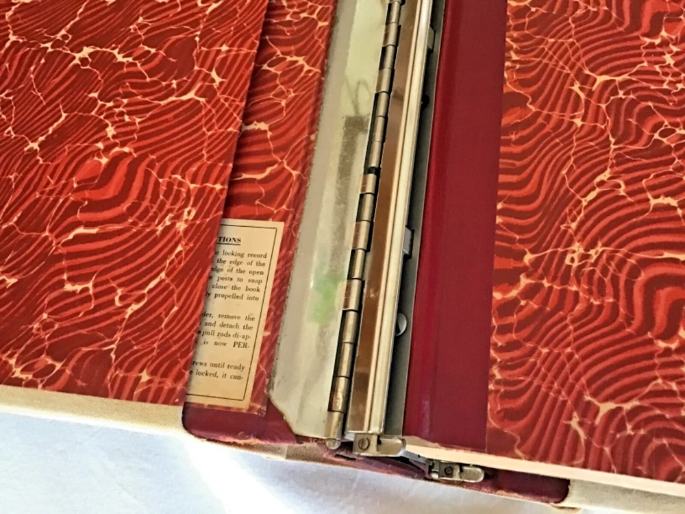 Very large and heavy old accounting / ledger / journal. Weight 17 pounds 9 ounces. Measures approximately 13" X 18.75" and 3" thick . Internal pages 11.5" X 18". Canvas cloth and red leather exterior cover. Alphabetical tabs. A few blank unlined pages for each letter tab and one lined page. Unsure of maker, a partial view of a label is visible under dust cover inside front cover. Metal spine for removing or adding pages. Condition is very good considering age and use. I have never removed the protective cover and have no idea what is underneath. Canvas cloth cover has soiling with scuffs and wear to the leather. One corner of the leather is worn through. Interior pages are clean and with no interior writing or marks. Metal spine is clean with no rust or corrosion. The letter " N " tab has the most wear/bend. All letter tabs are secure and intact. Please view carefully and use zoom options. Photos are considered an integral part of the description and condition statement. All items are from a clean, no pets, non smoking home. Also remember our items have been used. Items are not new. Please see measurements as some of the photos have been enlarged to show detail. Please ask questions if you have concerns. Thank you for looking and have a wonderful day.