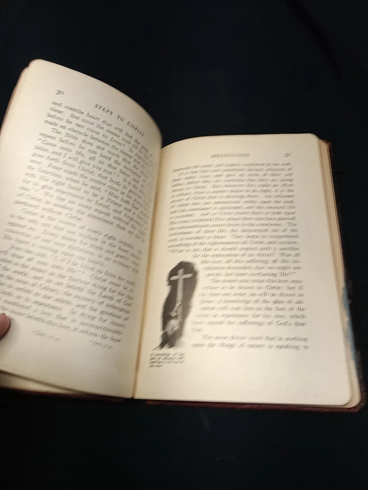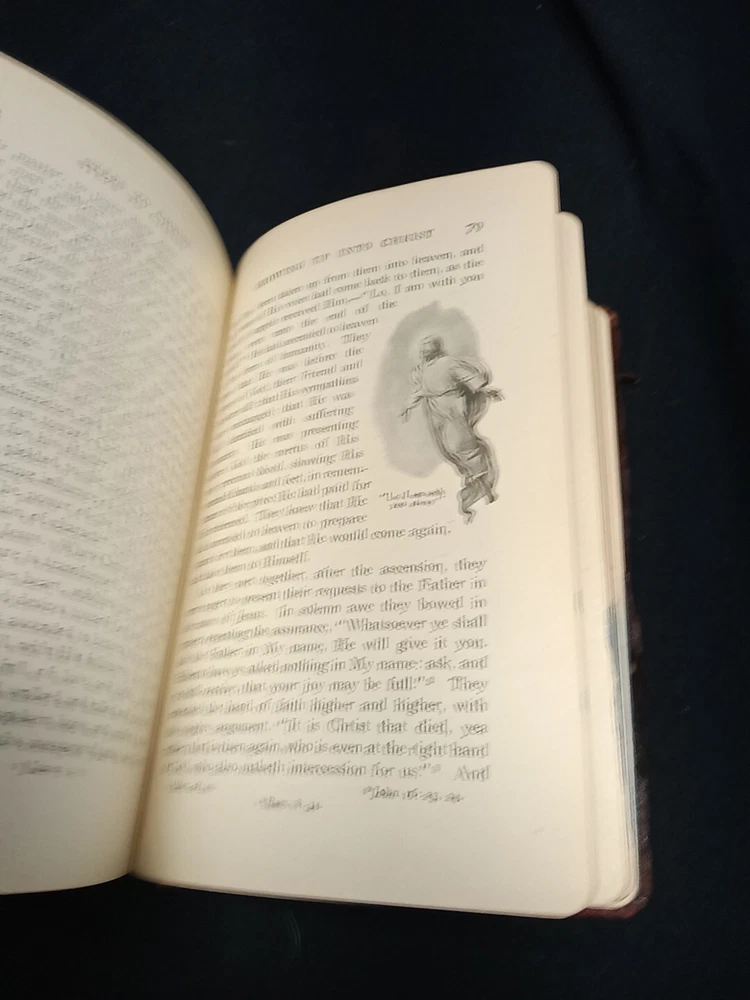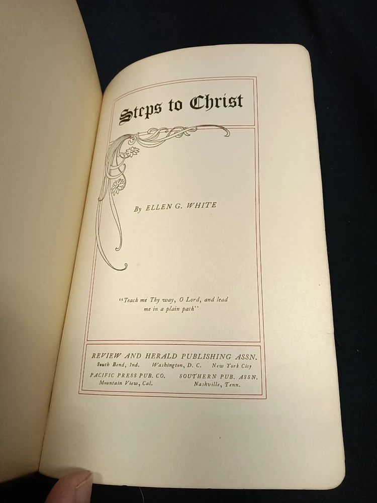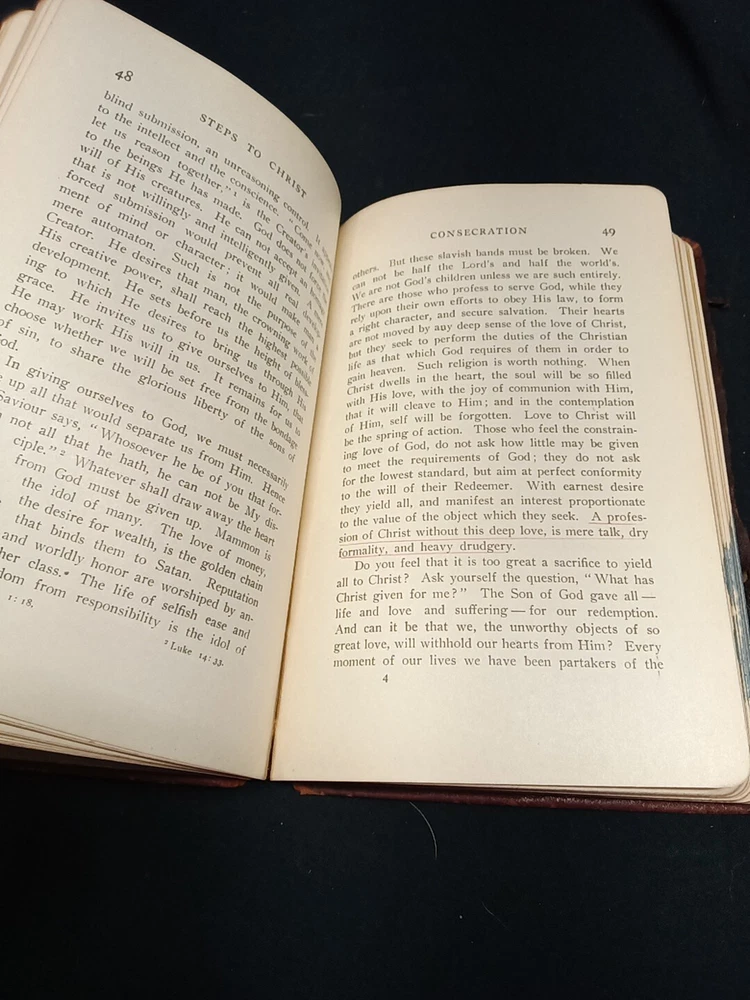 This antique book titled "Steps to Christ" was written by Ellen G. White and published by Review and Herald Publishing in Washington D.C. in 1908. It features a leather binding and is illustrated with special attributes. The book covers the topic of religion, specifically focusing on Jesus Christ. It is an original copy and was not modified in any way. Besides being a collectible item, this book serves as a great read for anyone interested in religious literature. The text is in English and there is no indication that it was ever used as a textbook. The book is in good condition and is not signed by the author. Own a piece of history by adding this rare, original copy of "Steps to Christ" to your collection today.