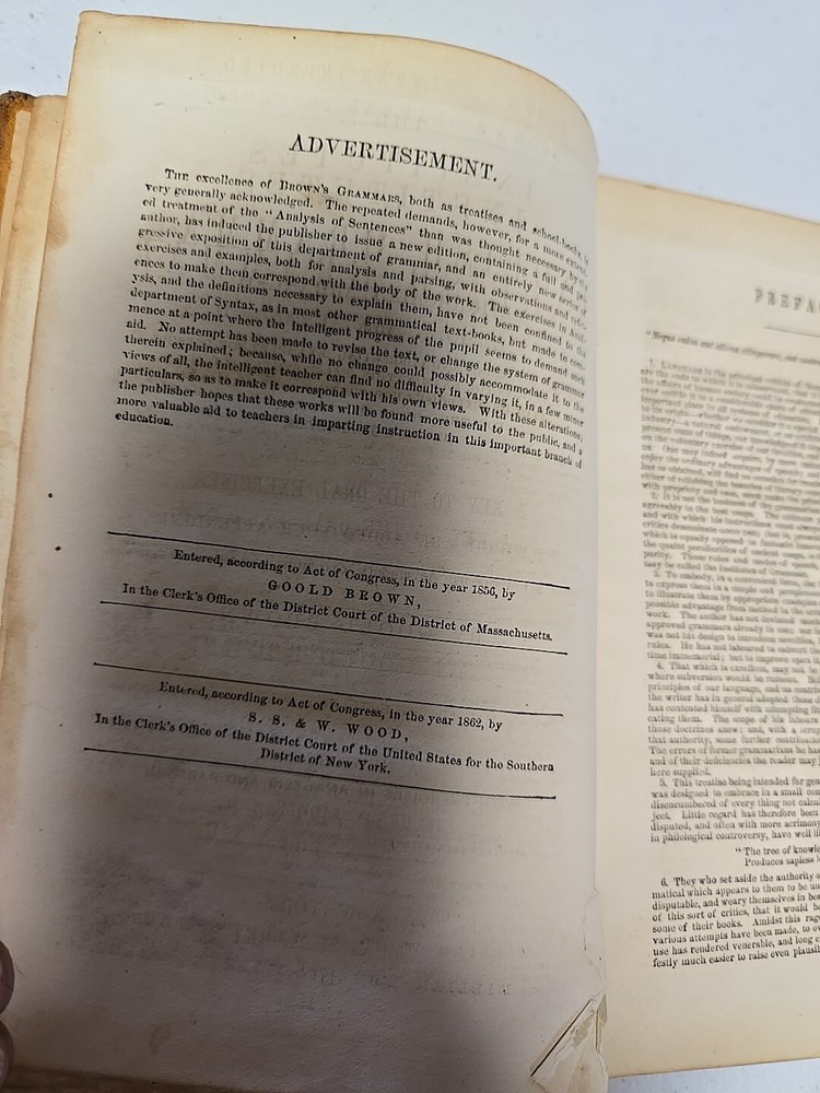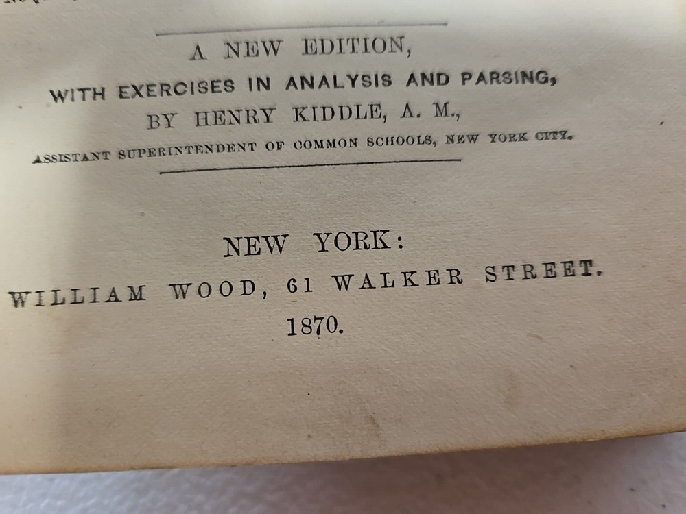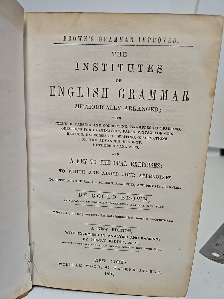 Antique The Institutes of English Grammar by Goold Brown Copyright 1870 Language Study Always check out photos for more info on details I AM NOT A PHOTOGRAPHER! Please check out my other sales. Most items I get came from yard sales, Goodwill/Thrift stores and Auctions. I try to list any flaws I see. I definitely am not perfect. If I miss anything of MAJOR proportions, I will definitely make it right. Please note, all of these items are used unless noted. I like to say · I know a lot about a little · I know a little about a lot · I know Everything about NOTHING!