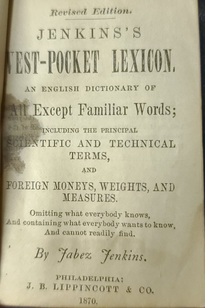 Antique 1870 Jenkins's Tiny Vest -Pocket Lexicon English Dictionary, USA This antique vest-pocket lexicon English dictionary from 1870 features a leather binding and is a miniature reference book published by J.B. Lipincott & Co. in Philadelphia, PA. The dictionary has a flap insert. Authored by Jabez Jenkins, this collectible item is a unique piece of American history, making it a valuable addition to any book collection of antique libraries. This dictionary is 155 years old. Due to age and wear, it is in Fair condition, the bind is worn with stitches showing and coming off the bind, piece of leather is worn, missing piece of leather in front, and stain on the first two pages. Have to handle dictionary with care. Please see pictures above. The dictionary is 3" H x 2" W x 0.75" D